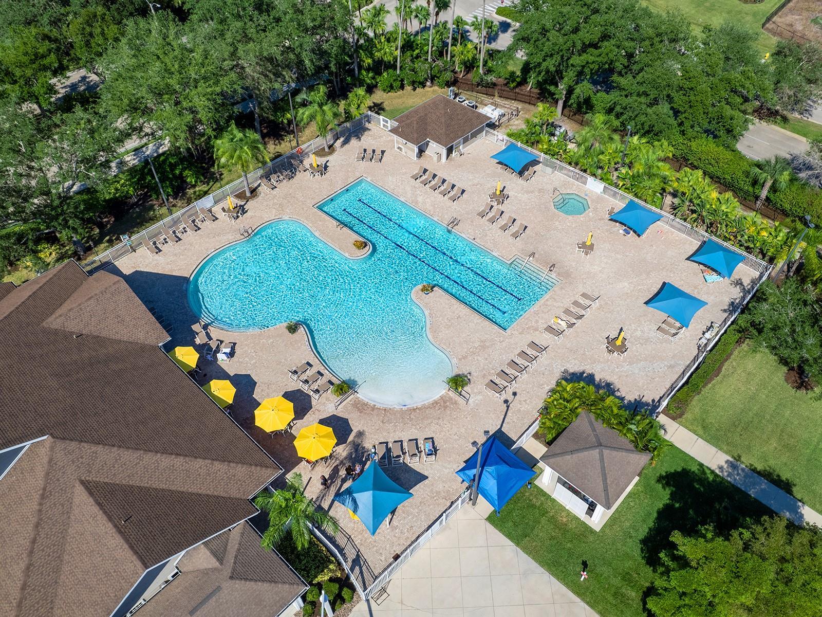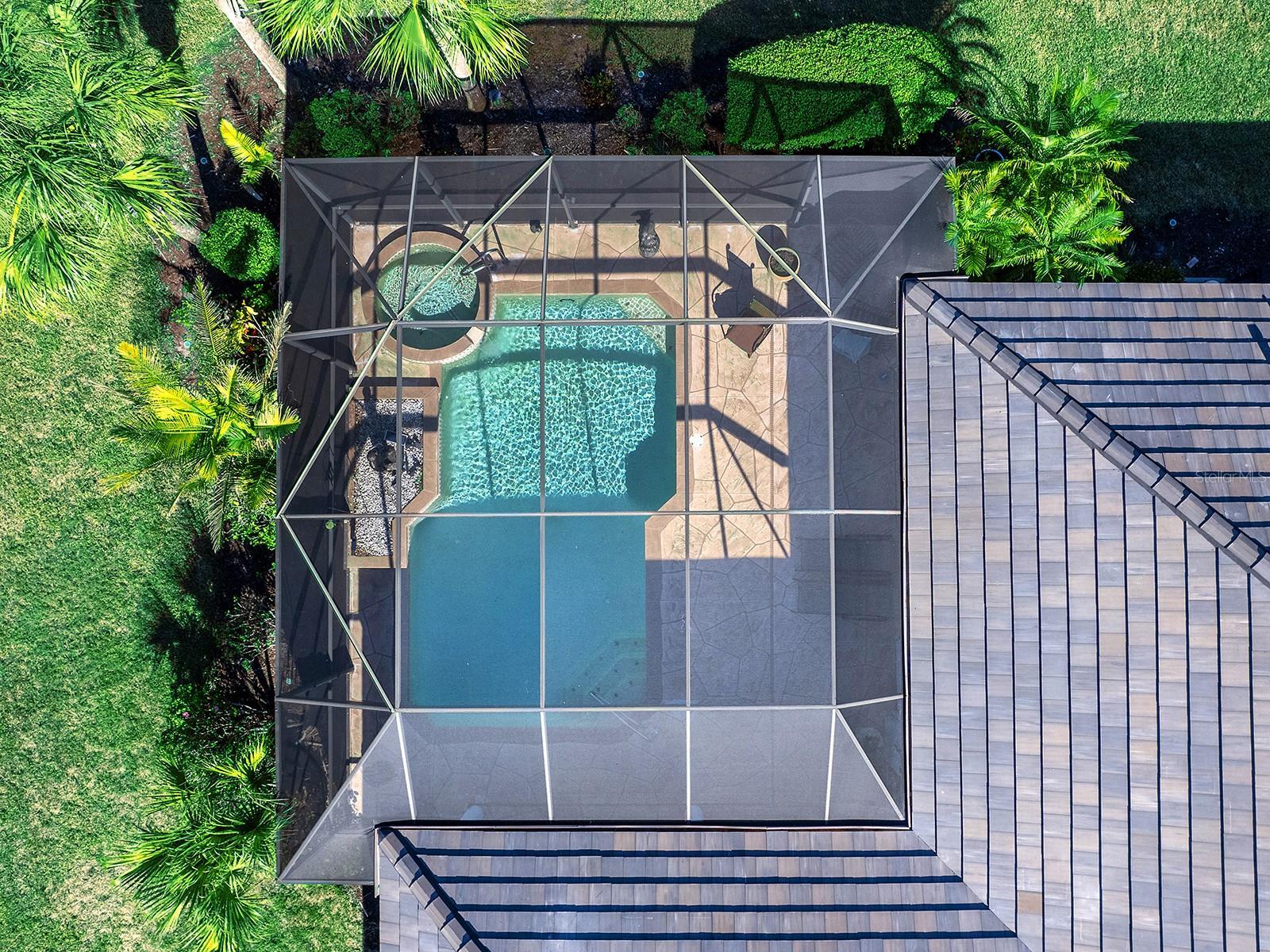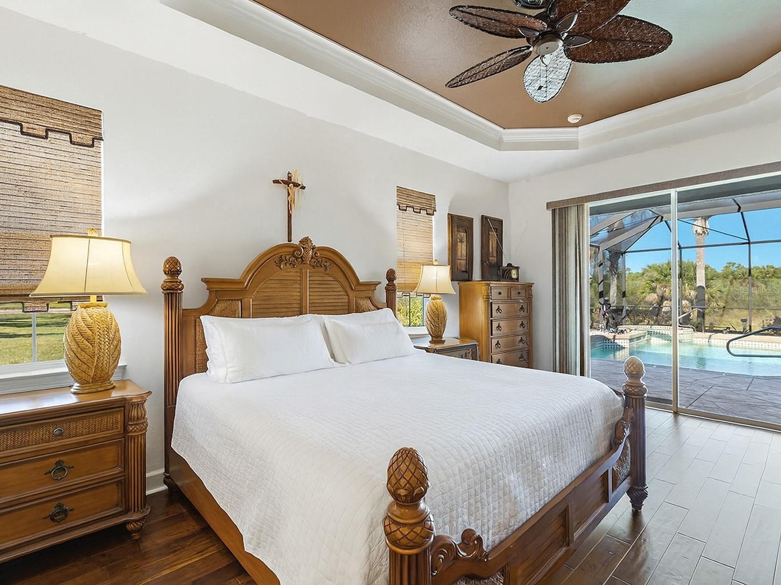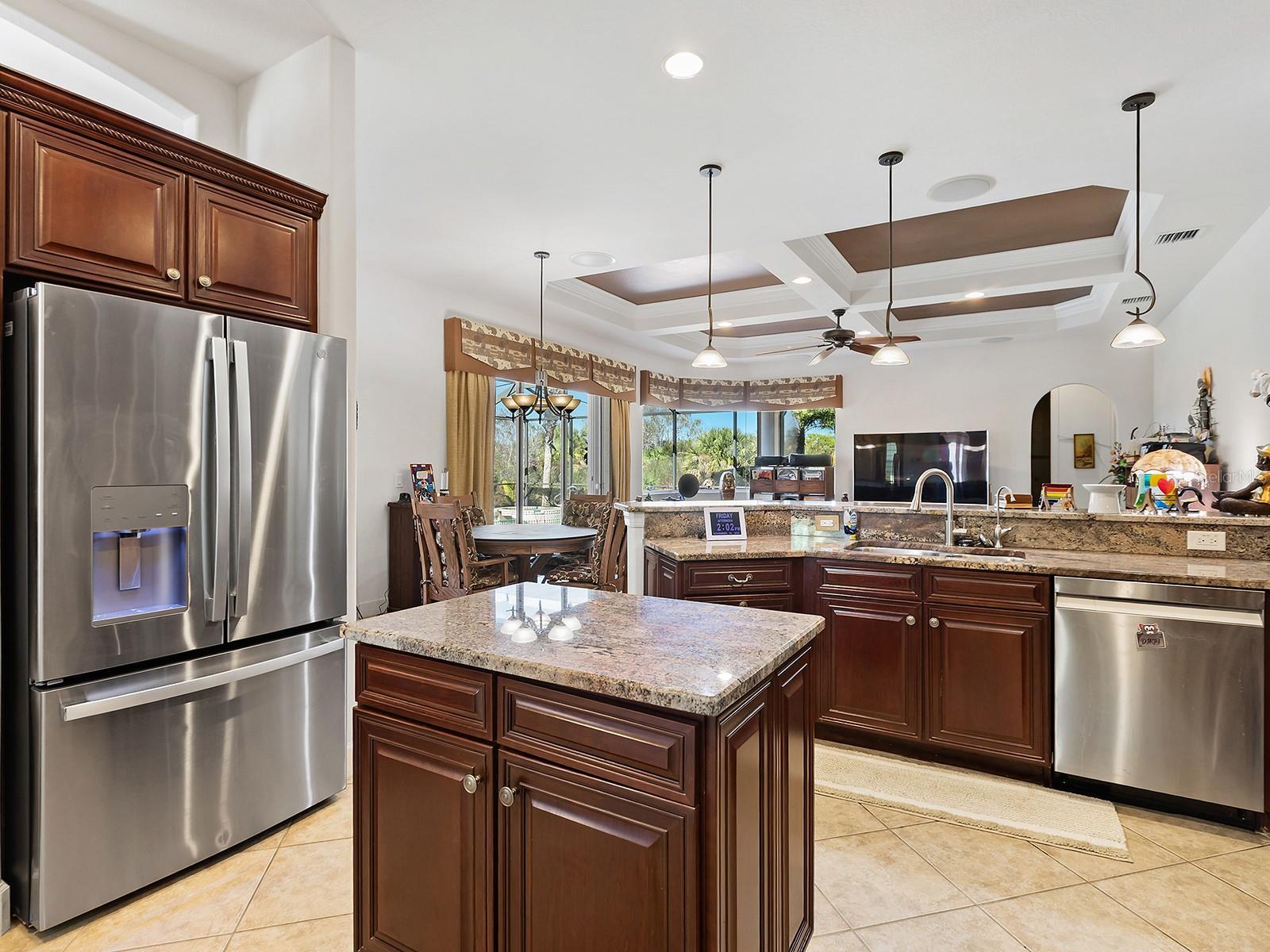 One or more photo(s) has been virtually staged. On a cul-de-sac in the desirable Westport Ridge neighborhood of Riverwood, this elegant estate home offers privacy, space and access to world-class amenities. On nearly half an acre, this 2,569-square-foot home features three bedrooms, a flexible office that may serve as a fourth bedroom and three full baths. The spacious primary suite includes walk-in closets and a luxurious en-suite bath with soaking tub and separate shower. Sliding glass doors open directly to the lanai, offering tranquil views of the wooded backyard and private pool. A formal living room provides direct access to outdoor entertaining, while the family room showcases coffered tray ceilings and natural light throughout. The kitchen is designed for function and form, featuring stainless appliances, a double oven, granite countertops, an island, a built-in desk, a breakfast bar and a generous pantry. A separate dining room and eat-in kitchen nook provide multiple options for gathering. Interior enhancements include tile flooring in the main areas, an indoor laundry room and a third bath with convenient pool access. The outdoor living space features a screened lanai with two covered areas ideal for entertaining or future enhancements, such as an outdoor kitchen. The home also includes a new roof (2025), new air-conditioning system (2024) and hurricane shutters for all windows. The two-car garage is complemented by a paver driveway. As part of Westport Ridge in Riverwood, residents enjoy included lawn care and access to premier amenities such as a 24-hour fitness center, resort-style pool, Har-Tru tennis courts, pickleball, bocce ball, dog park and a full-time activities director. Optional golf memberships are available.