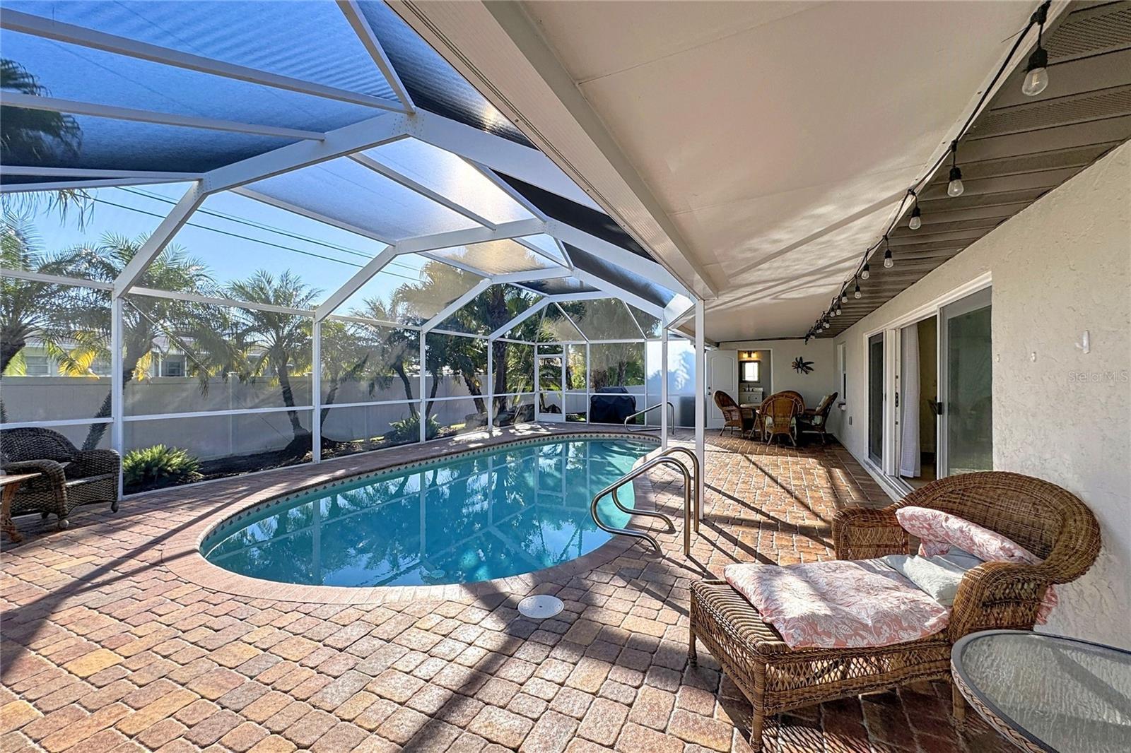 Welcome to Golden Beach, one of Venice Island’s most sought-after neighborhoods - the name truly says it all. This community offers its own private beach access and places you just moments from the heart of downtown Venice, giving you the perfect blend of coastal living and convenience. Before admiring the beauty of the home itself, take a look at the extensive list of updates: Paver Sealing (2025), Refrigerator (2025), Washer & Dryer (2025), Dishwasher (2025), Pool cage screening (2022), Fence (2023), Paver driveway (2021), 10 impact-rated windows, doors, and sliders (2022), Front paver porch (2021), HVAC – 4-ton system (2024), Water heater (2025), Plumbing (2013), 6 ft. vinyl fence (2013), New tile roof (2013) with a 2024 four-point inspection. The professionally landscaped and fully fenced yard creates a private, tropical retreat. Step through the front door and you’re greeted by an inviting, open layout filled with natural light—ideal for both quiet evenings at home and hosting guests. Tile floors throughout offer a clean look and effortless upkeep. The kitchen, dining area, and family room all overlook the heated, screened-in pool. The lanai features an insulated roof, making the space enjoyable year-round, rain or shine. Lush landscaping around the pool adds a true resort feel, and the convenient pool bath with shower is an added bonus. The split floor plan places the spacious primary suite on one side of the home and the guest bedrooms on the other, giving everyone privacy. The home also includes a two-car garage and paver walkways that lead to the front entrance and mailbox. You’re about a mile from the Venice Fishing Pier, Sharky’s, the dog beach, and the charming shops, restaurants, and entertainment options in downtown Venice. Simply move in and start enjoying the Florida lifestyle the way it was meant to be. This is a home you’ll want to see in person—don’t miss it.