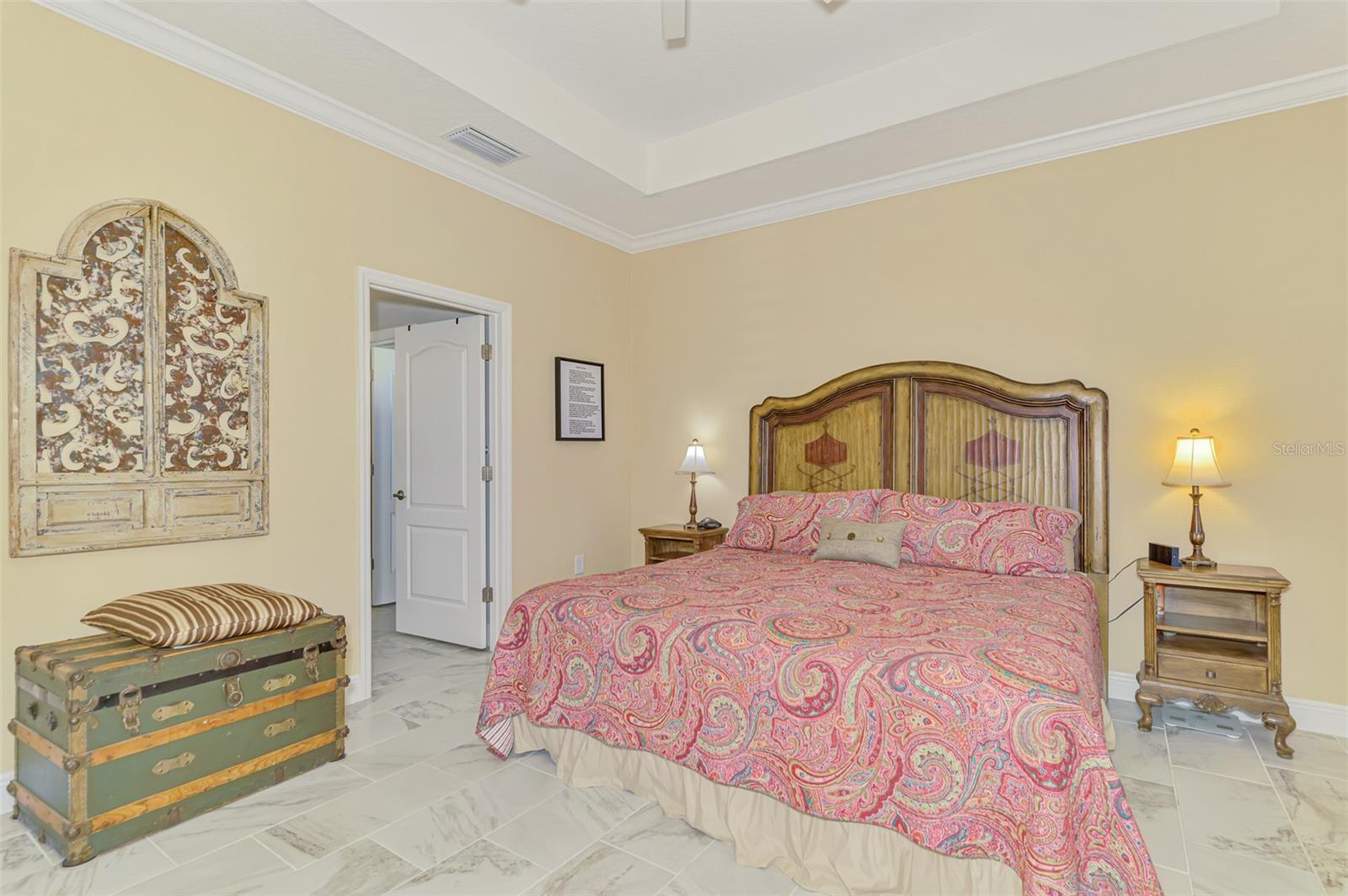 - Built-in Features, Ceiling Fans(s), Crown Molding, Eat-in Kitchen, High Ceilings, Kitchen/Family Room Combo, Living Room/Dining Room Combo, Open Floorplan, Primary Bedroom Main Floor, Split Bedroom, Stone Counters, Thermostat, Tray Ceiling(s), Walk-In Closet(s), Window Treatments