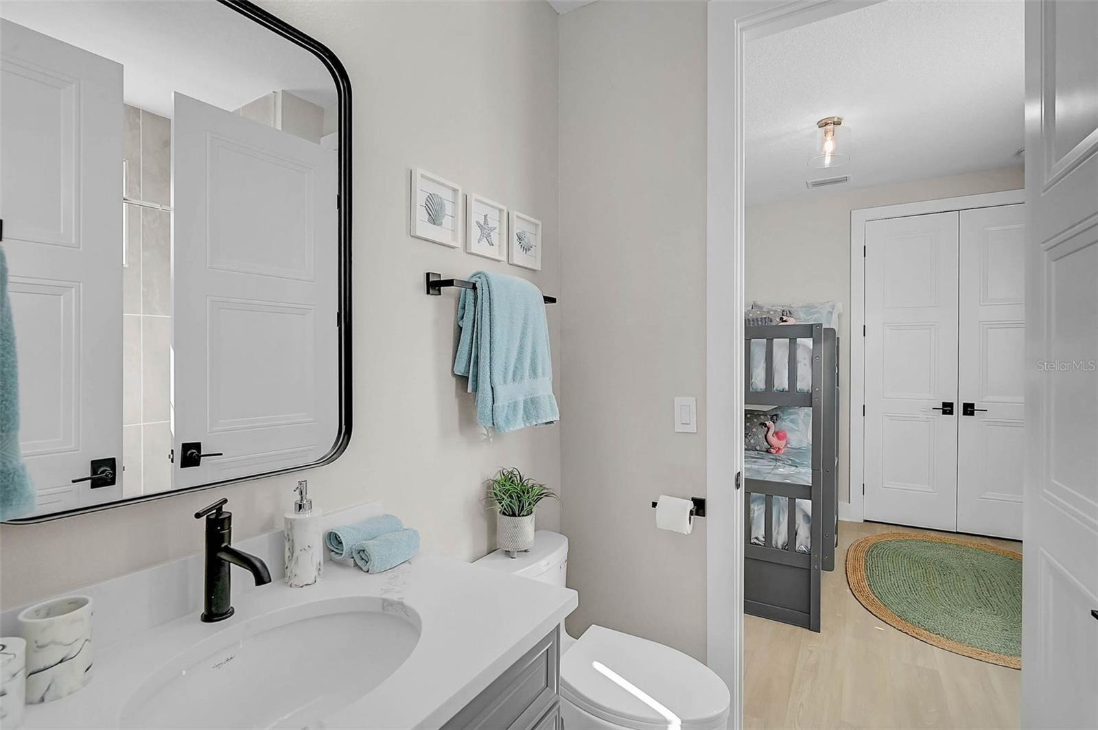 Stunning never-lived-in model home on one of the largest lots in Hunters Point, offering excellent privacy and expanded waterfront views just minutes from Anna Maria Island. Features include a heated finite-edge pool, deeded private dock suitable for approximately 25 ft vessels, and a three-stop elevator. The home is elevated 16 ft. According to the seller, the 2024 coastal water event did not impact the home, with water reported only reaching the top of the dock. Designed for high-efficiency living with PGT impact windows, enhanced insulation, solar power with Sonnen battery storage, multi-zone HVAC, tankless water heater, irrigation system, smart locks, and home automation. The main level features a bright open layout with wide-plank flooring, coffered and beadboard ceilings, plantation shutters, surround-sound wiring, and a quartz kitchen with shaker cabinets, stainless steel appliances, and a large island. Covered terraces extend indoor-outdoor living. The upper level includes a spacious primary suite with screened porch overlooking the canal and pool, a walk-in closet, and a bath with dual vanities and heated flooring. Two guest rooms—one with a screened porch—share a Jack-and-Jill bath. A full laundry room completes the upper level. Additional features include a two-car garage with epoxy flooring, outdoor lighting, irrigation, and smart-home connectivity. Multiple covered and screened terraces offer comfortable outdoor spaces throughout the home. Hunters Point is a gated, golf-cart-friendly community with private roads and a forthcoming clubhouse and resort-style pool. HOA dues of $550 per month include cable, internet, pest control, grounds maintenance, and irrigation water. Convenient to marinas, dining, nature parks, Cortez Village, and the beaches of Anna Maria Island. Furniture may be available separately.