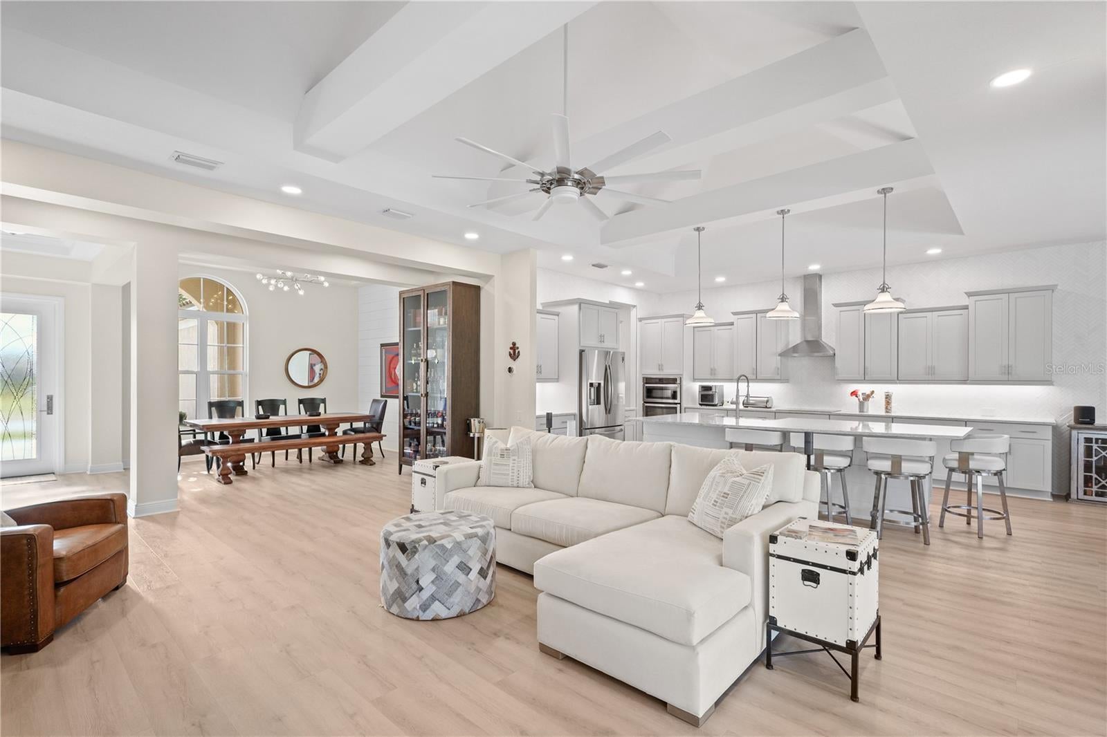Welcome to this stunning Sam Rodgers built Napoli executive style home located in the community of Gran Paradiso, Wellen Park Florida. This home is richly appointed with custom upgrades throughout. Light, bright, and airy, the residence features soaring cathedral ceilings and a fresh, modern color palette. Smart-home technology seamlessly controls the outdoor storm shutters, pool and spa, color-changing lighting, and interior temperature for effortless comfort. The spacious primary suite offers a serene retreat complete with a luxurious bath featuring a garden tub and a beautifully designed tech closet. The chef’s kitchen is a true showpiece, boasting custom wood cabinetry, quartz countertops, a convection oven, and a striking herringbone tile accent wall. Outdoor living is exceptional in this home. Step outside to an expansive brick-paver lanai showcasing a sparkling salt water pool and spa with a waterfall feature, along with a full outdoor kitchen—perfect for entertaining or simply relaxing in your private oasis. All this, combined with quality craftsmanship and thoughtful design, makes this home an extraordinary opportunity. Please see attachments for all upgrades like for example the tankless water heater, EV garage charging station and more. Sellers are also providing 1 full year of American Home Shield Warranty!