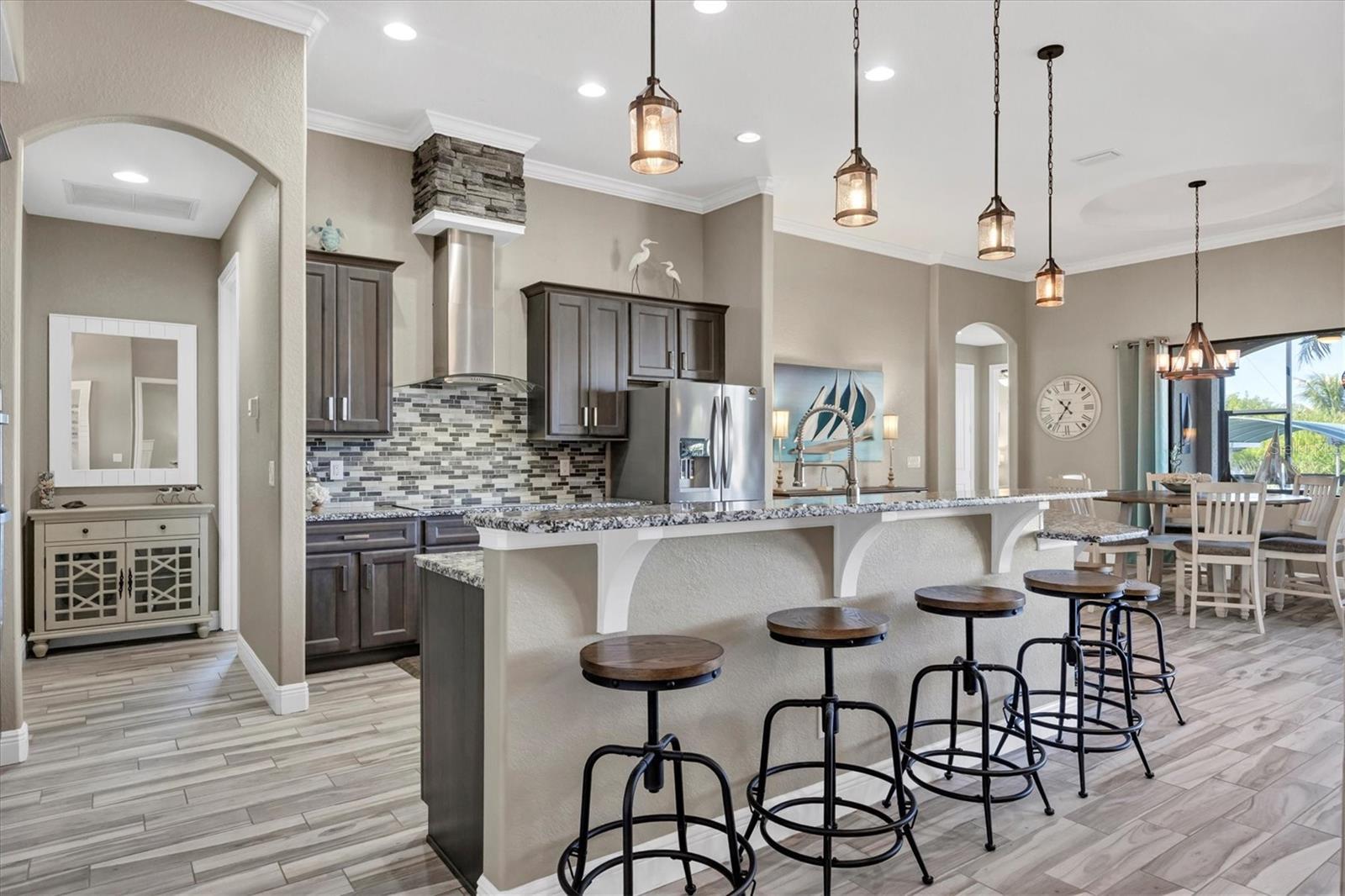 PRICE TO SELL! Don’t miss this rare opportunity to own a true piece of Florida paradise in the highly desirable Waterfront community of South Gulf Cove direct access to Golf. This move-in-ready, upgraded Waterfront Pool home, built in 2018 with a 3-car garage, offers an exceptional blend of luxury, comfort, and Florida lifestyle living. The bright, open-concept floor plan seamlessly connects the living room, dining area, and gourmet kitchen, making it ideal for everyday living and entertaining, hosting parties is a breeze with seating for 45 guests. Expansive 10’ zero-degree sliding glass doors fully open to the lanai, creating a seamless indoor-outdoor living experience. The chef’s kitchen features granite countertops, an undermount sink with retractable sprayer, sleek finishes, a large pantry, and a rare coat closet. The private primary suite offers 2 walk-in closets, peaceful water and pool views, and a dual-entry spa-style walk-in shower. Additional interior highlights include tray ceilings, crown molding, soaring 11’9” ceilings, and wood-plank ceramic tile flooring throughout. Outdoor living is a standout feature, with a heated saltwater pool offering a sundeck, shelf seating, fountain, and new pool pump (10/2025). The expanded lanai features raised ceilings, architectural arches, stacked-stone accents, three ceiling fans, and hurricane shutters, providing ample space for entertaining. The outdoor kitchen is fully equipped with a Bullet grill, wine refrigerator, range hood with backsplash, TV, and a fire pit overlooking the water. Boating amenities include a 10,000-lb boat lift with water and electric, new Waterway boat cover (2025), and a 10’ x 20’ Trex dock. Situated on a three-way canal intersection, the property offers excellent access for boating, kayaking, and paddleboarding. Additional features include a triple-wide paver driveway, slate tile roof, public water and sewer, hurricane-impact windows and shutters (front entry and lanai), Rain Bird irrigation system with new pump (10/2025), extra-tall pool cage (10’ sides, 14’ center), fenced dog run, queen palm landscaping with low-maintenance shell ground cover, outdoor shower, spacious garage with ToughBuilt cabinetry, and an indoor laundry room off the garage. Conveniently located just minutes from Boca Grande, offering access to world-class fishing, dining, shopping, and Gulf beaches. This property truly captures the best of Florida waterfront living.