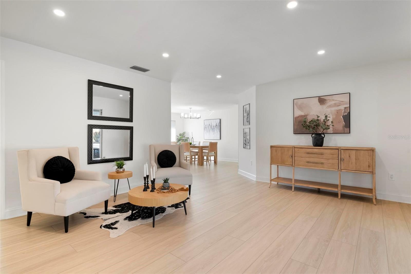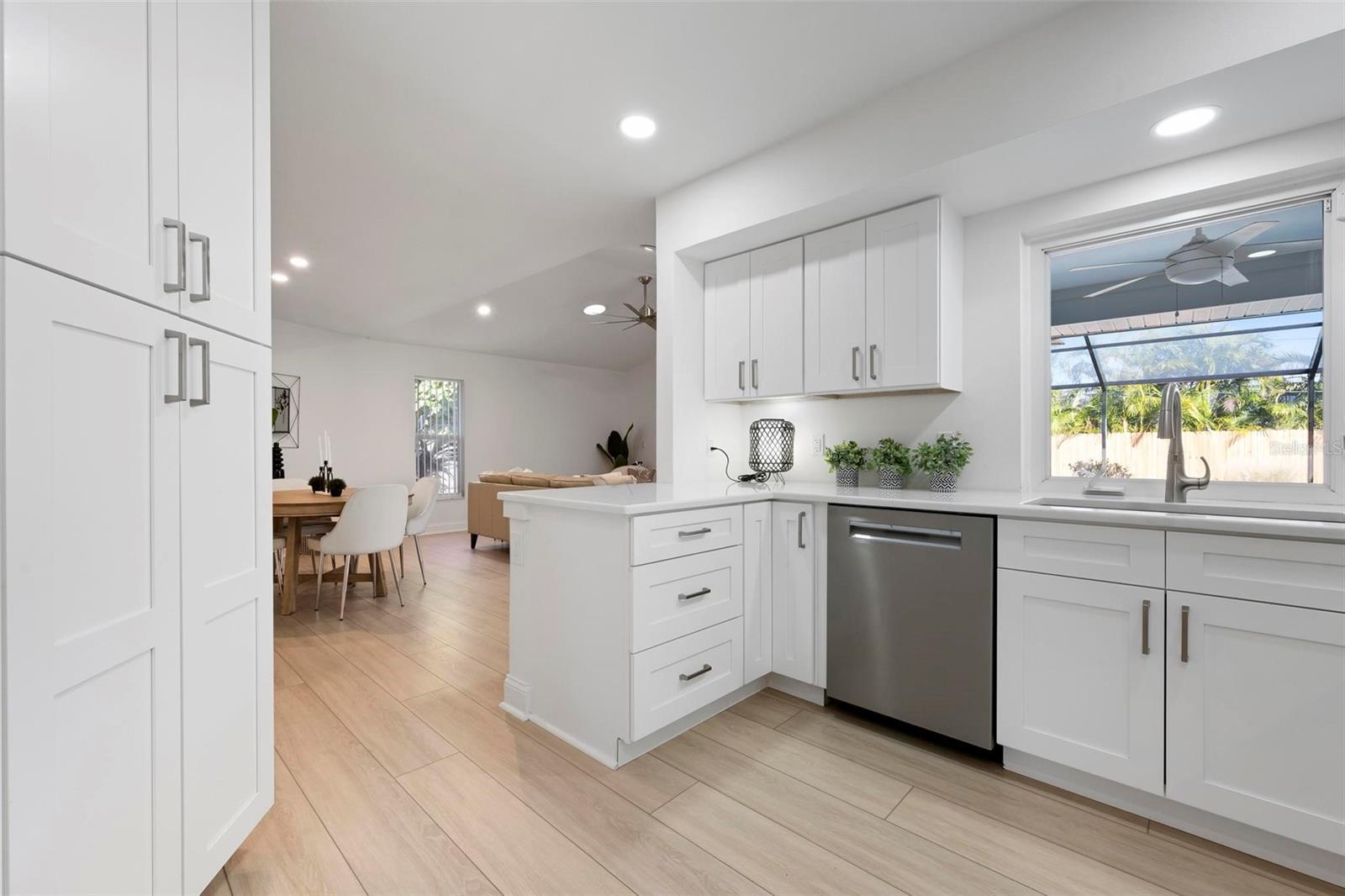 Move-in ready Golden Beach pool home on Venice Island, offering the perfect blend of coastal charm and modern updates. Stylishly remodeled throughout, this light-filled home features luxury vinyl flooring, a desirable split floor plan, and two spacious primary suites with en-suite baths, plus a third bedroom and full bath thoughtfully positioned across the home—ideal for guests or flexible living. The centrally located kitchen anchors the home and opens seamlessly to the family room with a cozy fireplace, while a separate dining and living room area provides space for entertaining. The updated kitchen boasts Quartz countertops, white cabinetry, large pantry cabinets and a Sub-Zero refrigerator, complemented by skylights and sliding glass doors that flood the living spaces with natural light. Step outside to your private tropical retreat with a heated pool, brand-new pool cage, and lush, beautifully landscaped yard—perfect for relaxing or entertaining. Recent improvements include a new roof, new pool cage, new hot water heater, and fresh interior and exterior paint, enhancing the home’s exceptional curb appeal. Enjoy deeded beach access via Golden Beach, offering a gazebo, BBQ area, and breathtaking sunset views just moments away. All of this is just a short walk or bike ride to Venice Avenue’s charming cafés, boutiques, and the beach—an unbeatable Island lifestyle opportunity.