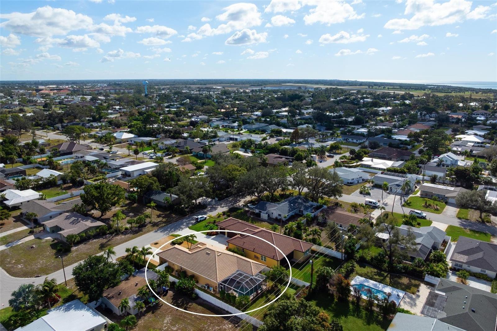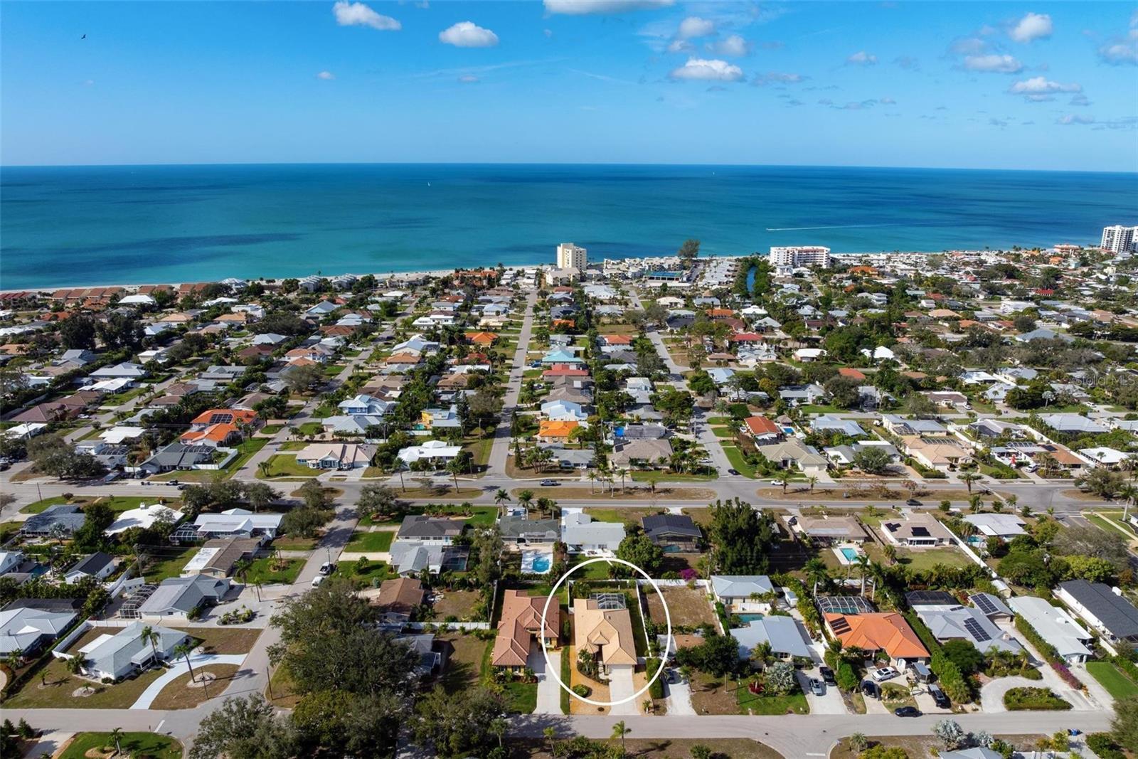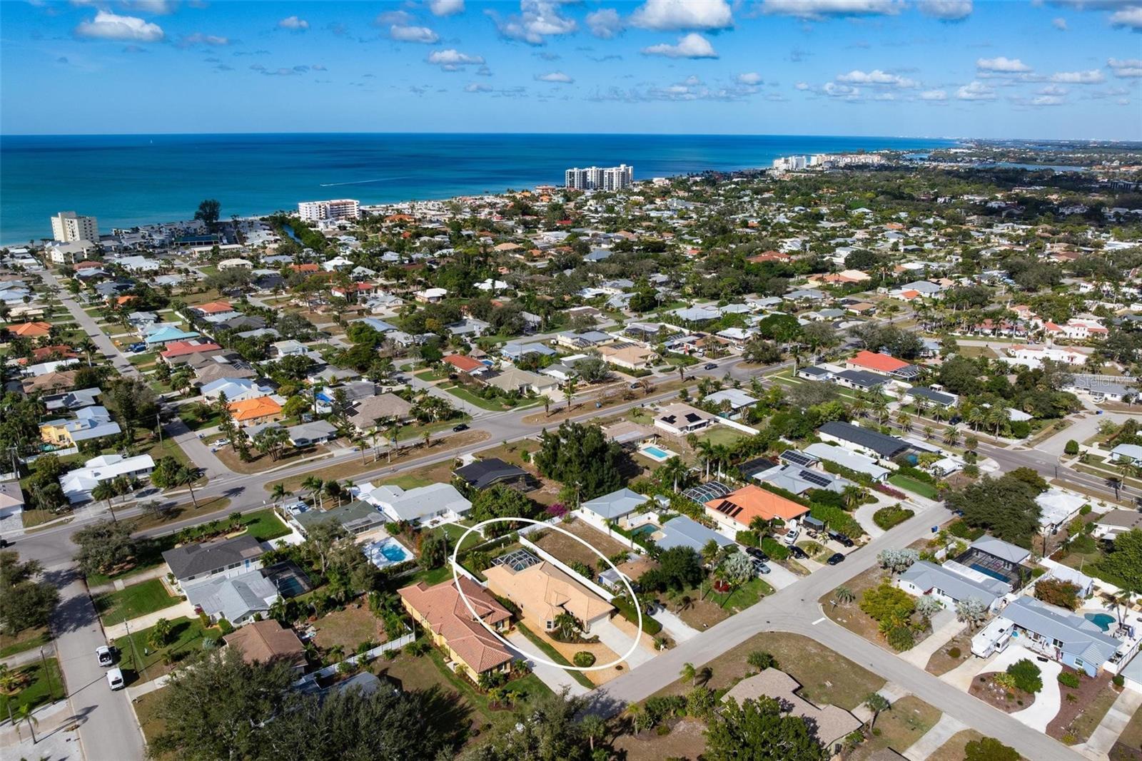 Located on Venice Island just blocks from the blue waters and sandy beaches of the Gulf, this 3-bedroom, 2-bath pool home offers the best of coastal living in a low-risk flood zone and is being offered turnkey furnished. Enjoy a relaxed tropical lifestyle filled with Gulf breezes, where sandy beaches, historic downtown Venice, and even the grocery store are all just a short bike ride away—truly just like home, only at the beach. Inside, the tiled living area features high ceilings and large-format diagonal-set porcelain tile, creating a bright and open feel. The kitchen is designed for both style and function with staggered white cabinetry, granite countertops, pendant lighting, and a cheerful dinette with banquette seating and an aquarium window overlooking the pool and lanai. The sunlit and spacious primary suite is highlighted by a tray ceiling adorned with intricate stepped moldings, while the primary bath offers dual sinks, granite counters, and a curb-less walk-in shower. Built by respected local custom builder Schroeder Homes, this residence includes a covered lanai overlooking a caged, free-form heated pool and a beautifully landscaped, fenced yard. Additional features include a private well-fed irrigation system, hurricane shutters throughout, fresh exterior paint, a new AC system in 2020, and a new well pump in 2022—making this an exceptional Venice Island opportunity.