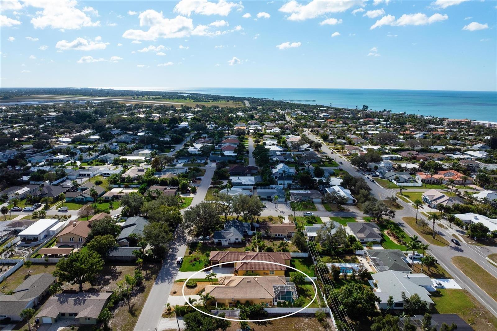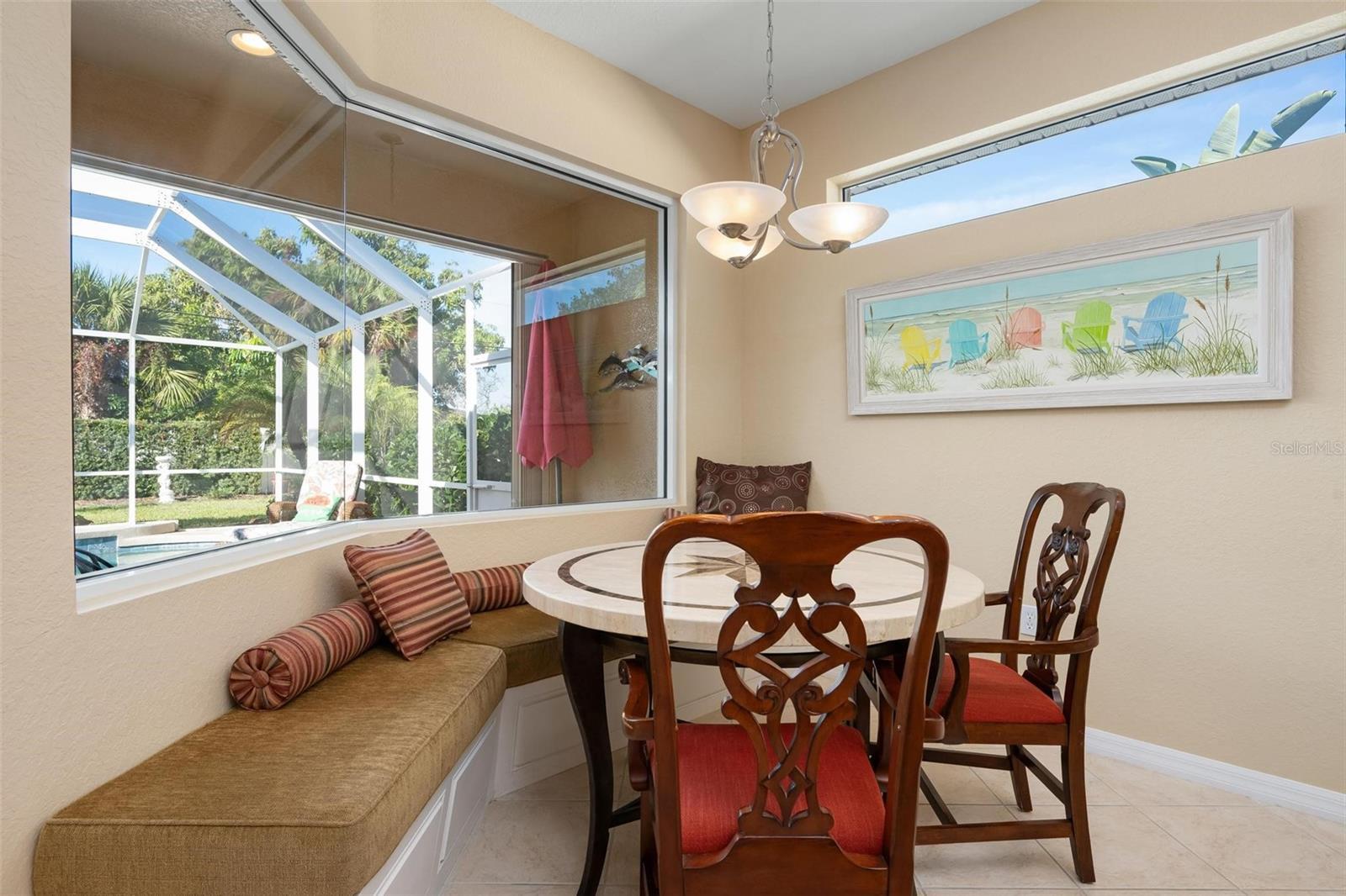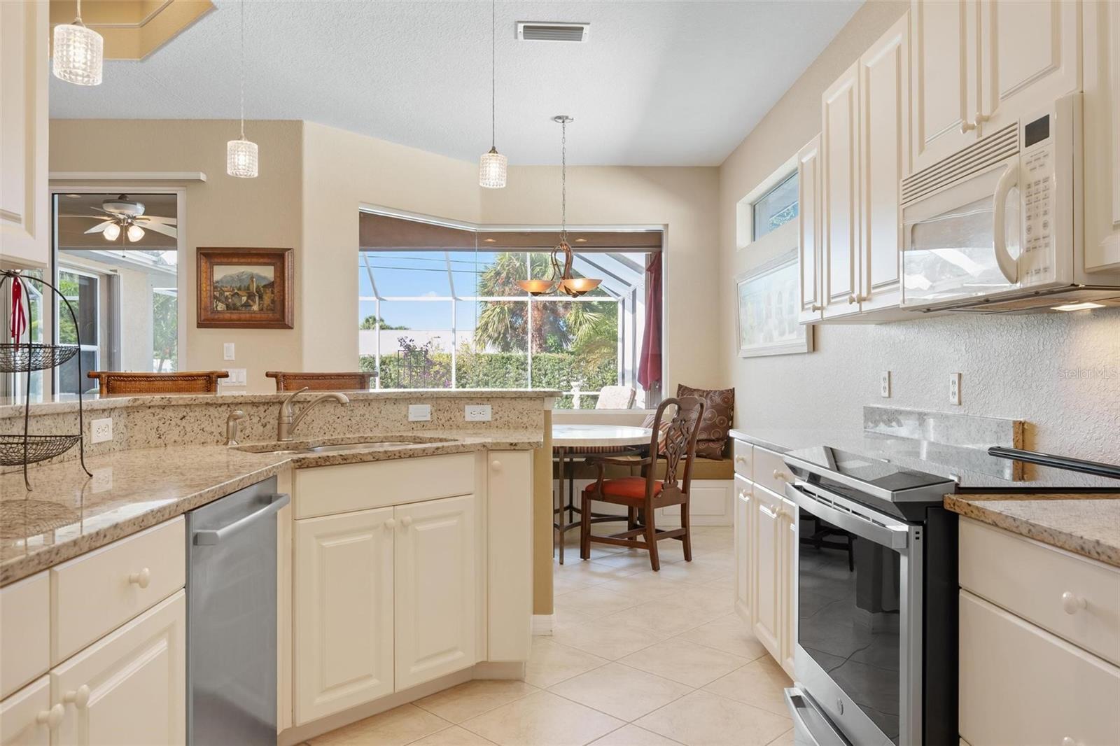 Located on Venice Island just blocks from the blue waters and sandy beaches of the Gulf, this 3-bedroom, 2-bath pool home offers the best of coastal living in a low-risk flood zone and is being offered turnkey furnished. Enjoy a relaxed tropical lifestyle filled with Gulf breezes, where sandy beaches, historic downtown Venice, and even the grocery store are all just a short bike ride away—truly just like home, only at the beach. Inside, the tiled living area features high ceilings and large-format diagonal-set porcelain tile, creating a bright and open feel. The kitchen is designed for both style and function with staggered white cabinetry, granite countertops, pendant lighting, and a cheerful dinette with banquette seating and an aquarium window overlooking the pool and lanai. The sunlit and spacious primary suite is highlighted by a tray ceiling adorned with intricate stepped moldings, while the primary bath offers dual sinks, granite counters, and a curb-less walk-in shower. Built by respected local custom builder Schroeder Homes, this residence includes a covered lanai overlooking a caged, free-form heated pool and a beautifully landscaped, fenced yard. Additional features include a private well-fed irrigation system, hurricane shutters throughout, fresh exterior paint, a new AC system in 2020, and a new well pump in 2022—making this an exceptional Venice Island opportunity.