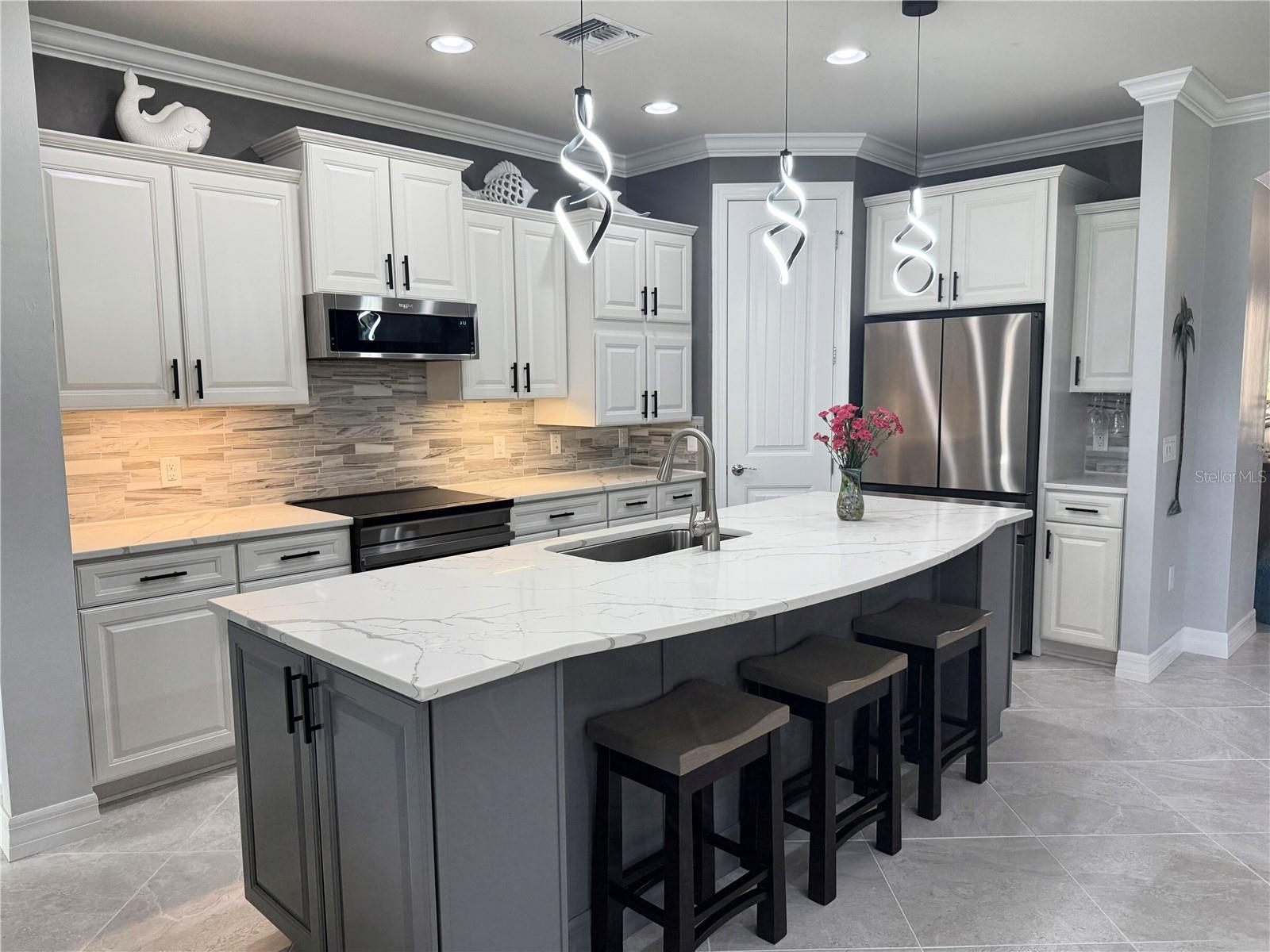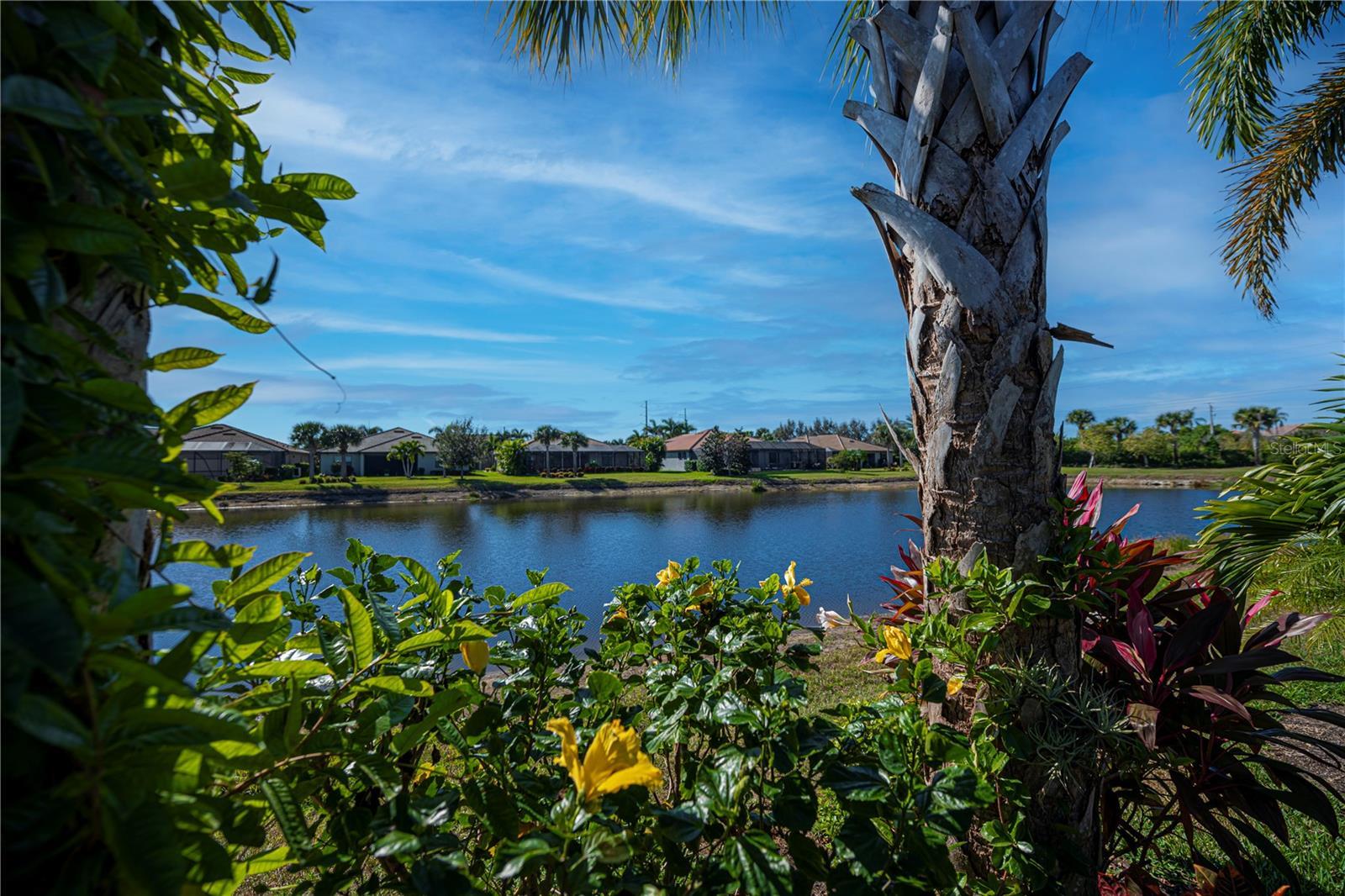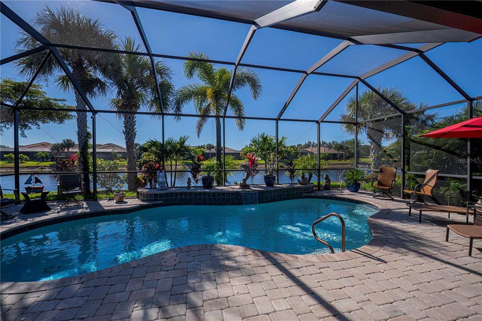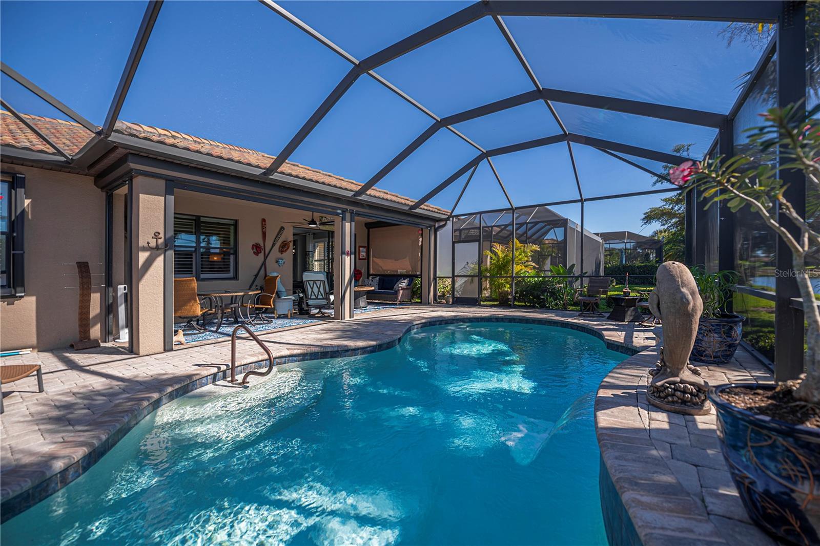 PRICE IMPROVEMENT--Welcome to Your Floridian Retreat--discover this beautifully maintained Summerwood model in the highly sought-after and amenity-rich community of IslandWalk—this home is thoughtfully updated and finished with exceptional quality throughout. From the moment you arrive, the paver driveway and walkway lead you to a striking glass front door, offering a preview of the elegance inside. Step into freshly repainted interior with crisp walls and baseboards as well as high ceilings that create a bright, inviting atmosphere. The open floor plan flows effortlessly, beginning with a spacious living room anchored by an electric fireplace—a true showpiece. The chef’s kitchen is the heart of the home, featuring a large quartz-topped island and newer appliances including a Samsung non scratch induction stove (2025), microwave, and Samsung refrigerator (2025). Just off the kitchen, the sunroom provides a cheerful space to enjoy morning coffee or unwind with a good book. The primary suite offers comfort and sophistication with engineered hardwood floors and a custom walk-in closet. The ensuite bath includes dual sinks, granite countertops, a garden tub, and a separate shower. A versatile den with Murphy bed adds flexibility—perfect for a home office, creative studio, or occasional guest room. Step outside to your private oasis: a large covered porch (measuring 9'x25') and screened lanai (measuring 32'x40') overlooking peaceful lake views, complete with a sparkling saltwater pool (with recently replaced salt cell) and a tranquil waterfall feature. Storm Smart power screens and accordion shutters provide added peace of mind. Additional highlights of the home include an extended 20x30 tandem garage with epoxy floors and a built-in storage room, along with a thoughtfully designed laundry room featuring extensive custom cabinetry and a two-year-old washer and dryer. A whole-house water purification and softener system adds extra comfort and convenience, and the current, transferable Home Choice warranty provides valuable peace of mind. With ceramic tile and engineered hardwood throughout—no carpet in sight—maintaining this home is effortless. IslandWalk offers true resort-style living with two geothermal pools, a lap pool, fitness center, pickleball and tennis courts, dog park, and more. This home blends luxury, functionality, and comfort—ready for you to move right in and embrace the Florida lifestyle.