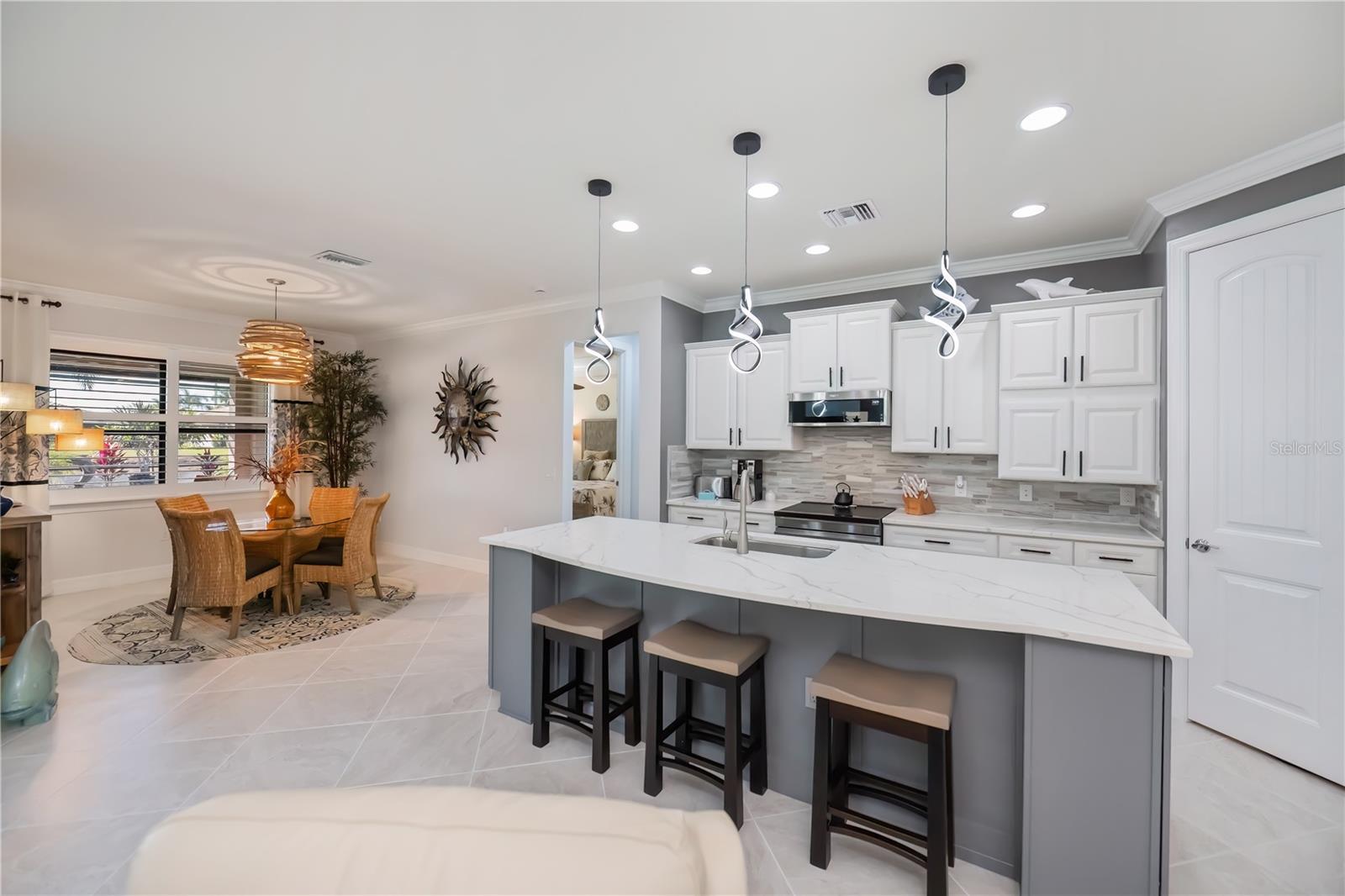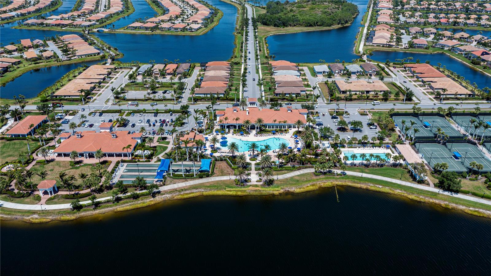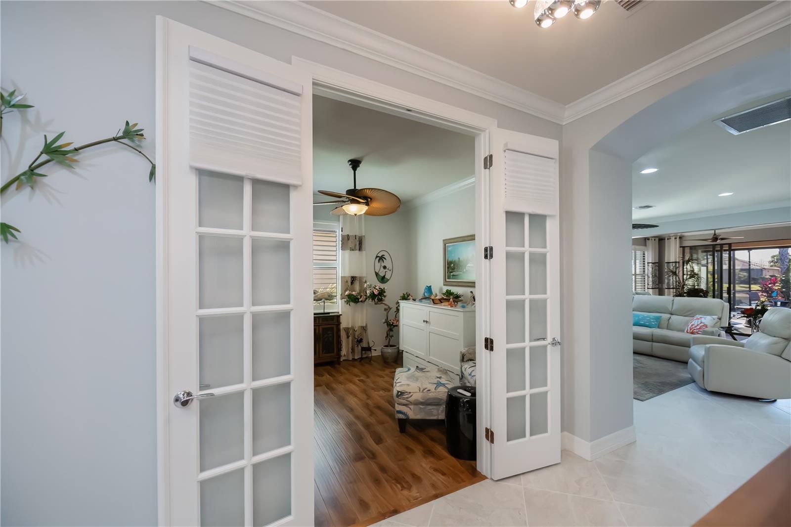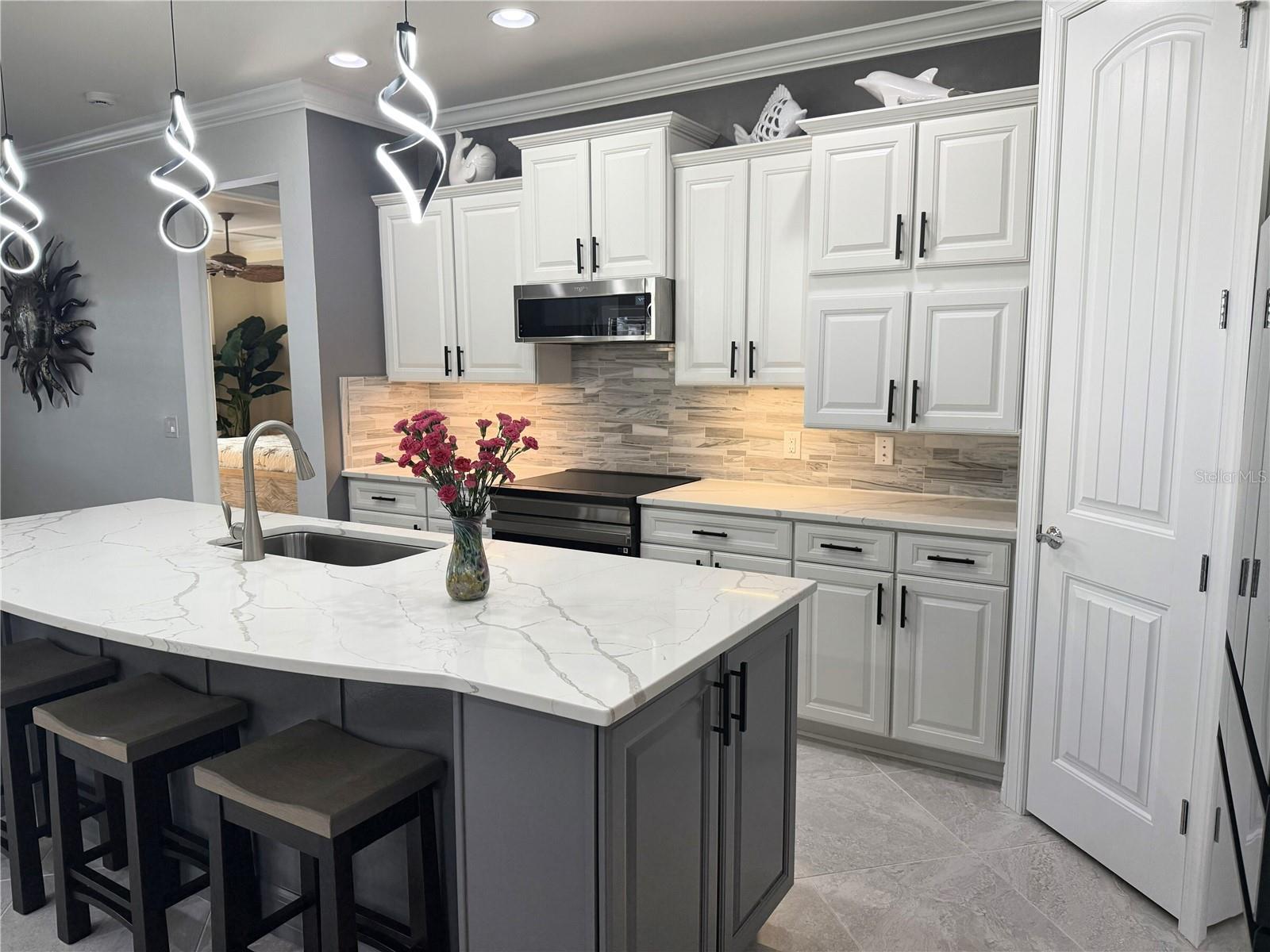 PRICE IMPROVEMENT--Welcome to Your Floridian Retreat--discover this beautifully maintained Summerwood model in the highly sought-after and amenity-rich community of IslandWalk—this home is thoughtfully updated and finished with exceptional quality throughout. From the moment you arrive, the paver driveway and walkway lead you to a striking glass front door, offering a preview of the elegance inside. Step into freshly repainted interior with crisp walls and baseboards as well as high ceilings that create a bright, inviting atmosphere. The open floor plan flows effortlessly, beginning with a spacious living room anchored by an electric fireplace—a true showpiece. The chef’s kitchen is the heart of the home, featuring a large quartz-topped island and newer appliances including a Samsung non scratch induction stove (2025), microwave, and Samsung refrigerator (2025). Just off the kitchen, the sunroom provides a cheerful space to enjoy morning coffee or unwind with a good book. The primary suite offers comfort and sophistication with engineered hardwood floors and a custom walk-in closet. The ensuite bath includes dual sinks, granite countertops, a garden tub, and a separate shower. A versatile den with Murphy bed adds flexibility—perfect for a home office, creative studio, or occasional guest room. Step outside to your private oasis: a large covered porch (measuring 9'x25') and screened lanai (measuring 32'x40') overlooking peaceful lake views, complete with a sparkling saltwater pool (with recently replaced salt cell) and a tranquil waterfall feature. Storm Smart power screens and accordion shutters provide added peace of mind. Additional highlights of the home include an extended 20x30 tandem garage with epoxy floors and a built-in storage room, along with a thoughtfully designed laundry room featuring extensive custom cabinetry and a two-year-old washer and dryer. A whole-house water purification and softener system adds extra comfort and convenience, and the current, transferable Home Choice warranty provides valuable peace of mind. With ceramic tile and engineered hardwood throughout—no carpet in sight—maintaining this home is effortless. IslandWalk offers true resort-style living with two geothermal pools, a lap pool, fitness center, pickleball and tennis courts, dog park, and more. This home blends luxury, functionality, and comfort—ready for you to move right in and embrace the Florida lifestyle.