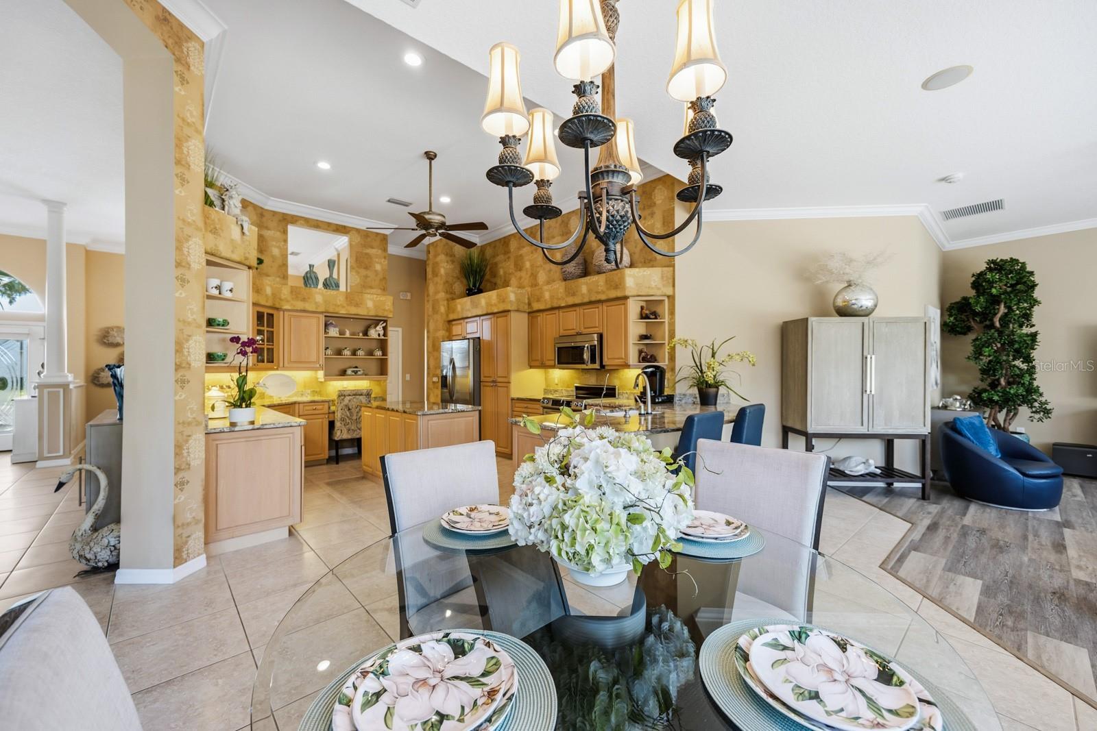 - Ceiling Fans(s), Crown Molding, Eat-in Kitchen, High Ceilings, Kitchen/Family Room Combo, L Dining, Open Floorplan, Primary Bedroom Main Floor, Stone Counters, Thermostat, Walk-In Closet(s), Window Treatments