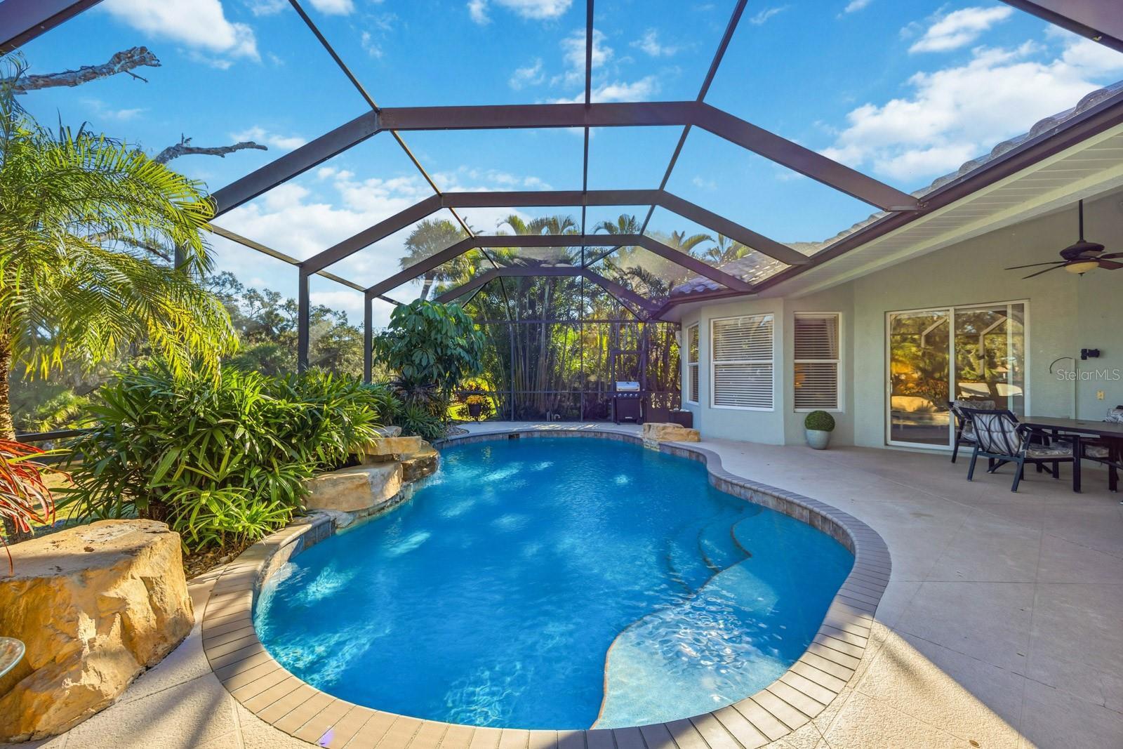 DO YOU WANT TO LIVE IN PARADISE?? TAKE A LOOK AT THIS BEAUTIFUL CUSTOM-BUILT HOME IN THE PREMIER GATED COMMUNITY OF SOUGHT AFTER SAWGRASS WHICH OFFERS A HEATED POOL, FITNESS CENTER, CLUBHOUSE AND A PICKLE BALL COURT WITH LOTS OF ACTIVITIES TO ENJOY. YOU ARE ONLY 4 MILES FROM THE HISTORIC DOWNTOWN VENICE, SEVERAL BEACHES INCLUDING A DOG BEACH, SHOPPING, DINING, AND CULTURAL ATTRACTIONS. AS YOU ENTER THE FRONT DOUBLE GLASS DOORS YOUR VIEW IS BREATHTAKING OF THE LUSH LANDSCAPING WHICH DISPLAYS A UNIQUE GARDEN WATERFALL SURRONDING THE POOL. THERE ARE SOARING 12 FOOT SEILINGS IN THE FORMAL DINING ROOM, FORMAL LIVING ROOM AND MASTER BEDROOM WITH 5 INCH CUSTOM CROWN MOLDING THROUGH OUT THE WHOLE HOME. THE GOURMET KITCHEN HAS AN ISLAND WITH GRANITE COUNTERTOPS, RAISED PANEL MAPLE CABINETS, PULL OUT DRAWS, PANTRY, STAINLESS STEEL APPLIANCES, TRASH COMPACTOR, PLANT SHELVES AND UNDER CABINET LIGHTING. THE LAUNDRY ROOM HAS MULTIPLE CABINETS, A FOLDING TABLE AND BUILD IN IRON BOARD. THIS IS A SPLIT FLOOR PLAN WITH 2 SPACIOUS GUEST BEDROOM AND BATH. SOLID CORE INTERIOR DOORS FOR NOISE REDUCTION. DOUBLE DOORS TO THE MASTER SUITE WITH TREY CEILINGS WITH GLASS SLIDING DOORS OUT TO YOUR LANAI AND A LARGE SITTING AREA FOR RELAXTION. GARDEN TUB, WALKING IN SHOWER WITH GLASS BLOCK FOR PRIVACY, DOUBLE SINKS AND A CONFORT HIGH TOILET. THE HOME HAS 20 BY 20 TILE WITH NEW LUXURY VINYL IN THE FAMILY ROOM, 2 GUEST BEDROOMS, OFFICE AND MASTER SUITE. THERE IS NO CARPET IN THIS HOME. IT HAS A TRANE 16 SEER WITH 4 ZONES FOR MAXIMUM EFFICIENCY. WINDOW TREATMENTS, BLINDS, 7 CEILING FANS INCLUDING ONE IN THE GARAGE, LIGHTING AND MARBLE WINDOW SILES. THERE IS A BRANDNEW ROOF PUT IN 2025. SECURITY SYSTEM AND SURROUND SOUND THROGHTOUT THE HOME. CONVENIENT TO GROCERY STORES AS WELL AS THE NEW SARASOTA MEMORIAL HOSPITAL. THIS LOCATION HAS IT ALL, LOW HOA'S AND NO CDD FEES AND NOT IN A FLOOD ZONE. A NINE HOLE GOLF COURSE MEANDERS THROUGH THE COMMUNITY WITH LUSH LANDSCAPING AND LAKES. SCHEDULE YOUR PRIVATE TOUR TODAY.