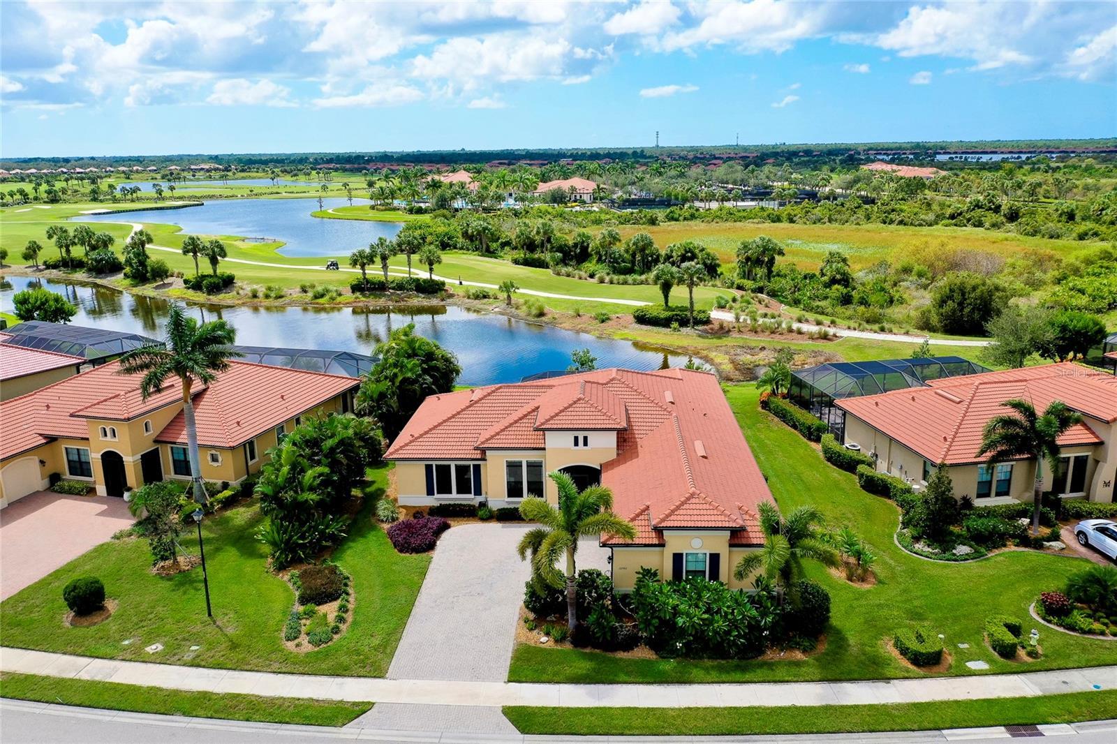 WELCOME HOME to your very own Private Paradise! This STUNNING GOLF ESTATE HOME is located in the highly desirable, guard-gated community of SARASOTA NATIONAL in Historic Venice, Florida!! This exceptional & Original WCI built home offers the finest in Florida indoor & outdoor living and is perfectly designed to be versatile for casual or formal entertaining and also includes a Golf Membership for two (2). This meticulously maintained Muirfield Model features 3 Bedrooms plus a large Bonus Room/Den/Study/Office, 3 Bathrooms, 3 Car, side-loaded, insulated Garage and Attic with plenty of storage space, whole-house insulated for sound-proofing, in-wall pest control as well as a central vacuuming system. From the Pavered Driveway, walk through the covered, screened entryway & step through the front door into this lovely home. You will be amazed at the expansive & open view of the Great Room, volume ceilings, surround sound & Porcelain flooring. Looking to your right is a separate Dining Room that offers a private area to entertain guests. Just ahead is the beautiful Chef's Gourmet Kitchen with upgraded, Stainless Steel appliances, Convection Microwave, Induction Range, French Door Refrigerator, Granite Countertops, oversized Bar/Island with Sink, Dishwasher & cabinets on one side and plenty of seating on the opposite side; solid wood Cabinetry with slide-out, soft close drawers & walk-in Pantry. Just to the side of the Kitchen there is an extra roomy, Dining area with a large Slider that opens on to the Lanai. This quality built home exceeds all expectations including stacking, pocket sliding glass doors across the entire back that opens onto the extended, pavered Lanai with wired speakers, plumbed for an Outdoor Kitchen and Spectacular Lake & Golf Course views; the perfect spot to enjoy your morning coffee or entertain friends in the evening for cocktails!! Split Bedrooms with the generous sized Owner's Suite ideally located for privacy with massive Walk-in Closet, Linen Closet, en-suite Bathroom with dual Vanities & Walk-in Shower. The Family & Guest accommodations are warm & welcoming; the second Bedroom also featuring an en-suite Bathroom/combo tub & shower and another large Bonus Room with gorgeous French Doors which is currently being used as an Office. On the other side of the home is the third Bedroom with an adjacent Bathroom/shower. The Laundry room is in a convenient location near the front of the home with a sink & lots of additional wood cabinetry for storage. 10 foot volume ceilings, Surround Sound, Porcelain flooring. High Impact glass, Shaded windows throughout which finishes out this exquisite home in the fantastic, amenity-rich community that includes an 18-hole championship Golf Course, Clubhouse with Bar & Dining facilities, zero-entry heated resort style Pool, outdoor Tiki Bar, Tennis, Bocce & Pickleball courts, Fitness center, Coffee Cafe, Playground, Dog Park & so much more. This incredible Home is just minutes to nearby Beaches, Atlanta Braves Spring Training Stadium, Wellen Park's downtown center as well as Historic Downtown Venice. Furniture Optional! This is a MUST SEE; Schedule an Appt. and SHOW Today!!