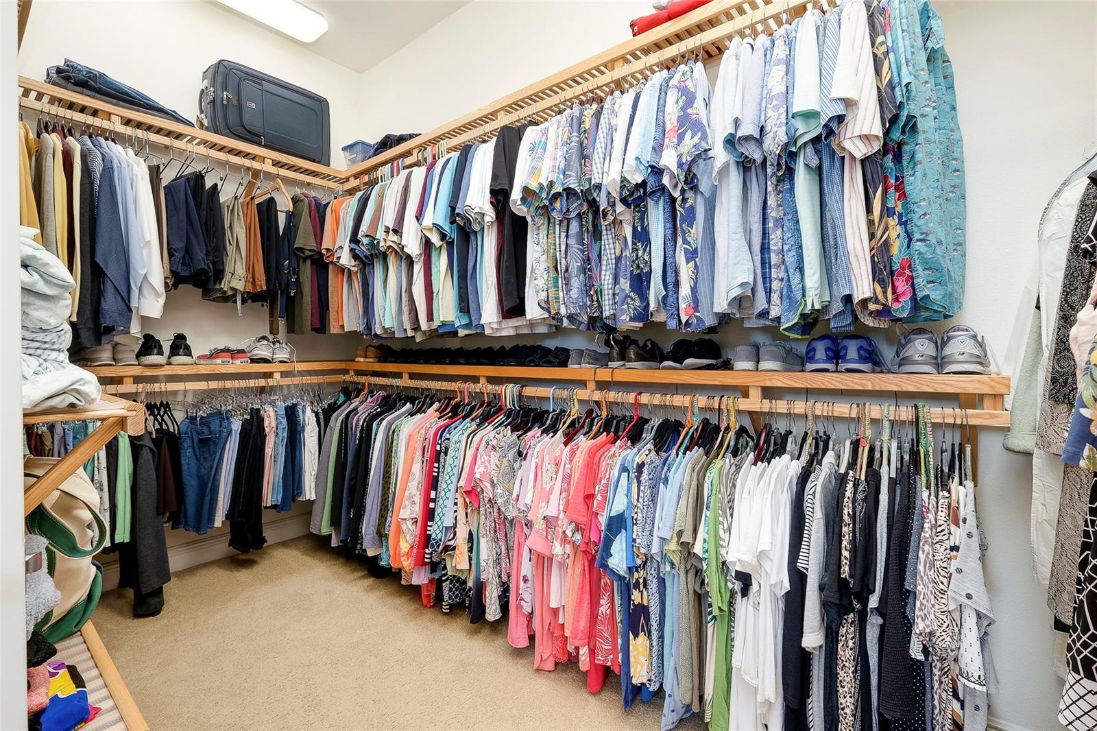 - Attic Ventilator, Ceiling Fans(s), Central Vaccum, Coffered Ceiling(s), Crown Molding, Eat-in Kitchen, High Ceilings, In Wall Pest System, Kitchen/Family Room Combo, Open Floorplan, Primary Bedroom Main Floor, Solid Surface Counters, Solid Wood Cabinets, Split Bedroom, Stone Counters, Thermostat, Tray Ceiling(s), Walk-In Closet(s), Window Treatments
