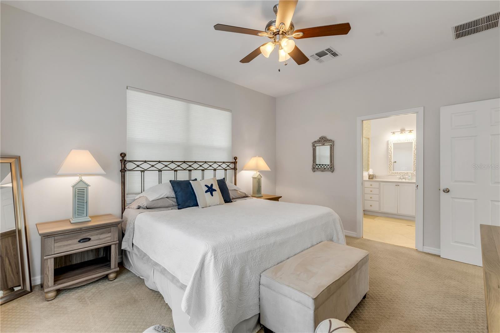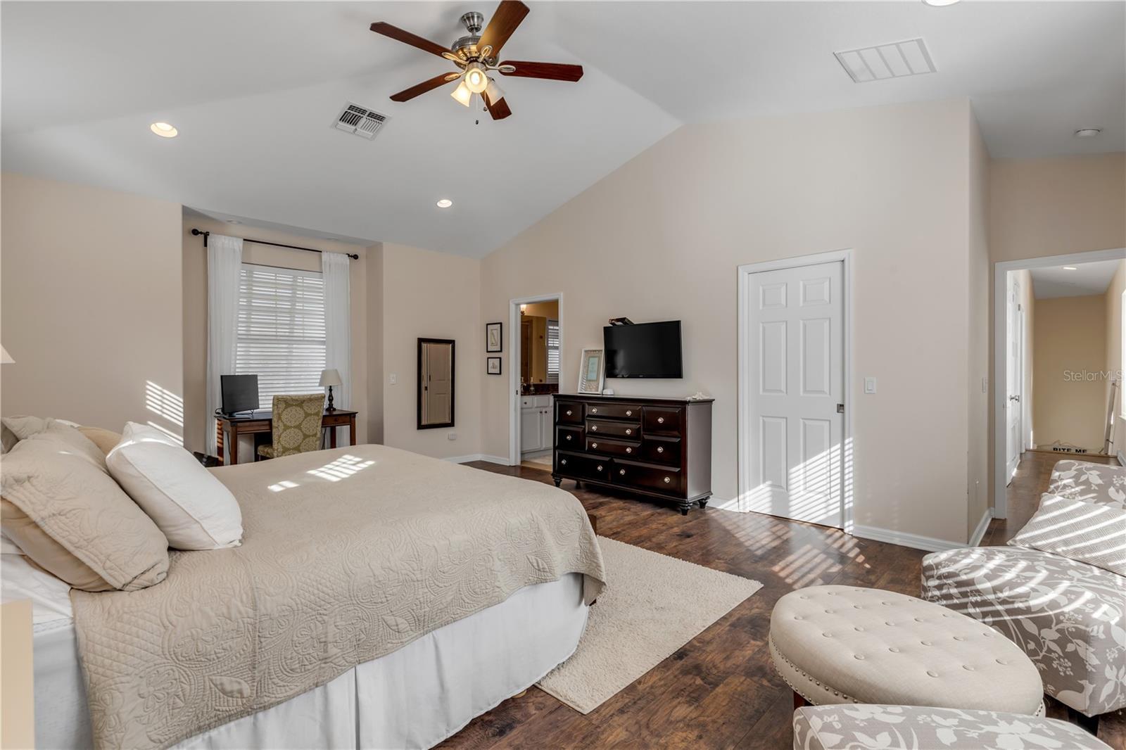 - Built-in Features, Cathedral Ceiling(s), Ceiling Fans(s), Crown Molding, Eat-in Kitchen, High Ceilings, Kitchen/Family Room Combo, Living Room/Dining Room Combo, Open Floorplan, Primary Bedroom Main Floor, PrimaryBedroom Upstairs, Solid Surface Counters, Stone Counters, Thermostat, Walk-In Closet(s), Window Treatments