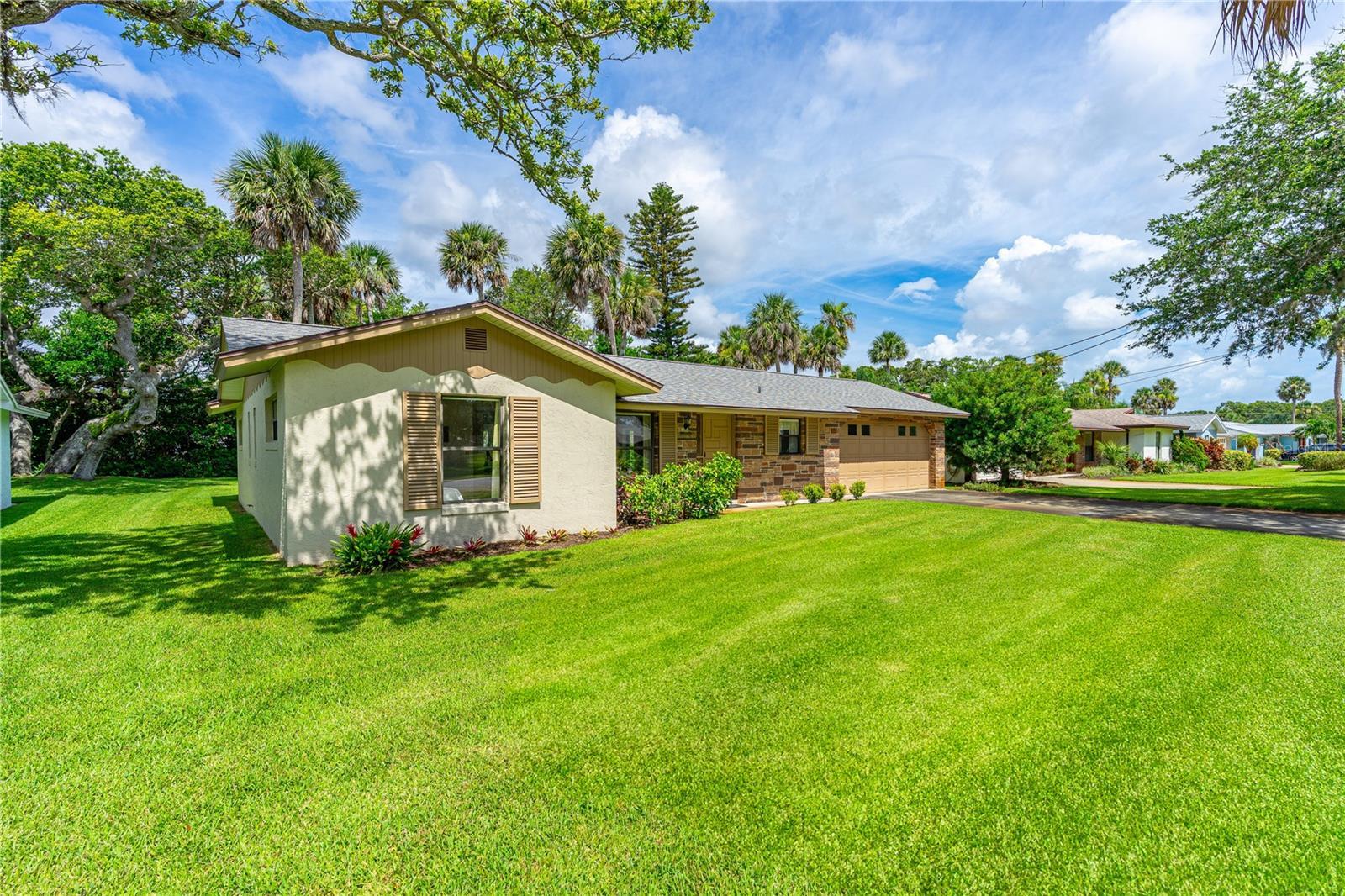 Under contract-accepting backup offers. IF YOU ARE LUCKY TO LIVE IN NEW SMYRNA BEACH, YOU ARE LUCKY ENOUGH! THIS BEAUTIFUL HOME CAN MAKE YOU LUCKY ENOUGH. THIS MOVE IN READY HOME HAS BEEN IN THE SAME FAMILY FOR DECADES AND THE LOVE AND CARE THEY HAVE SHOWN IS APPARENT WHEN YOU DRIVE IN THE DRIVEWAY AND WALK IN THE FRONT DOOR. THIS GEM OF A HOME CENTRALLY LOCATED IN NEW SMYRNA BEACH WHICH IS KNOWN FOR ITS LAID-BACK VIBE, STUNNING BEACHES, WALKING AMENITIES ESPECIALLY AROUND FLAGLER AVENUE WHICH IS A HUB FOR DINING, SHOPPING AND ENTERTAINMENT. SITUATED ON A LARGE 75X140 LOT WITH LUSH PALM TREES AND BEAUTIFUL TREES THAT ADD TO THAT OLD FLORIDA FEELING. THIS SOLID BLOCK HOME WITH A RECENT ROOF (LESS THAN 5 YEARS OLD), NEW HVAC, GRANITE COUNTER TOPS - DURABILITY AND LOW MAINTENANCE ARE KEY FACTORS AND A BIG WIN FOR OWNING THIS REAL ESTATE INVESTMENT. THE BONUS ROOM WITH CATHEDRAL CEILINGS AND FLOOR TO CEILINGS WINDOWS OVERLOOKING A LUSH BACKYARD IS A DREAMY SPOT FOR RELAXING, ENTERTAINING, ADDITIONAL GUEST AND SLEEPING SPACE. THE OUTDOOR SHOWER AND GOLF CART FRIENDLY LOCATION SCREAM BEACH LIFESTYLE. THE FACT THAT ITS MOVE-IN READY MAKES IT APPEALING FOR RETIRES, VACATION HOME SEEKERS, OR INVESTORS LOOKING FOR A TURNKEY RENTAL PROPERTY. THE LARGE TWO-CAR GARAGE WITH WASHER AND DRYER, MOP SINK AND ADDITIONAL EXIT DOOR, SPRINKLER SYSTEM ON A WELL, AND PUBLIC UTILITIES ADD PRACTICALLY TO YOUR PURCHASE. THE 2-BED, 2-BATH LAYOUT WITH A SPACIOUS (25x14 ft) BONUS ROOM OFFERS FLEXIBILITY - MAYBE A HOME OFFICE, GUEST SPACE, OR MEDIA ROOM. NO FLOODING ISSUES FROM PAST STORMS LOCATED IN LOW-RISK FLOOD ZONE X. THIS MAGNIFICENT PROPERTY IS EASY TO SHOW. DON’T JUST DAY-DEAM ABOUT BEACH LIFE… JUST DO IT!