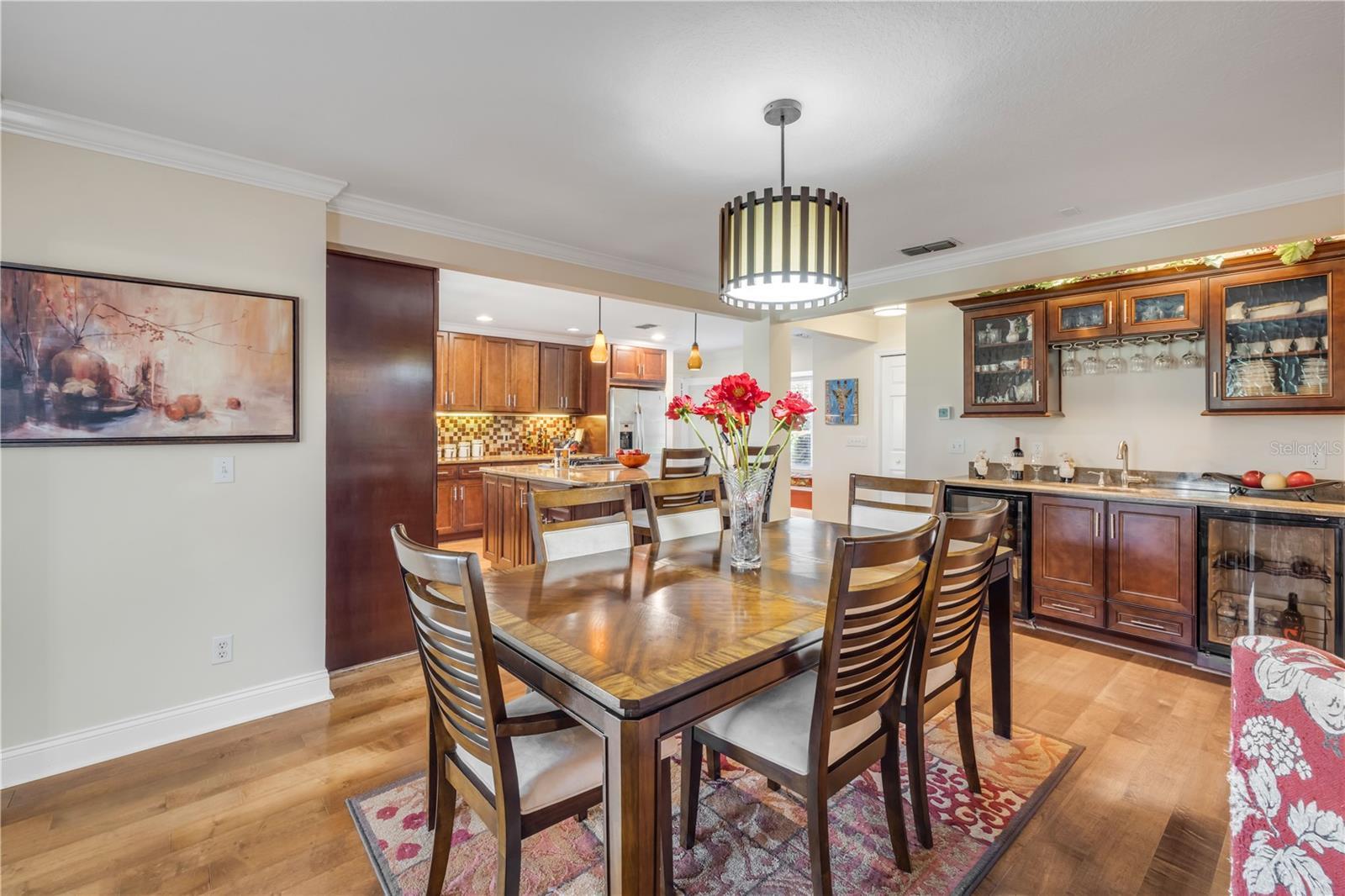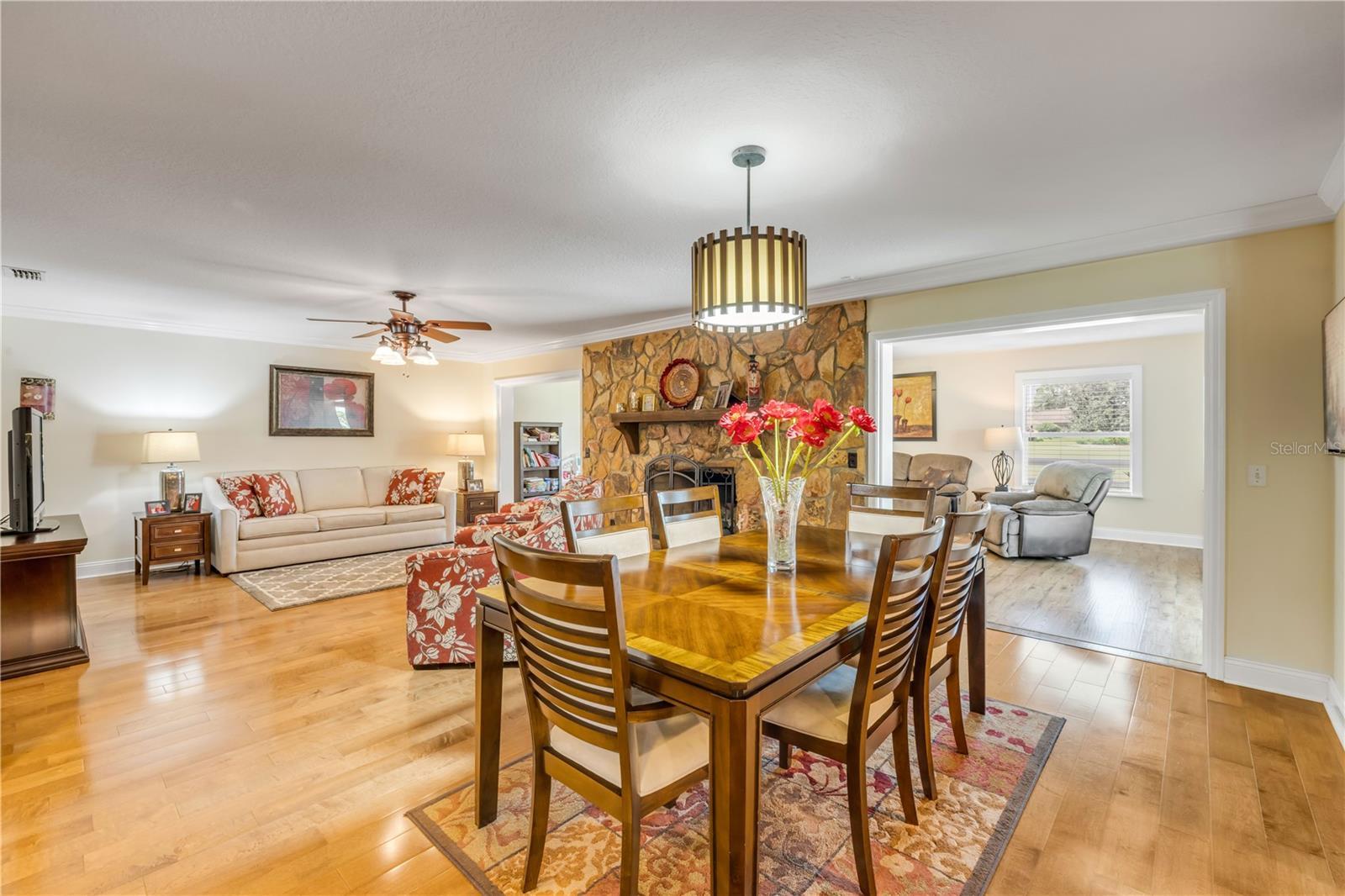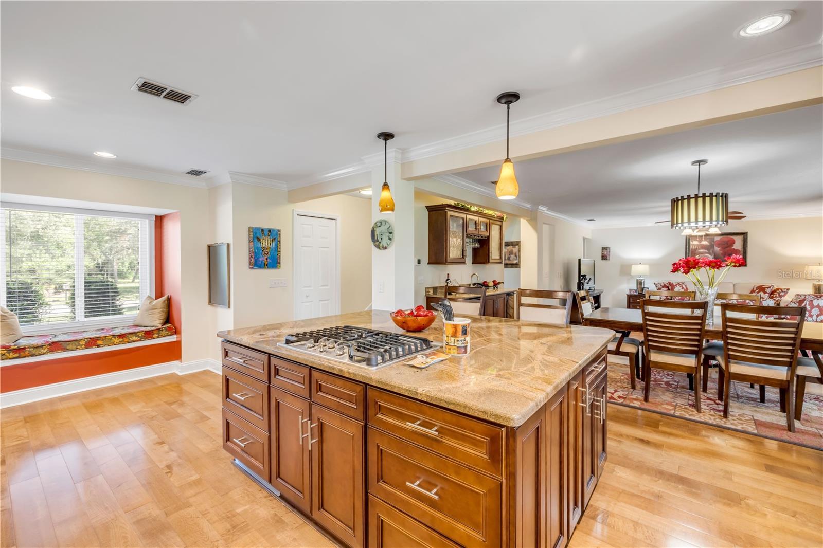 - Built-in Features, Ceiling Fans(s), Crown Molding, Eat-in Kitchen, Living Room/Dining Room Combo, Primary Bedroom Main Floor, Solid Surface Counters, Solid Wood Cabinets, Split Bedroom, Stone Counters, Walk-In Closet(s), Wet Bar, Window Treatments