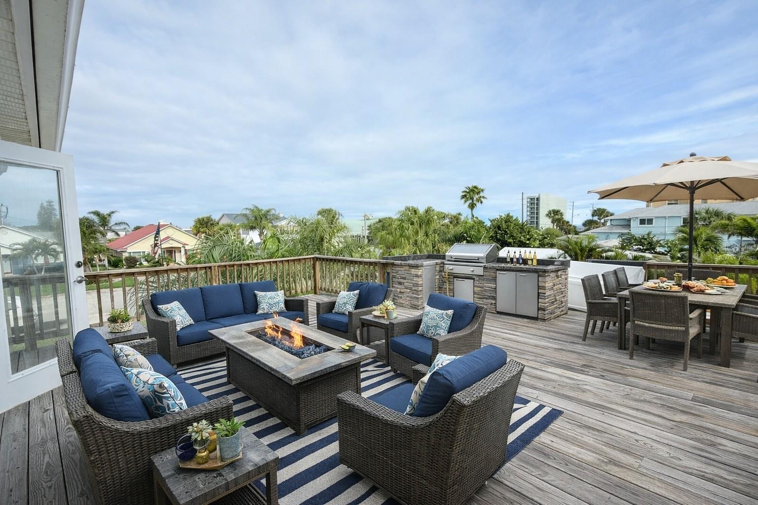 Charming 4-Bedroom Coastal Retreat with Ocean Peek & Flexible Space and just steps to the beach. Beautifully designed 4-bedroom, 2-bathroom home offering comfort, versatility, and style. From the moment you step onto the front porch and through the inviting entry, you'll be drawn into the open-concept living and kitchen area, featuring soaring high ceilings, elegant window details, and custom treatments that bathe the space in natural light. The heart of the home is the spacious kitchen, seamlessly connected to a cozy living room—perfect for entertaining or relaxing. Just off the kitchen, a separate dining room provides an ideal space for formal meals or intimate gatherings. The downstairs layout is completely flexible, offering ample opportunity to create a guest suite, media room, or additional workspace. Upstairs, the serene primary suite is your private retreat, complete with its own deck facing east to capture gentle morning light and a peek of the ocean. An additional upstairs bedroom is perfect for a nursery, home office, or creative studio. Add'l seating in the front yard with firepit is a great spot for gathering with friends during the chilly season. Beach access is less than 300 steps away plus nearby cuisine and the 27th Ave park with playground. The fully fenced backyard with alley access offers privacy and convenience, while the 2-car garage provides ample storage and parking. Home was renovated in 2015 and includes updated impact windows.