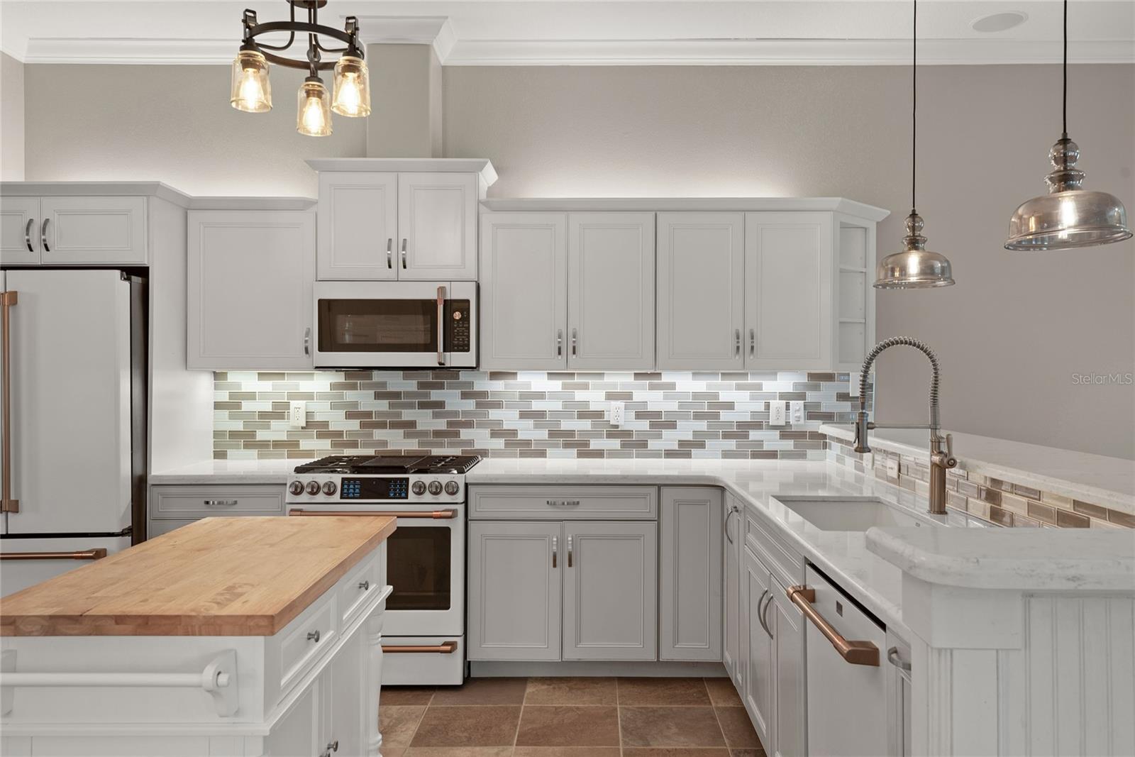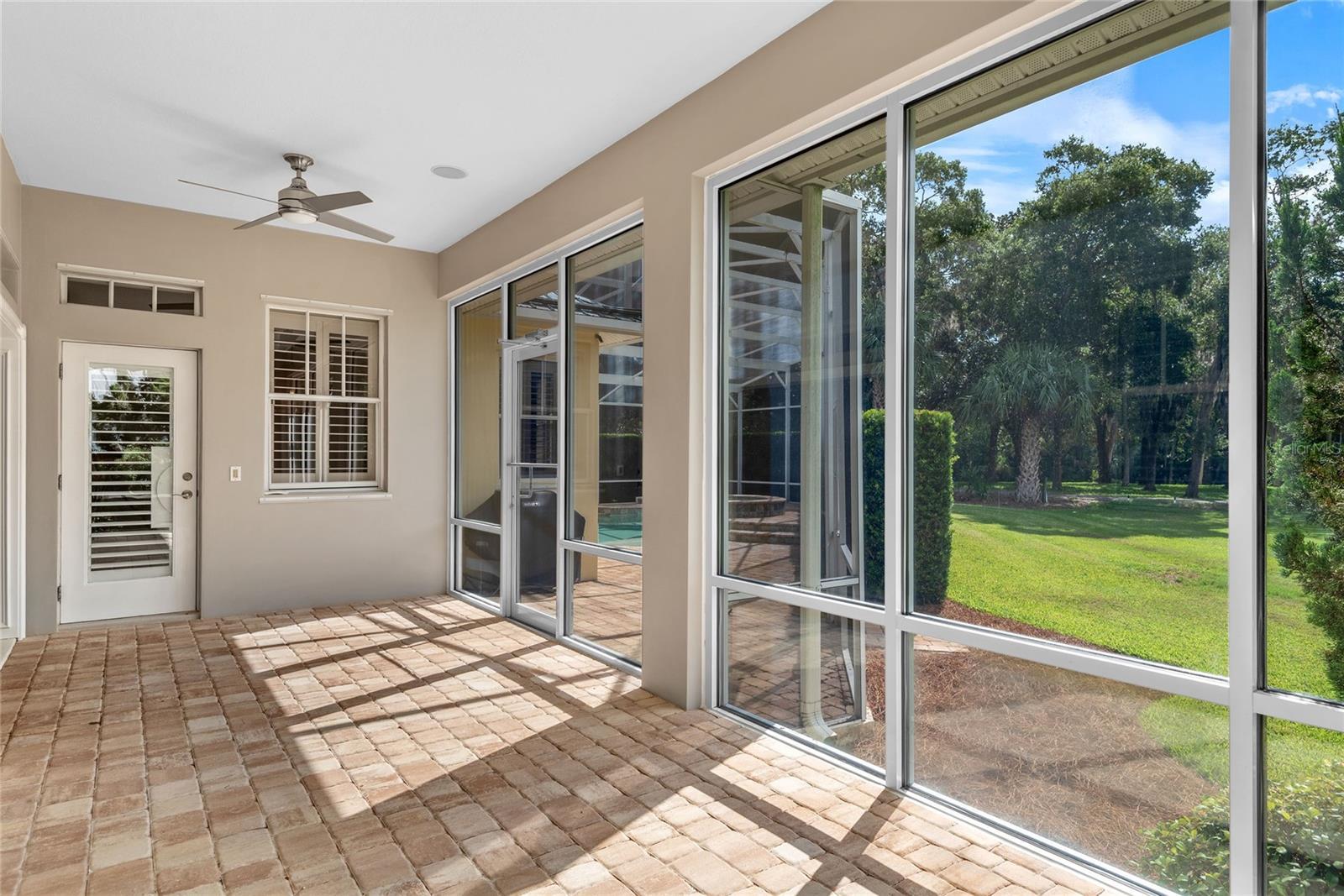 Welcome to a timeless residence nestled on a private, tree-lined street within the gated community of Sugar Mill Country Club in New Smyrna Beach. Thoughtfully designed for both relaxed living and refined entertaining, this home offers a seamless blend of privacy, comfort, and understated elegance. A paver driveway and manicured landscaping lead to the entry, where the open-concept interior features volume ceilings, crown molding, and natural light throughout. The gourmet kitchen includes white cabinetry, quartz surfaces, a center island with butcher block top, and a contemporary glass-tile backsplash. The adjacent living area centers around a gas fireplace and built-in window seating with plantation shutters. The spacious floor plan continues outdoors with a screened lanai featuring a sparkling pool and integrated spa surrounded by a paver terrace. Primary retreat offers rich wood flooring and an en-suite Primary bath with double sinks, soaking tub and walk in shower. Home has an added feature of a large bonus room above the garage, great for a Game room, large Guest Suite or additional living space. The residence is situated on a prime homesite backing to the golf course, offering serene views and direct access to community amenities. A metal roof, three-car garage, and well-appointed interior finishes complete the offering. Located just minutes from New Smyrna Beach’s vibrant historic district and coastline, this home presents an exceptional lifestyle opportunity within one of Central Florida’s most desirable private clubs.