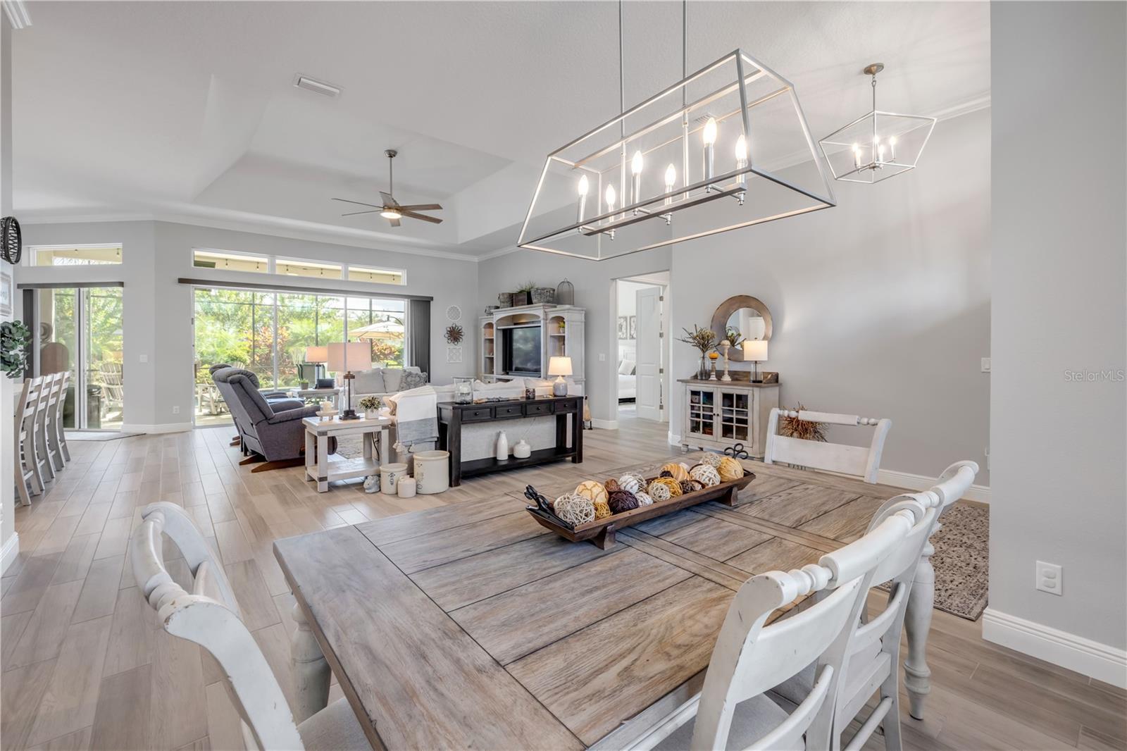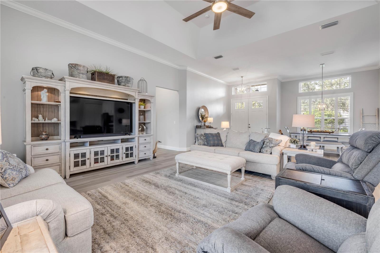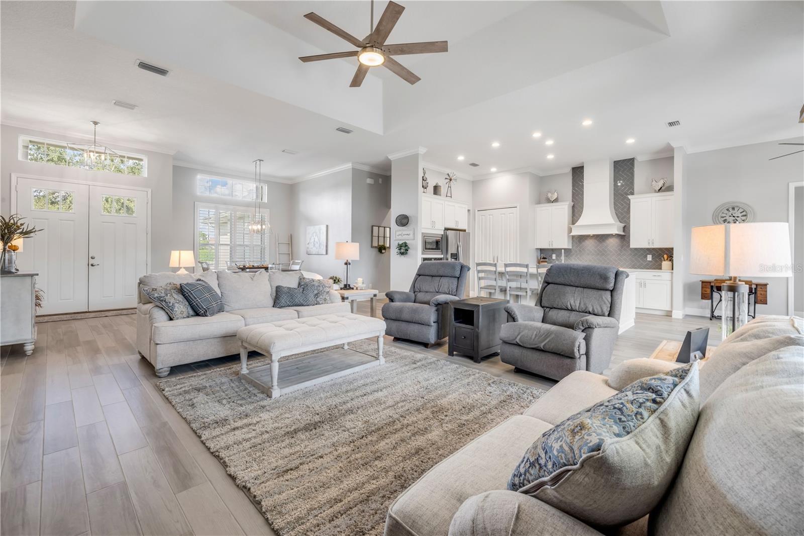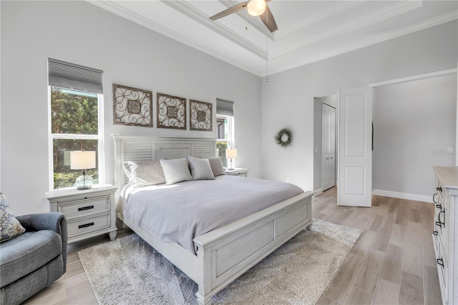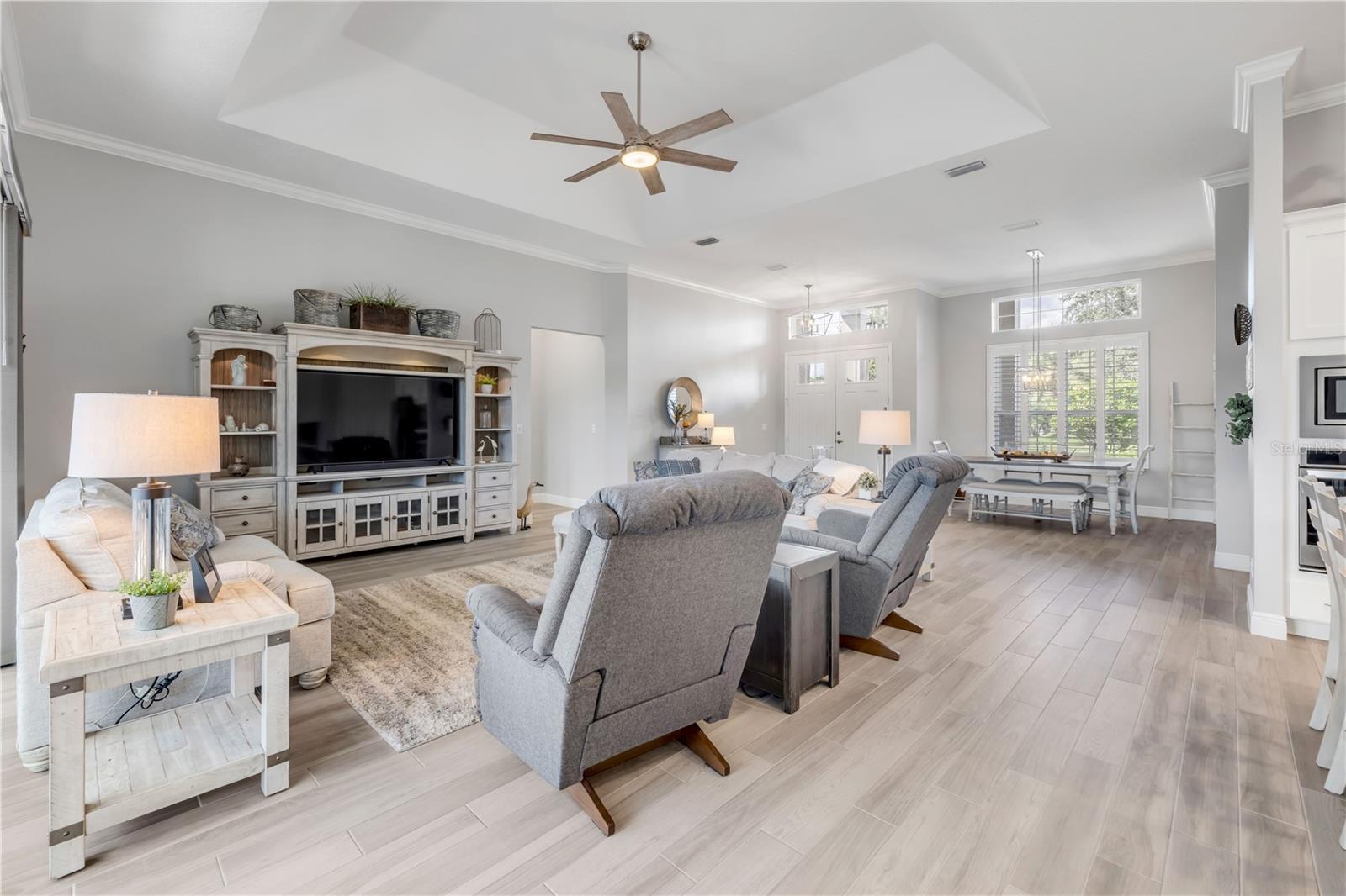 - Attic Ventilator, Ceiling Fans(s), Eat-in Kitchen, High Ceilings, Living Room/Dining Room Combo, Open Floorplan, Primary Bedroom Main Floor, Solid Surface Counters, Thermostat, Tray Ceiling(s), Walk-In Closet(s), Window Treatments