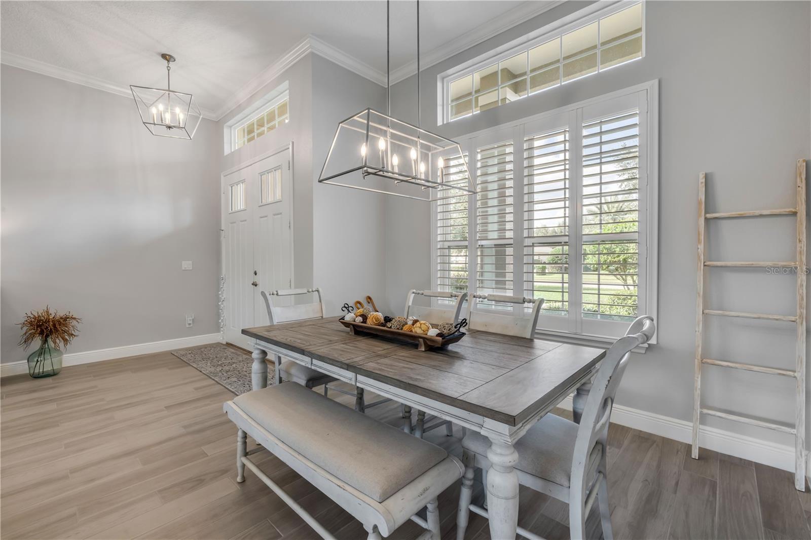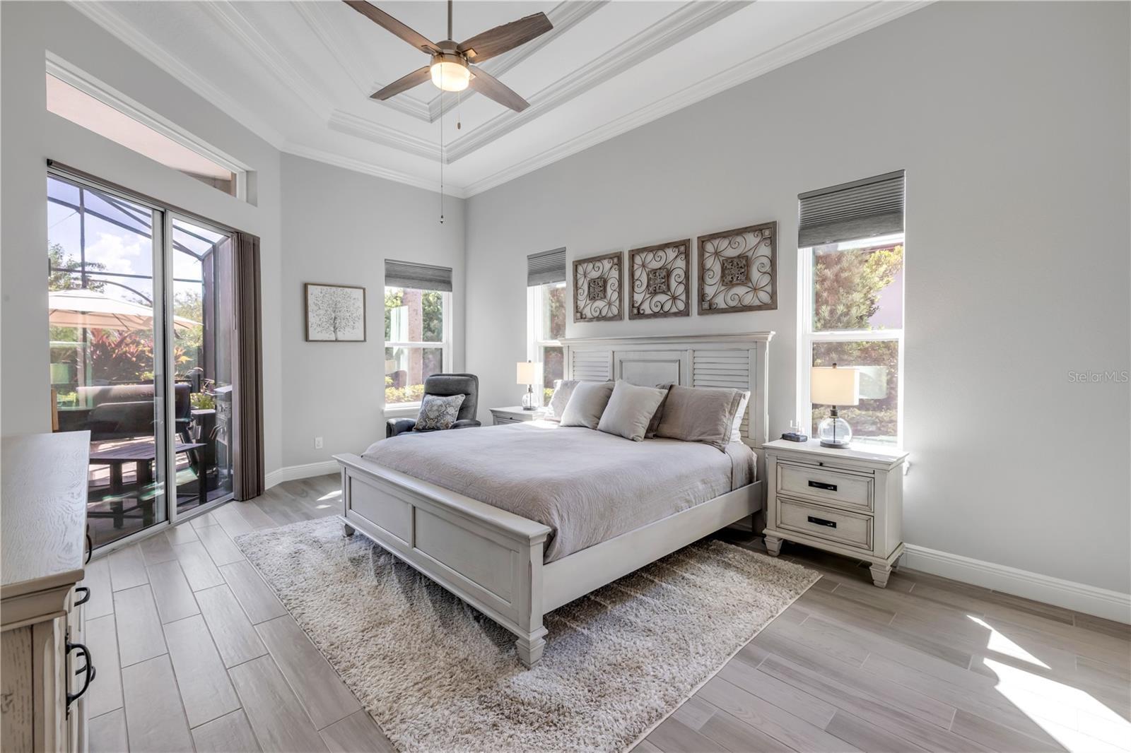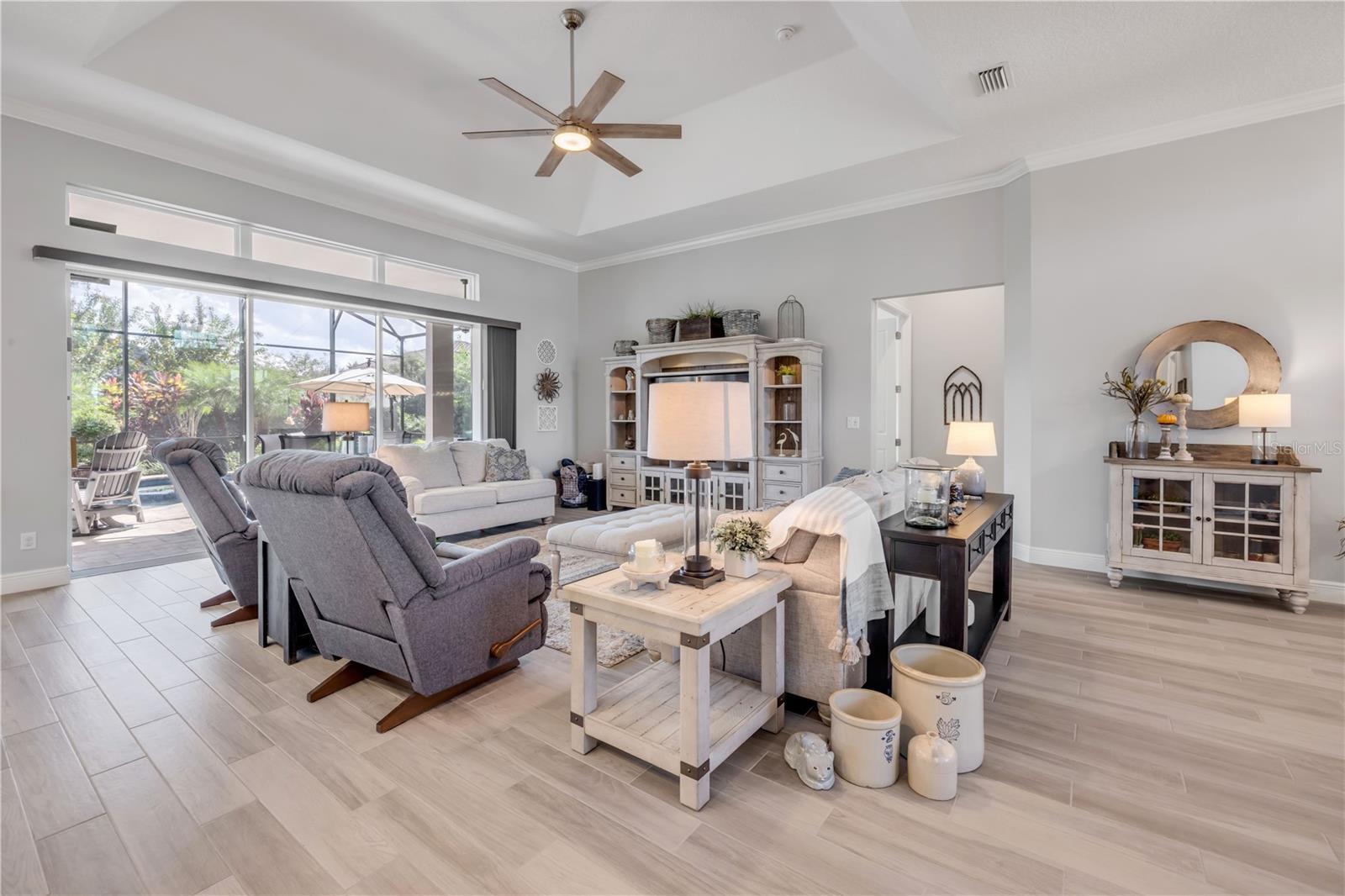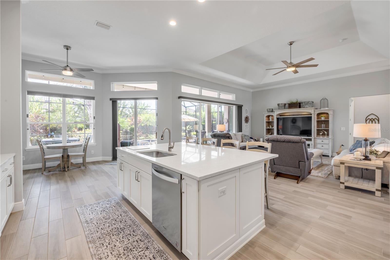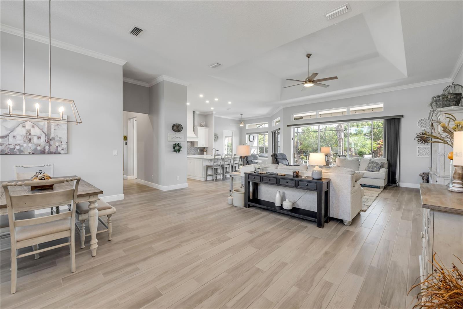 - Attic Ventilator, Ceiling Fans(s), Eat-in Kitchen, High Ceilings, Living Room/Dining Room Combo, Open Floorplan, Primary Bedroom Main Floor, Solid Surface Counters, Thermostat, Tray Ceiling(s), Walk-In Closet(s), Window Treatments