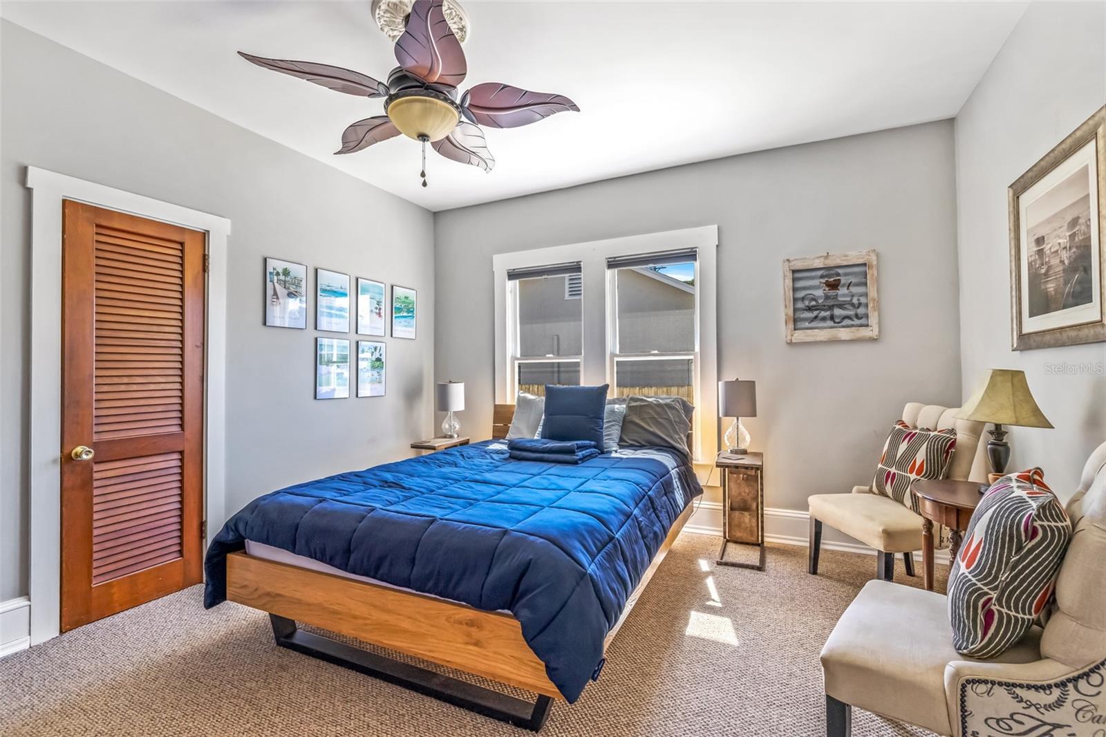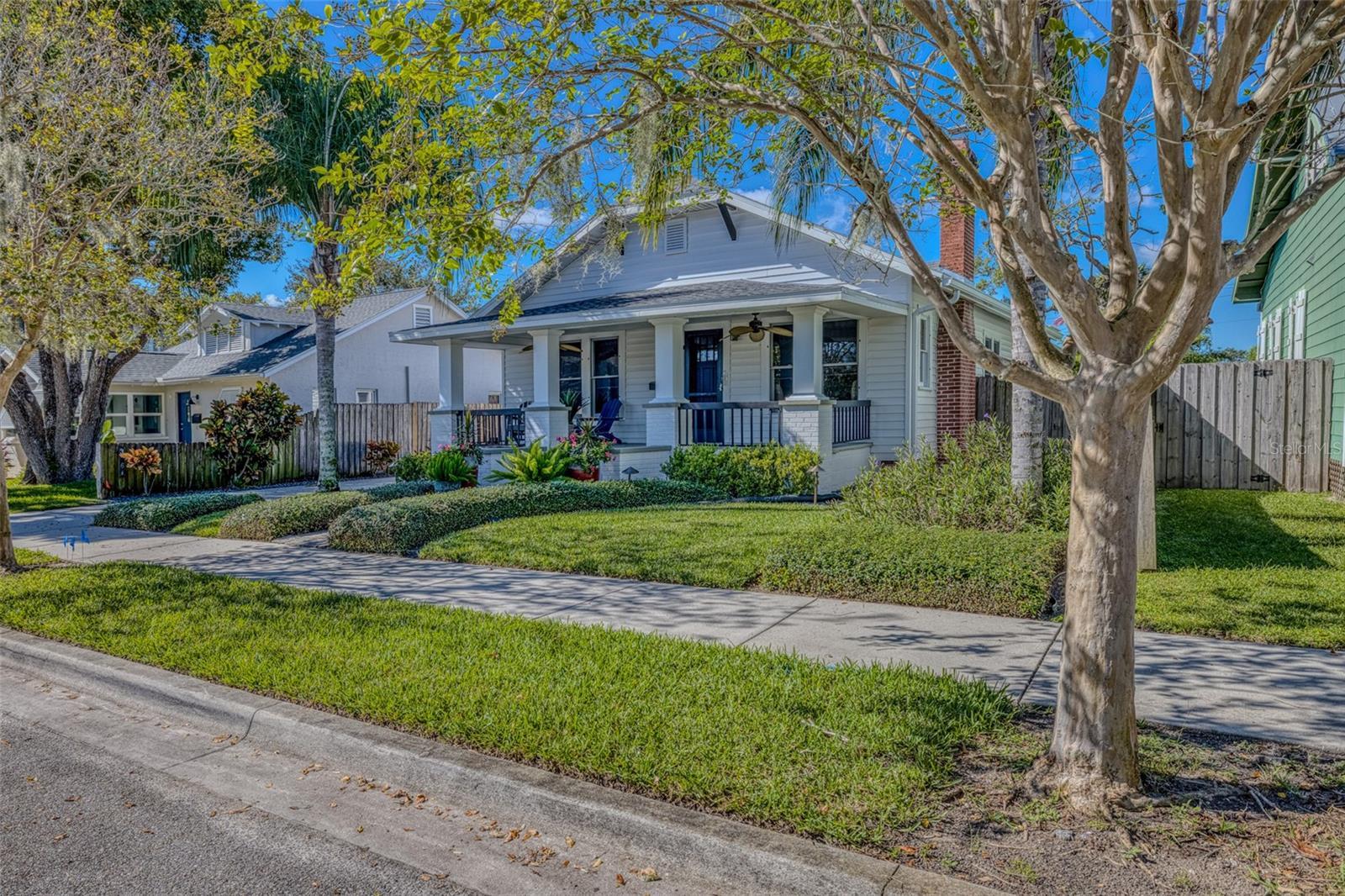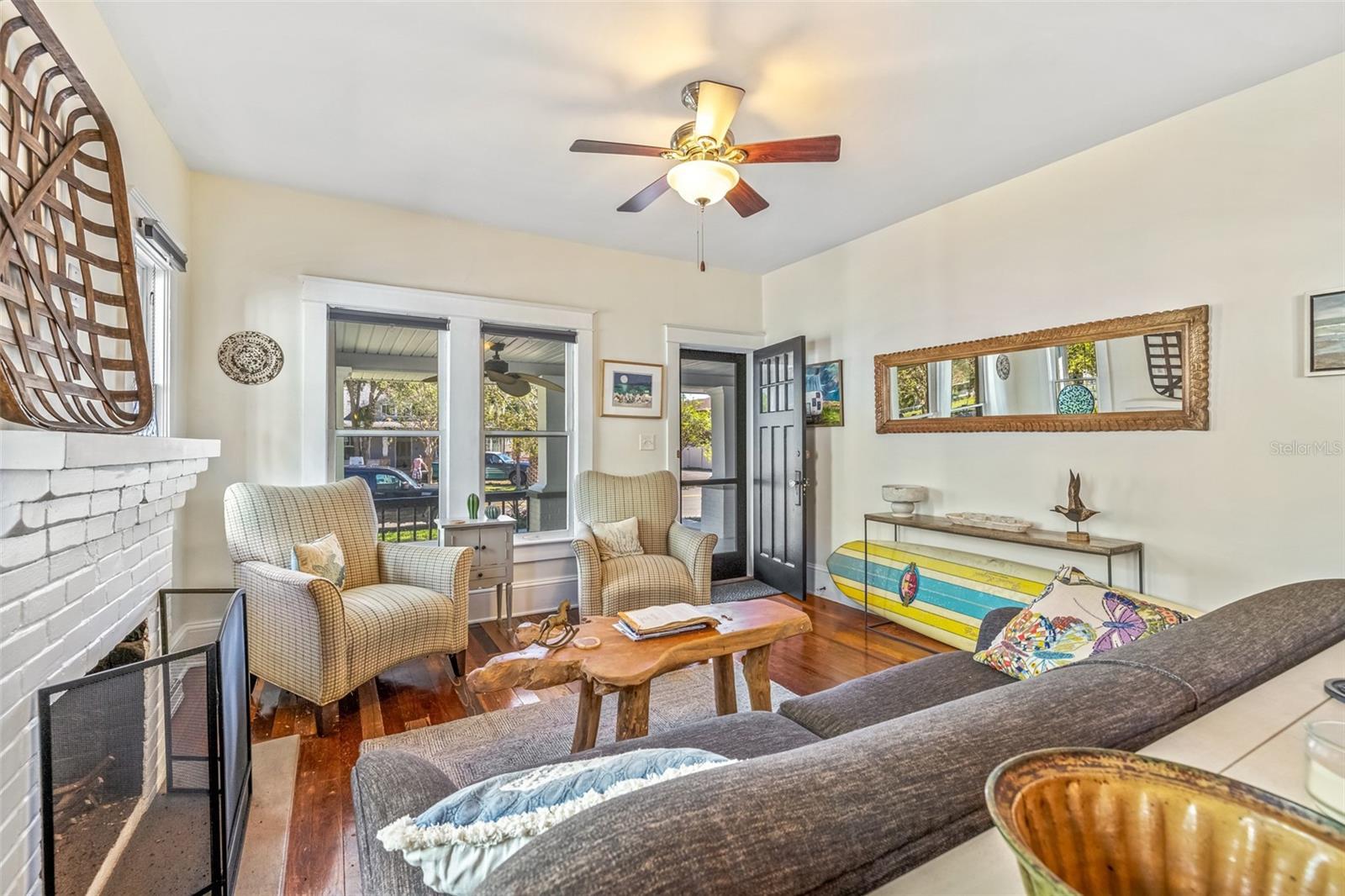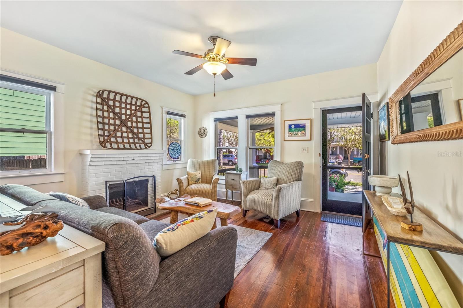 Step into timeless charm with this beautifully maintained historic home. Perfectly situated just minutes from the beach and the vibrant Canal Street downtown district. This residence seamlessly blends 1920s character with thoughtful modern updates. Gorgeous hardwood floors and abundant natural light fill the home, creating a warm and inviting atmosphere. The updated kitchen features granite countertops, stainless steel appliances, and ample cabinetry for storage. The spacious living room centers around a cozy fireplace—ideal for relaxing evenings. The primary suite offers an updated ensuite bath, while the second bedroom provides generous natural lighting and access to a full guest bath. Enjoy breezy Florida evenings on the charming front porch or host gatherings in the private backyard courtyard featuring a gas brick fireplace, raised pergola, and built-in brick seating—an entertainer’s dream. Above the detached two-car garage, you’ll find a two-bedroom, one-bath guest house with a private alley entrance—perfect for extended family or short-term rental income. Both the main home and guest house are zoned for short-term rentals and mixed-use, offering excellent flexibility and investment potential. Additional highlights include a long driveway with ample parking, an electric car charger, and 30-amp service for your RV or boat. Experience the best of Old Florida charm and modern coastal living in this rare historic gem. The home is ideally located just two blocks from local shops, dining, art galleries and a short walk to the intercoastal. You won't want to miss out on this one!!