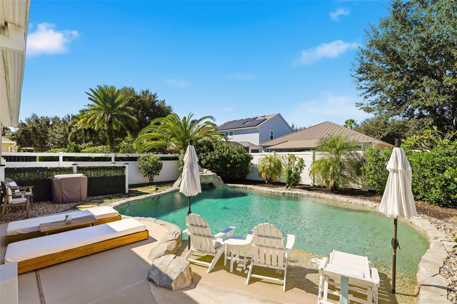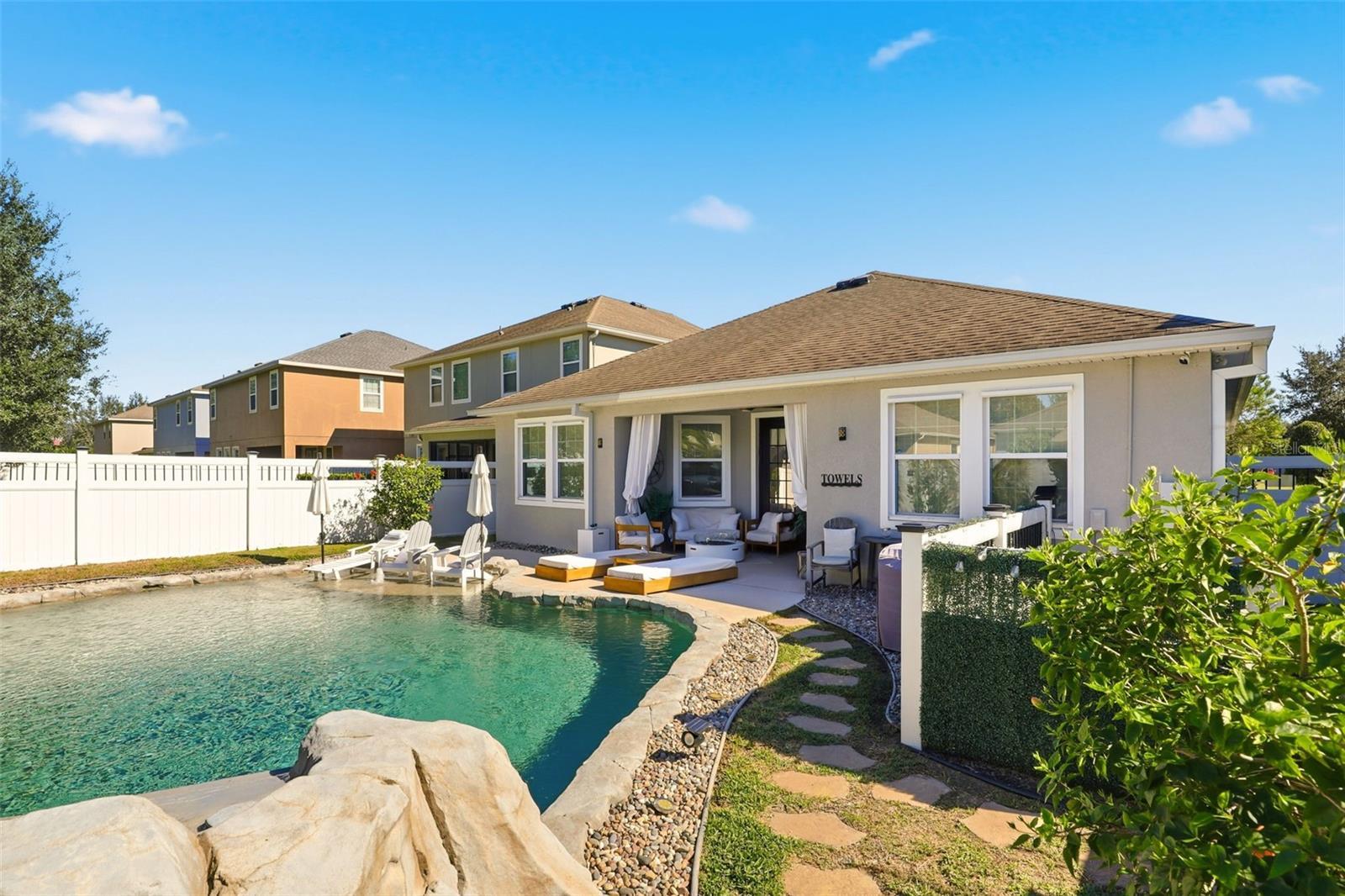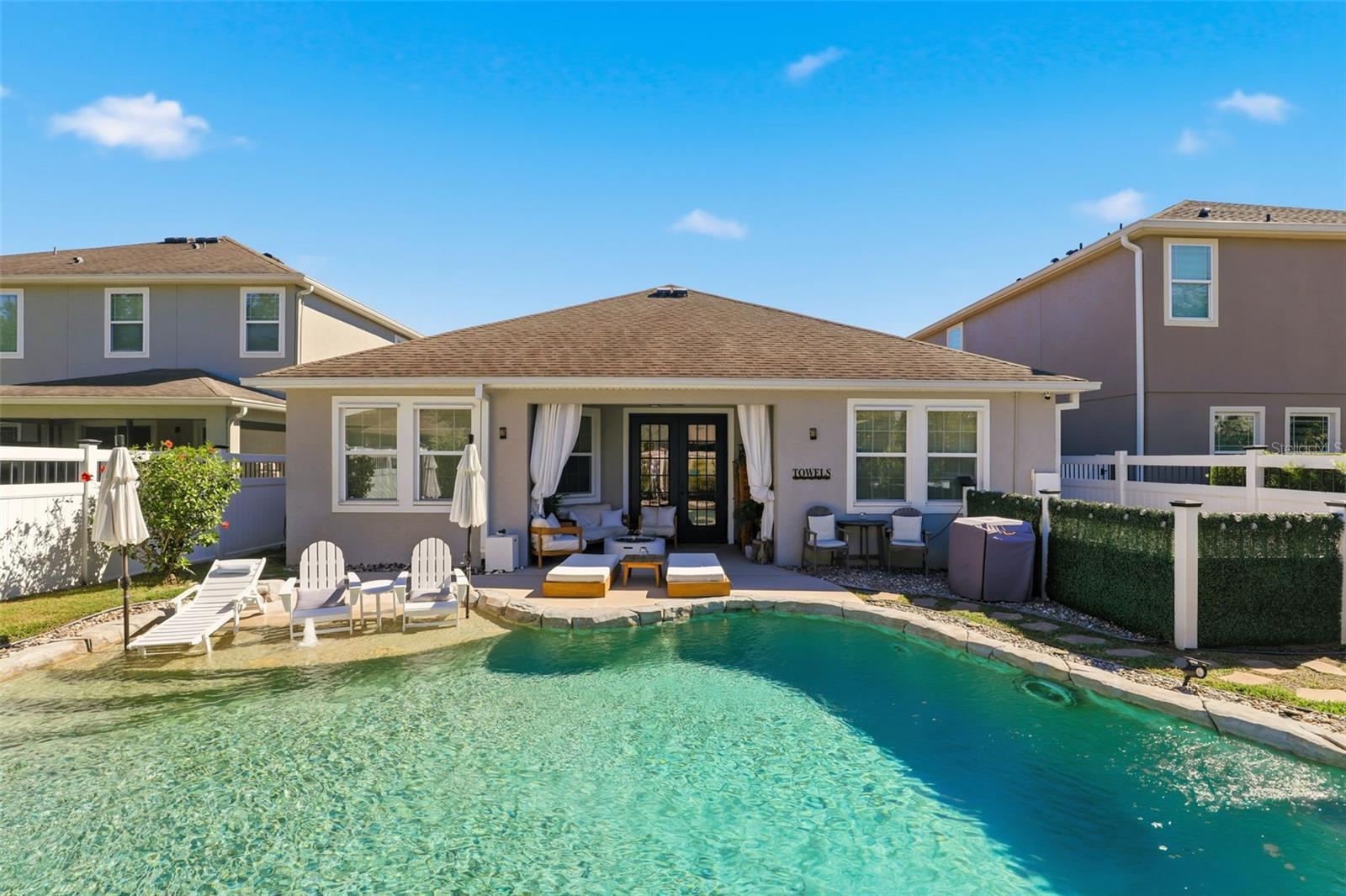 Recently Remodeled Water’s Edge at Lake Nona Home – 3 Beds / 2 Baths with Stunning Custom Pool This beautifully updated Water’s Edge at Lake Nona home is move-in ready and loaded with upgrades! Featuring 3 bedrooms, 2 bathrooms, and a gorgeous custom-designed pool, this rare find offers both luxury and comfort. Step outside to your faux-rock pool oasis complete with overflow protection, Badu swim jet, waterfall, and a grotto with wrap-around seating—perfect for entertaining or relaxing. Inside, the primary suite features a custom walk-in closet and an upgraded ensuite bath with a river rock basin and new glass enclosure. All bedrooms boast 8” x 4’ hand-scraped wood-look tile flooring, laid in a herringbone pattern in the primary and diagonal in the others. The main living areas showcase upgraded porcelain tile set diagonally, crown molding, and wainscoting for a refined touch. Furnishings, and all gym equipment are negotiable. The spacious kitchen includes granite countertops, stainless steel appliances, glass subway tile backsplash, and a cozy breakfast nook. Enjoy abundant natural light with extra windows and seven solar tubes throughout the home. Additional features include: Dedicated laundry room with washer and dryer included Two-car garage with raised storage bins for extra space Hurricane-rated vinyl and aluminum fencing for enhanced privacy ADT security system with motion detectors, glass break sensors, infrared doorbell camera, and full exterior camera coverage Hydrawise automated sprinkler system with 6 zones This home combines elegant design, thoughtful upgrades, and modern convenience—all within one of Lake Nona’s most desirable gated communities.