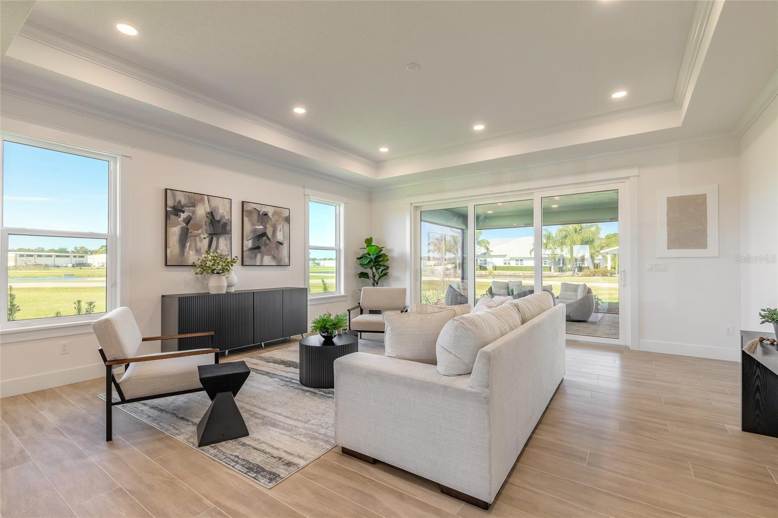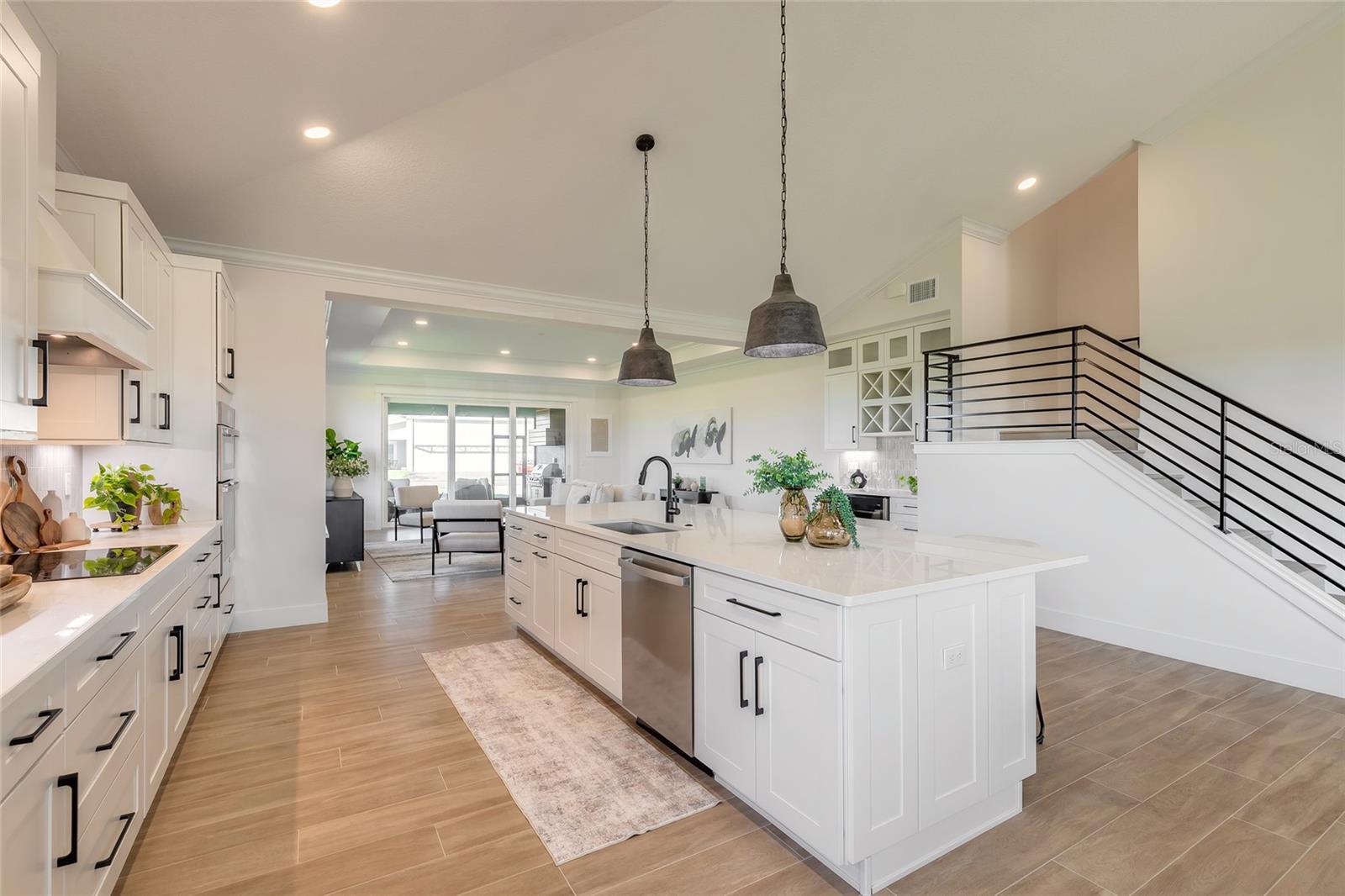 - Built-in Features, Crown Molding, Dry Bar, Eat-in Kitchen, High Ceilings, Kitchen/Family Room Combo, Open Floorplan, Primary Bedroom Main Floor, Solid Surface Counters, Solid Wood Cabinets, Thermostat, Walk-In Closet(s)