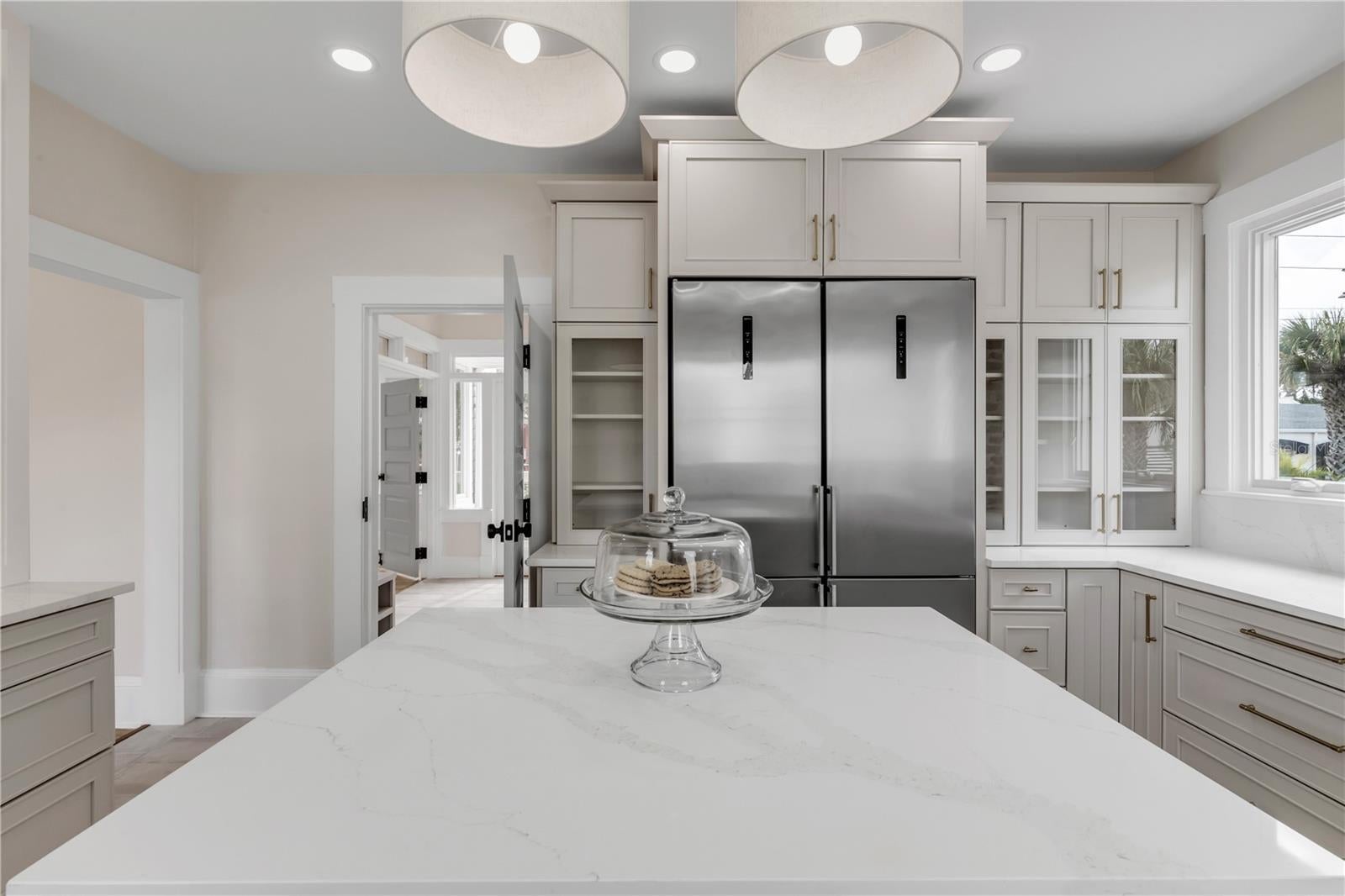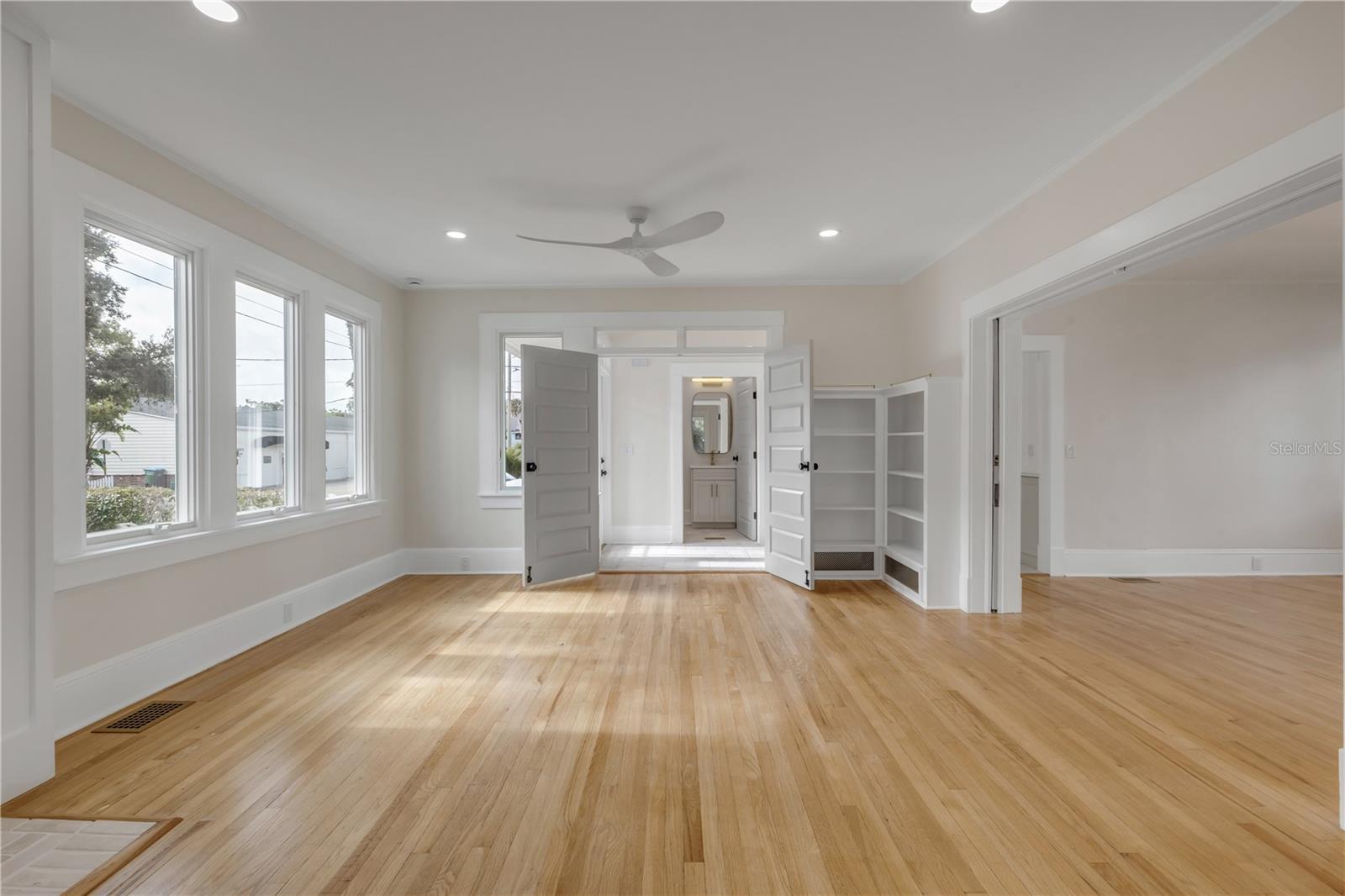 - Built-in Features, Ceiling Fans(s), High Ceilings, Living Room/Dining Room Combo, PrimaryBedroom Upstairs, Solid Wood Cabinets, Stone Counters, Thermostat, Walk-In Closet(s)