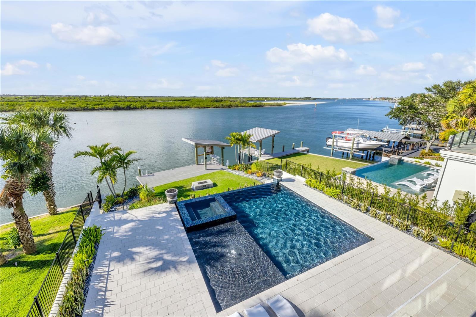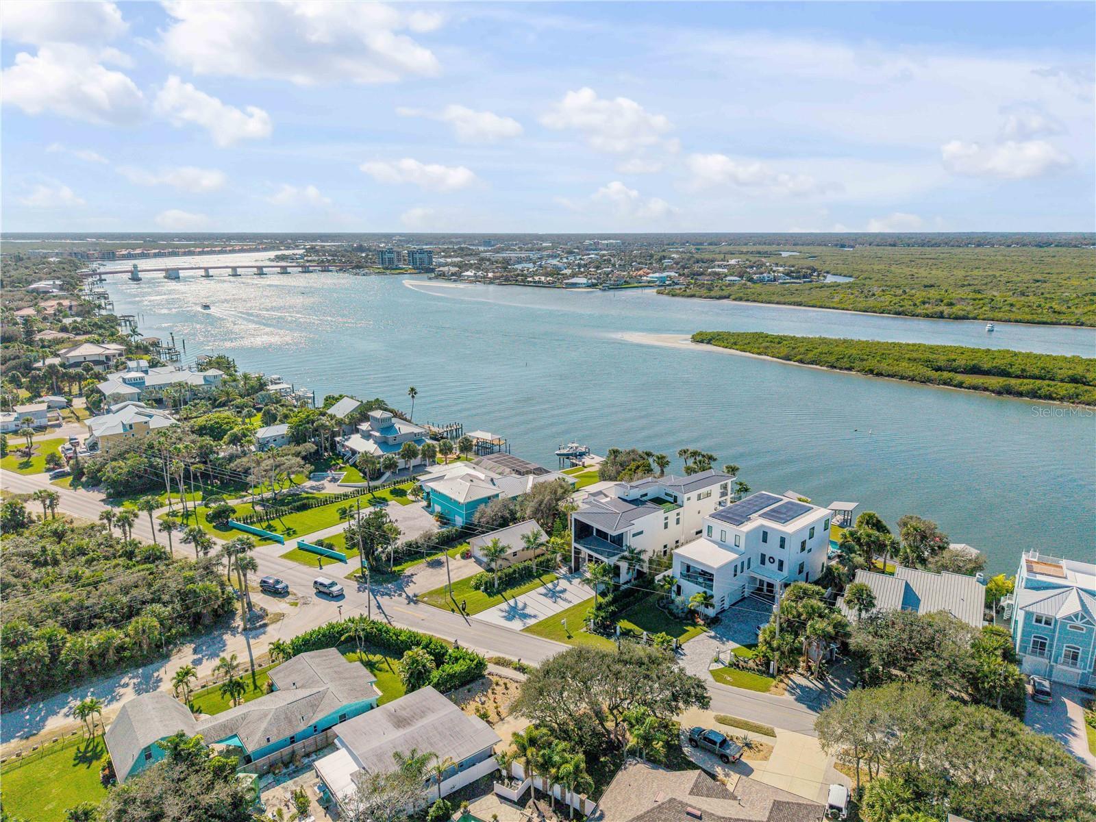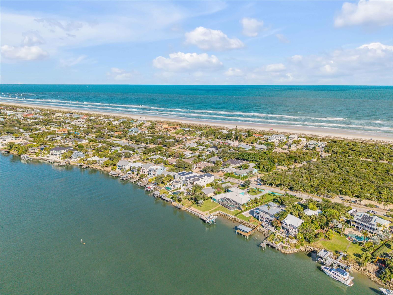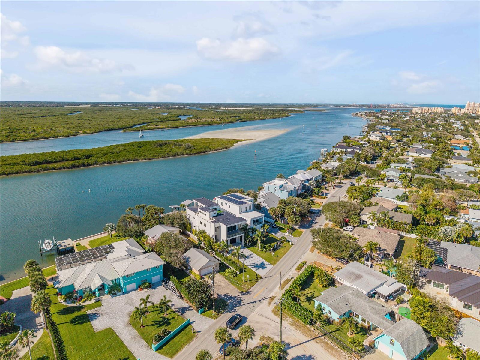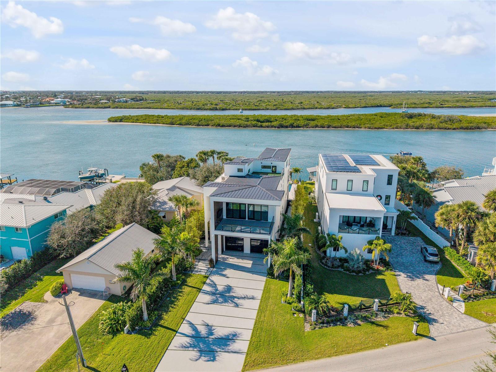 A rare intersection of modern architecture, true deep-water dockage, and a two block walk-to-the-beach living. This never-lived-in year 2024-2025 custom build is on the Intracoastal waterway in one of New Smyrna Beach’s most coveted waterfront corridors. Designed for people who don’t want a “coastal cliché,” this home delivers clean lines, dramatic volume, and walls of glass that pull the water and sky into the living spaces. A private automatic elevator or switch back staircase connects all three levels, creating effortless flow for everyday living and entertaining. The main living level opens to a showpiece outdoor setting: an infinity-edge pool and spa and expansive waterfront terrace built for sunsets, cocktail hours, and quiet mornings that feel like a permanent vacation. For boaters, this is the real deal—deep water access and a private slip accommodating up to a ~50’ yacht positioned for the kind of spontaneous “dock-and-go” lifestyle most waterfront listings only promise. And when you want sand instead of sea, the beach is just a short walk away. Every element is new, crisp, and elevated: high-end finishes, thoughtful lighting, refined materials, and modern systems—all in a home built to feel both striking and comfortable. This isn’t just a home. It’s a waterfront compound for the buyer who values privacy, design, and the freedom to live on the water without sacrificing sophistication. If you’ve been searching for something truly different—a modern waterfront estate that would feel at home in South Florida, offered in a more relaxed, livable coastal setting—this is your moment.