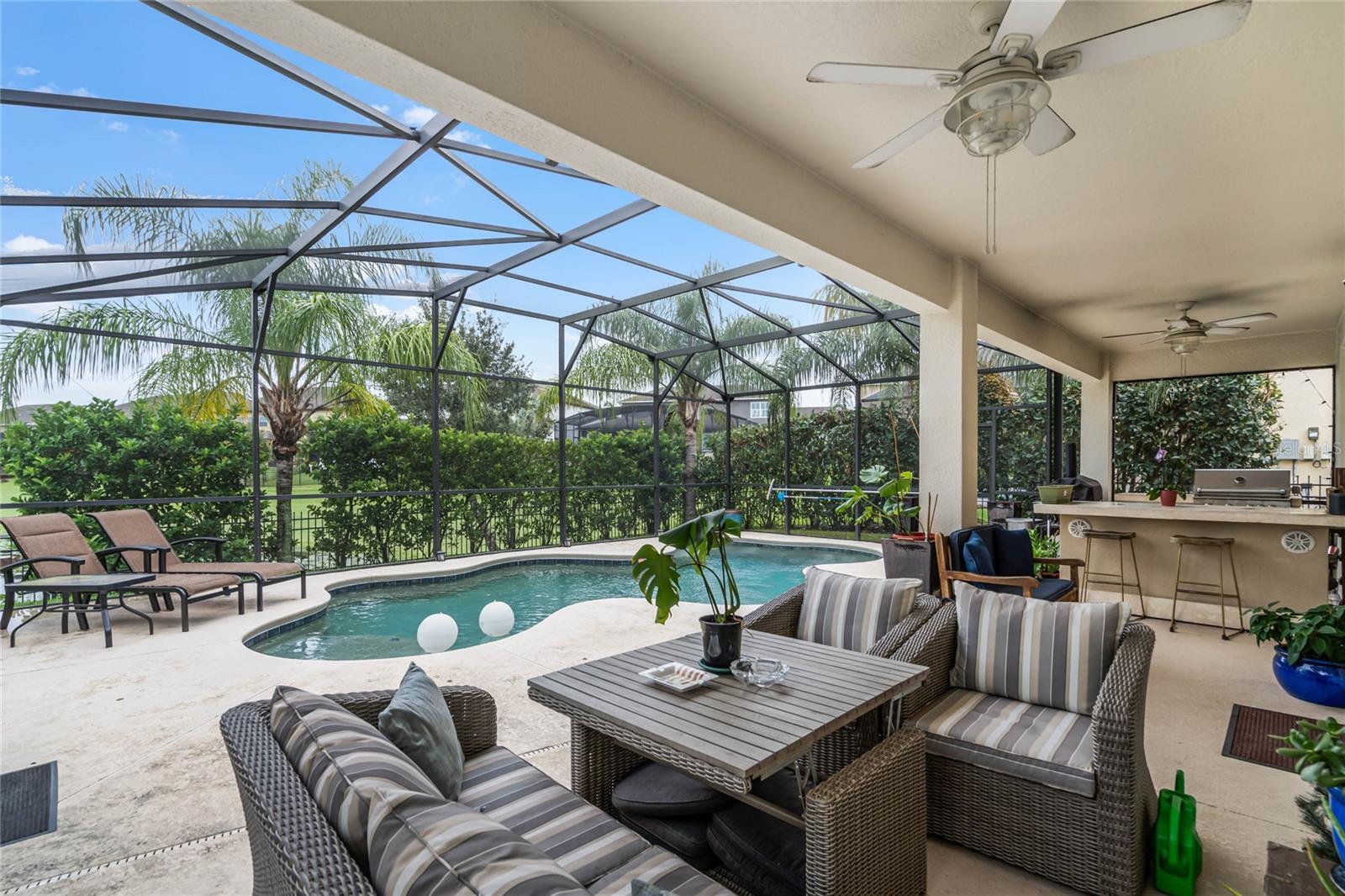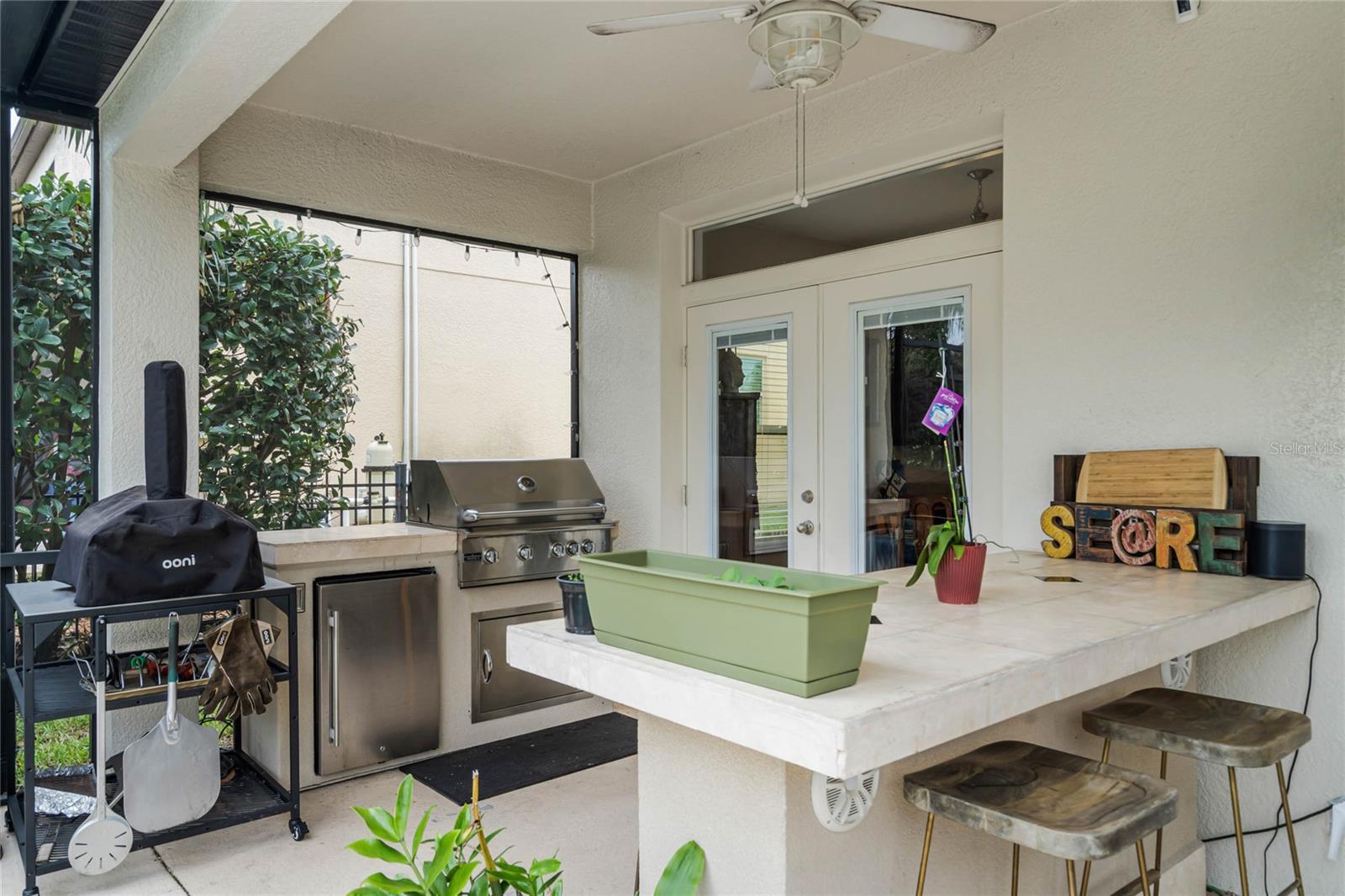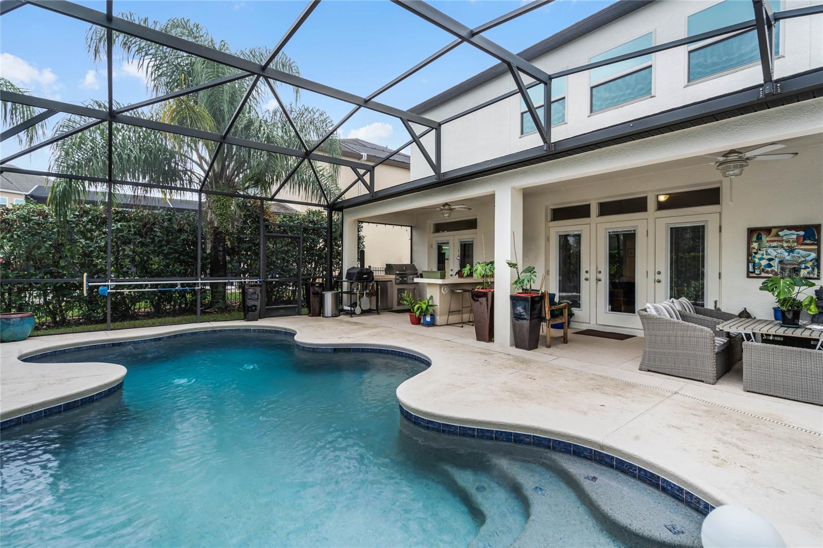 - French Doors, Irrigation System, Lighting, Outdoor Grill, Outdoor Kitchen, Rain Gutters, Sidewalk