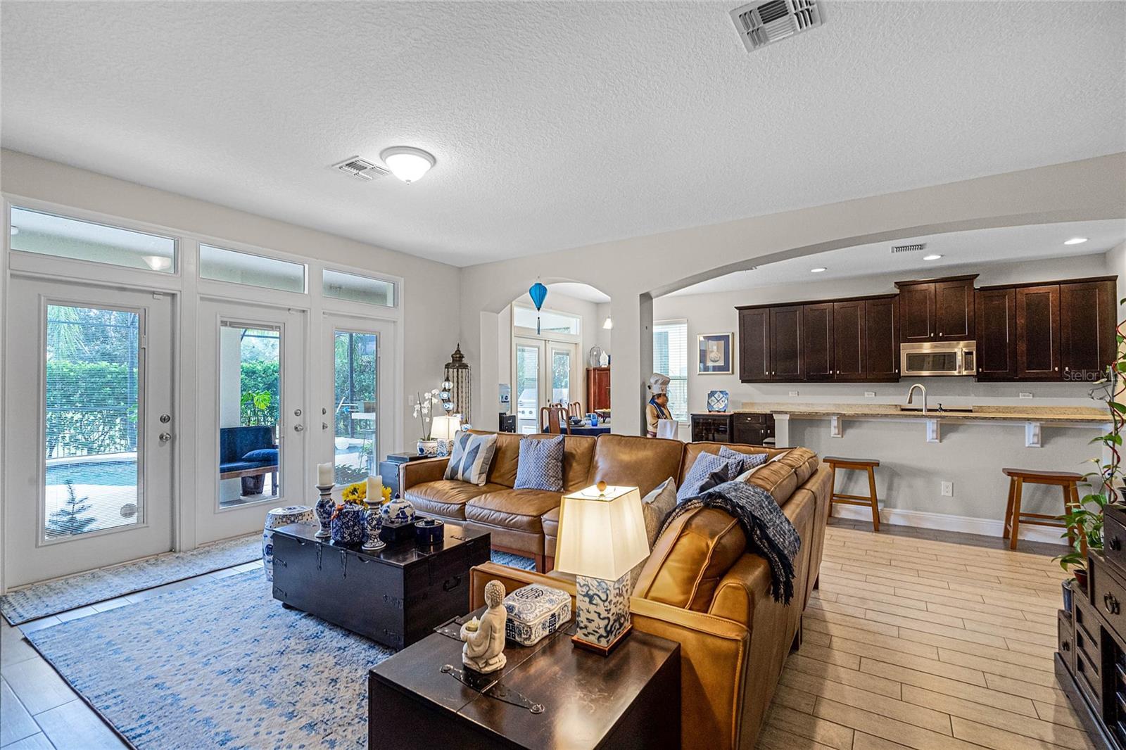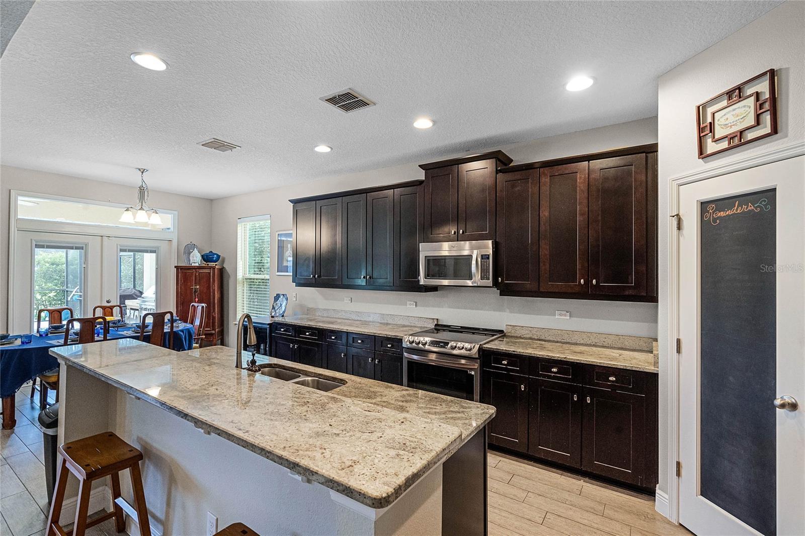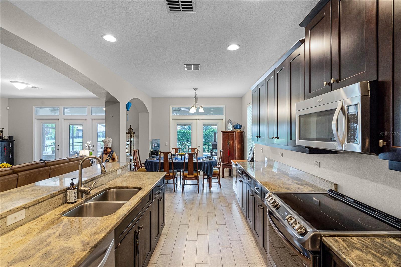 - French Doors, Irrigation System, Lighting, Outdoor Grill, Outdoor Kitchen, Rain Gutters, Sidewalk