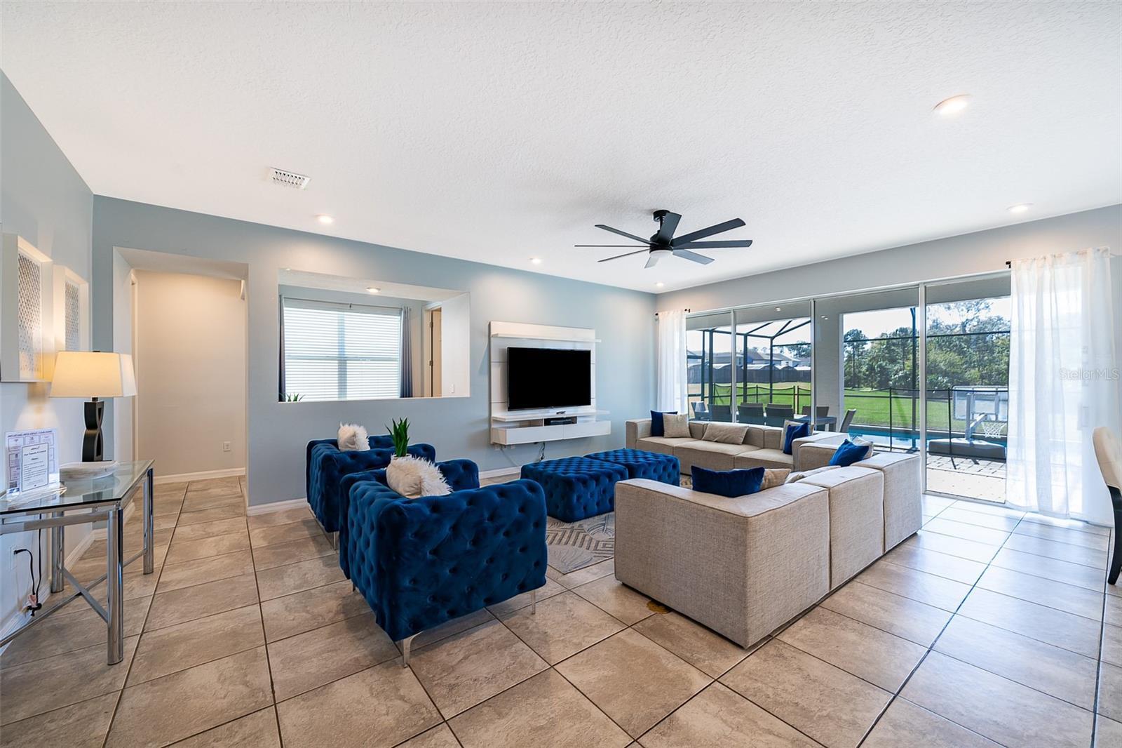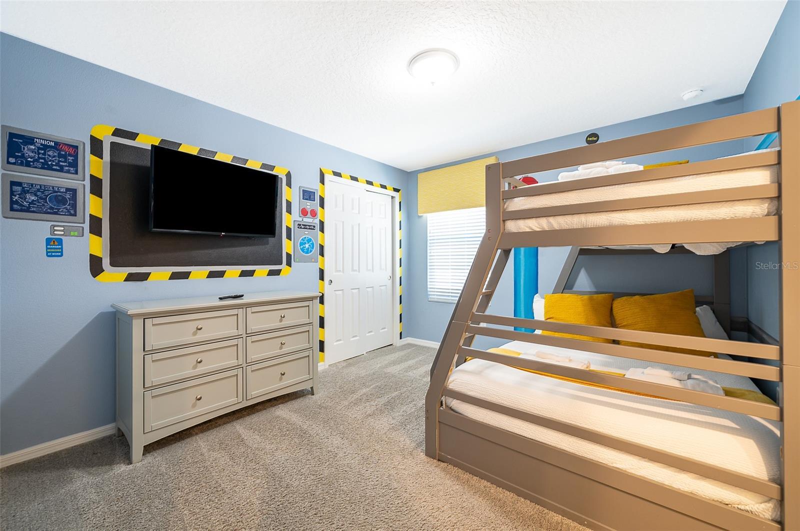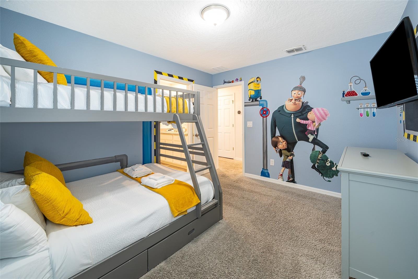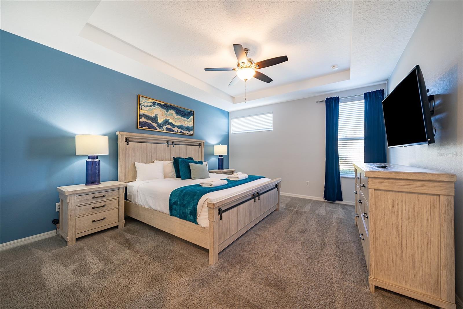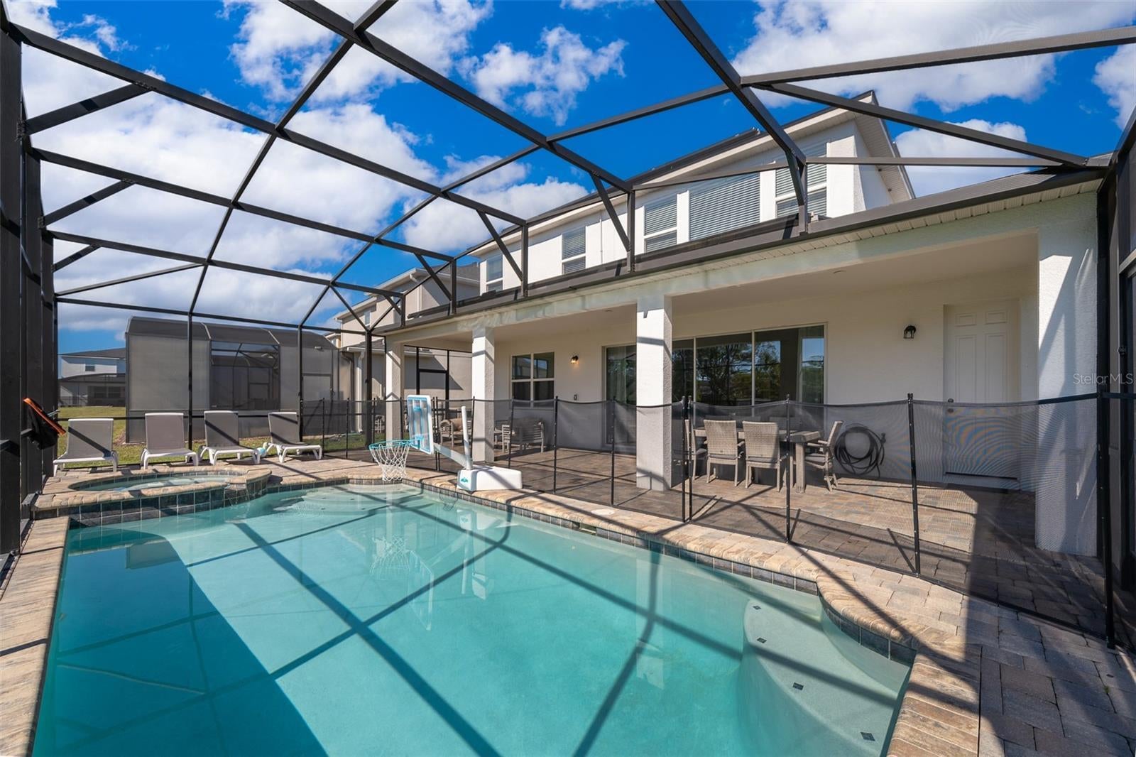 Under contract-accepting backup offers. *** MAJOR PRICE IMPROVEMENT *** Stunning Fully Furnished 8-Bedroom, 6-Bathroom Pool Home! Welcome to this spectacular two-story vacation home in the highly sought-after resort community of Solara. With 8 spacious bedrooms and 6 bathrooms, this fully furnished residence offers ample space and comfort for large families or groups. Located just minutes from Central Florida’s world-famous theme parks, shopping, and dining, this property promises the perfect vacation or investment home. Main Floor Features: The first floor boasts two inviting bedrooms, including a luxurious primary suite with an en-suite bath. A second bedroom features convenient access to a bathroom just across the hall and leads directly to the pool deck. The open-concept kitchen, living room, and dining area flow seamlessly together, creating an ideal space for entertaining. From here, enjoy stunning views of the screened-in pool area and spa, which overlooks a peaceful pond and conservation area—offering ultimate privacy with no rear neighbors. The covered lanai provides a perfect spot for alfresco dining or relaxing, whether soaking up the sun or staying cool during a passing rain shower. Upstairs, discover six additional bedrooms, each with its own en-suite bathroom. Three of the rooms are themed and tastefully decorated, including Mickey Mouse, Buzz Lightyear from Toy Story, and the lovable Minions, adding a fun and imaginative touch. The media room is the perfect spot to unwind with movies or games on the PlayStation, ensuring entertainment for all ages. Two bedrooms share a convenient Jack-and-Jill bathroom, while the Mickey Mouse room has its own hall bath. Save money on your power bill with Sunnova solar panels. With rising electric costs, this provides a peace of mind so you can focus on fun! Located in the coveted Solara Resort, known for its family-friendly amenities and guard-gated entry. Enjoy access to the stunning clubhouse, featuring a FlowRider surf simulator, a fully-equipped fitness center, a restaurant, a sundry store, and a beautiful resort-style pool with pool side cabanas and a full size soccer field. The community offers everything you need to relax and play, right at your doorstep. HOA dues include lawn care, daily valet trash pick up, and cable & internet. Perfect Location with easy access to world-class theme parks (only 8 miles to WDW), shopping centers, and dining, this home is in a prime location to enjoy all that Central Florida has to offer. Whether you're looking for a vacation home or an income-generating investment property, this home checks all the boxes. Don’t miss the opportunity to make this stunning, turnkey home your own - come and see all this home has to offer before it's gone!