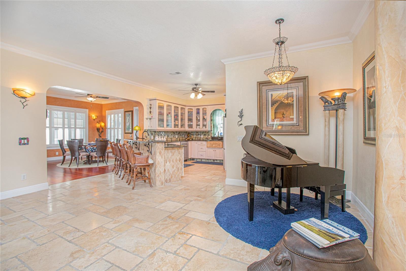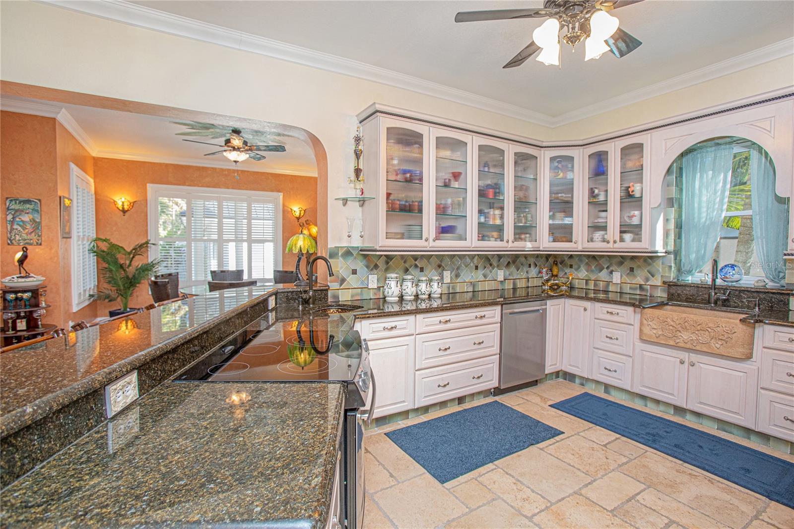 - Built-in Features, Ceiling Fans(s), Crown Molding, Eat-in Kitchen, High Ceilings, Kitchen/Family Room Combo, Living Room/Dining Room Combo, Open Floorplan, Solid Wood Cabinets, Split Bedroom, Stone Counters, Thermostat, Walk-In Closet(s), Window Treatments