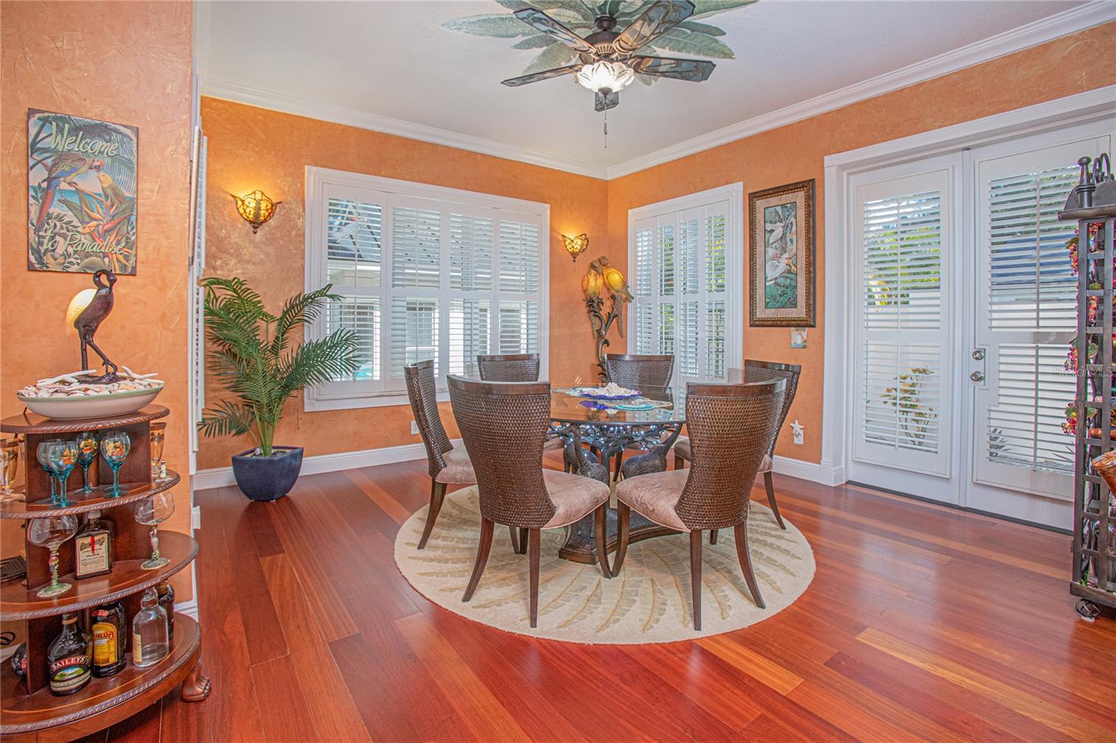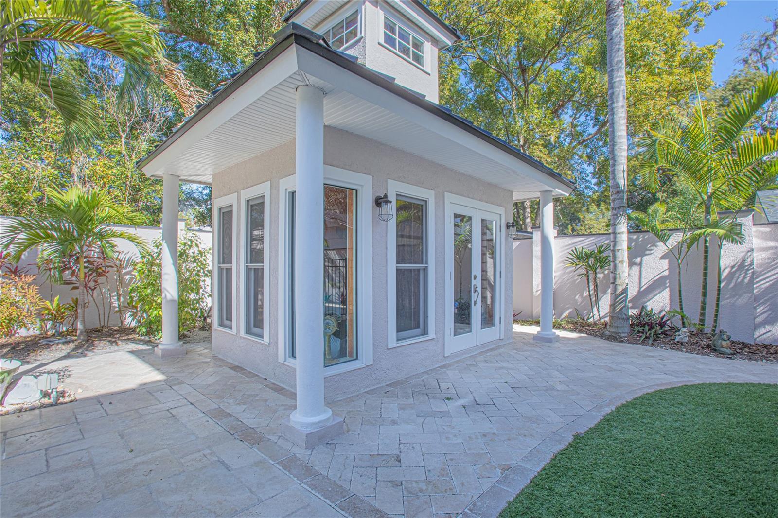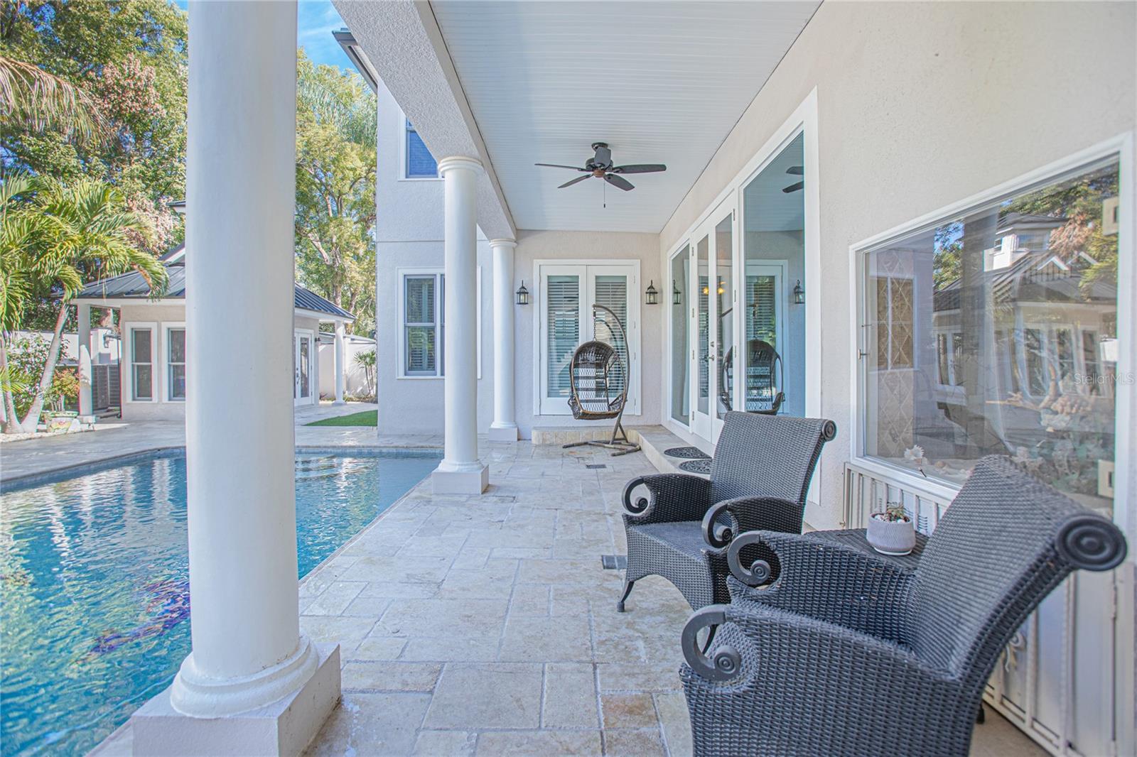 Experience the blend of timeless elegance and modern luxury in this Maitland estate a block away from Lake Sybelia. Completely renovated in 2007, every detail of this home exudes sophistication. A spacious paver driveway leads to a two-car garage, framed by lush tropical landscaping, decorative stone accents, and a charming fountain, creating an inviting first impression. The grand foyer welcomes you with soaring ceilings, intricate wrought iron railings, and abundant natural light. The Great Room is designed for both comfort and style, featuring expansive windows, French doors that open to the backyard oasis, and concert speakers embedded in the ceiling for an immersive audio experience. The gourmet kitchen is a chef’s dream, boasting custom cabinetry with glass-paneled doors, granite countertops, a farmhouse sink, and high-end stainless steel appliances. Adjacent to the kitchen, the dining area offers rich hardwood flooring, plantation shutters, concert speakers, and direct access to the outdoor spaces. The first-floor family room provides a cozy retreat with bold tropical-inspired decor, a built-in entertainment center, double-door access to the backyard, and ceiling-embedded speakers. Upstairs, the loft overlooks the grand foyer, offering a versatile space for relaxation. The primary suite is a true sanctuary with rich wood flooring, a private balcony, concert speakers, and a spa-like en-suite featuring a rain shower, shower bench, dual vanities, and a classic clawfoot tub. Outdoor living is elevated with a resort-style pool, a covered patio with elegant columns, and a second-floor balcony that spans the width of the home. The backyard is a private paradise, complete with lush greenery, a pool house, and ample space for entertaining.