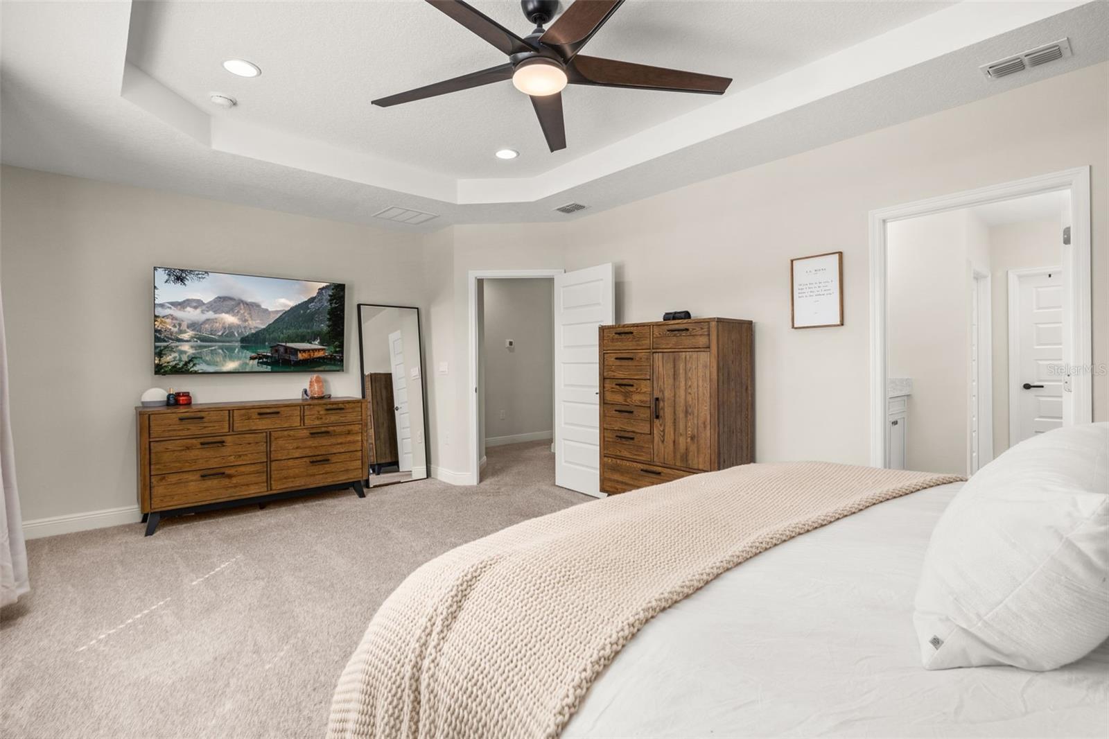 - Ceiling Fans(s), Crown Molding, Eat-in Kitchen, High Ceilings, Open Floorplan, PrimaryBedroom Upstairs, Smart Home, Thermostat, Tray Ceiling(s), Walk-In Closet(s), Window Treatments