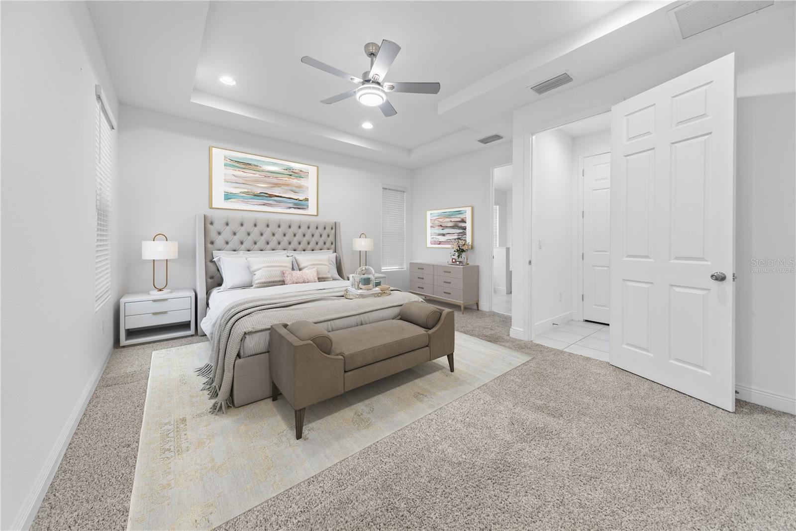 - Built-in Features, Ceiling Fans(s), High Ceilings, Open Floorplan, Primary Bedroom Main Floor, Solid Surface Counters, Split Bedroom, Thermostat, Tray Ceiling(s), Walk-In Closet(s), Window Treatments