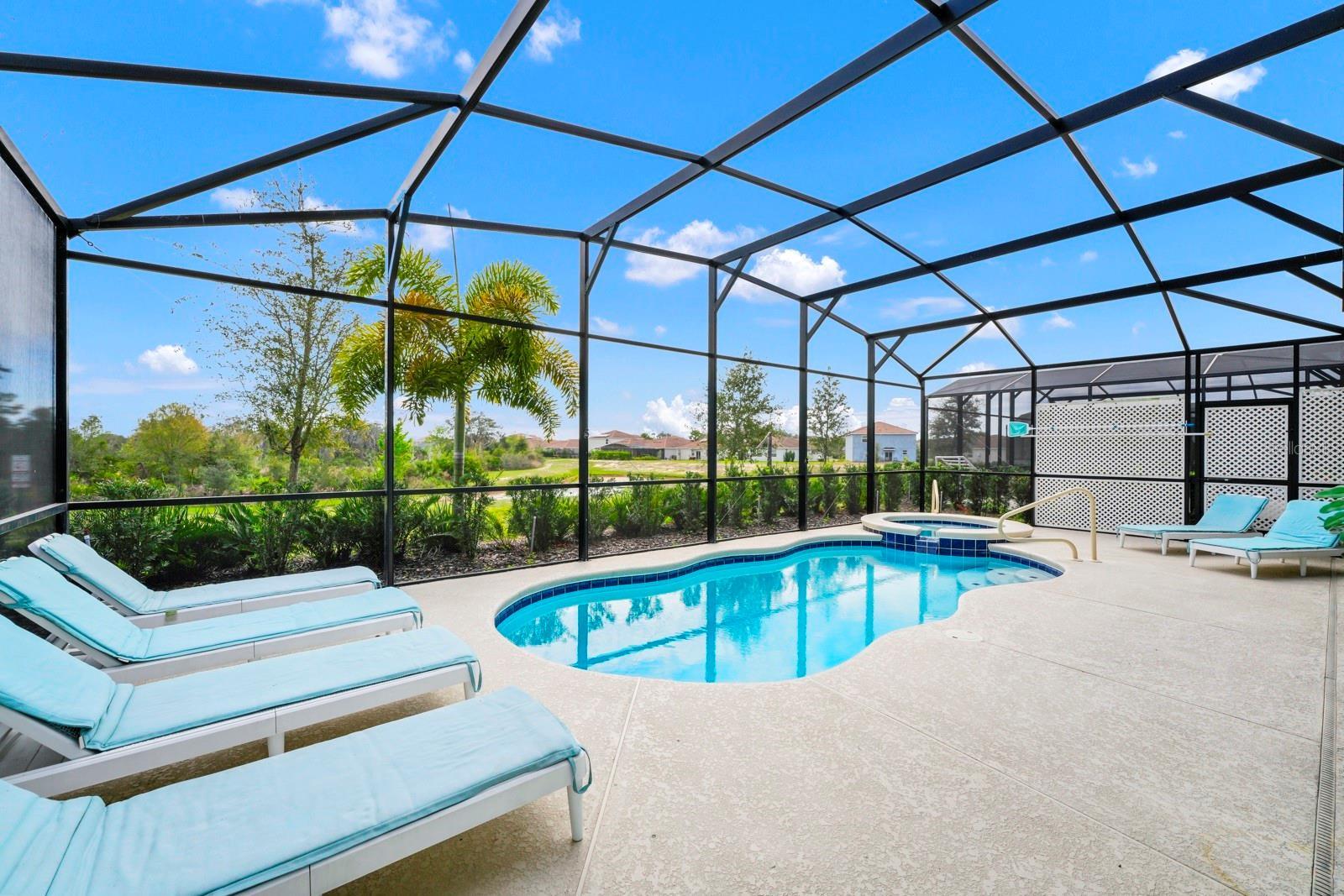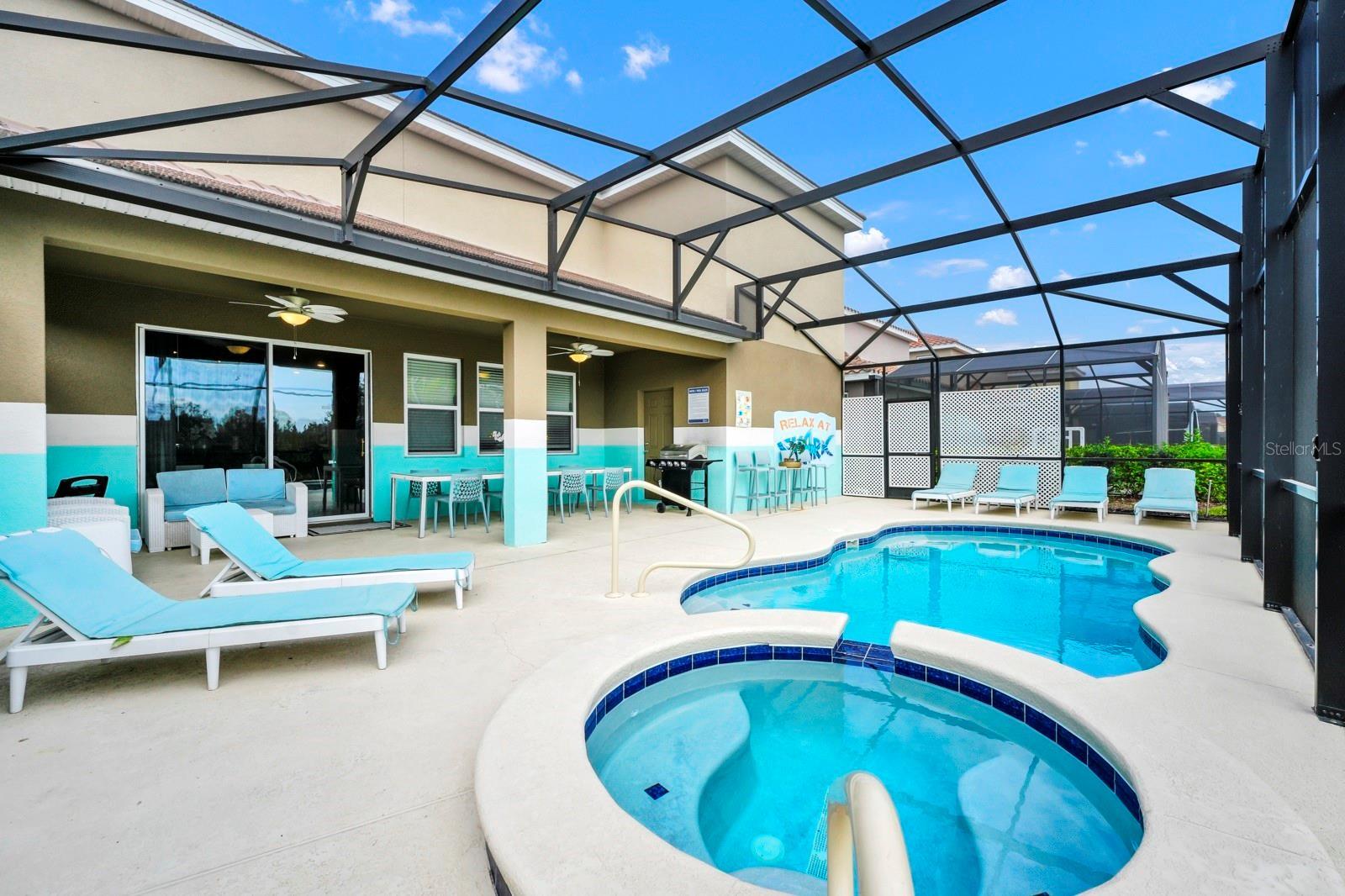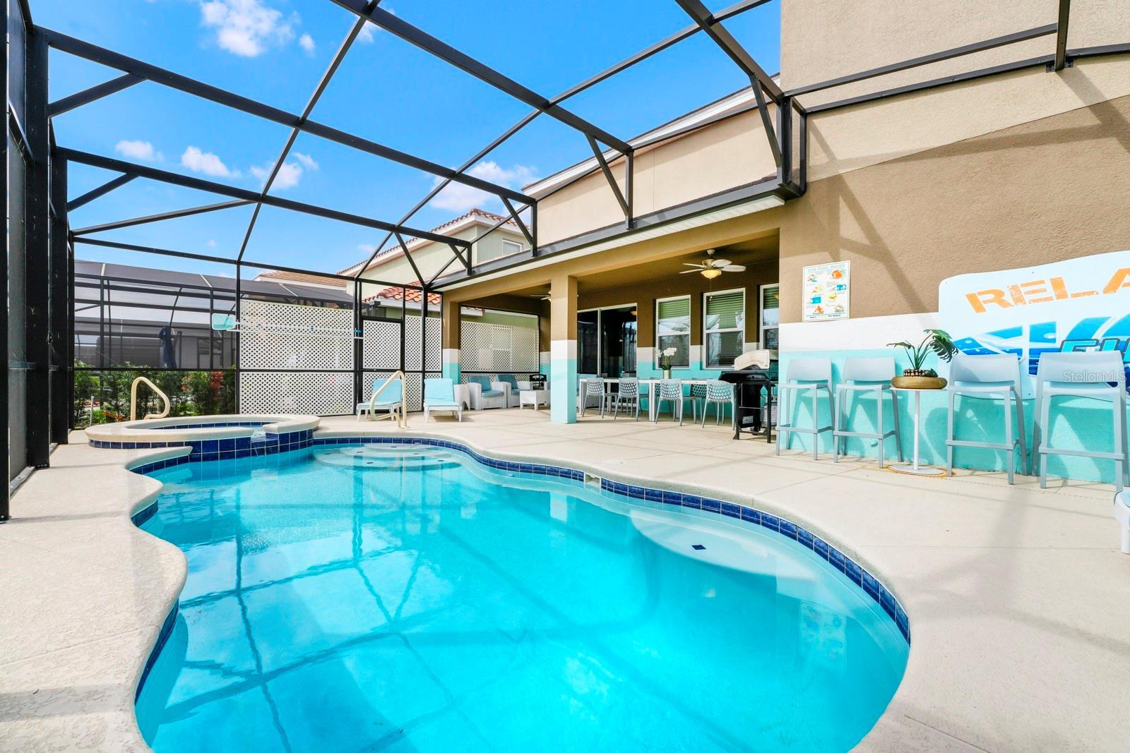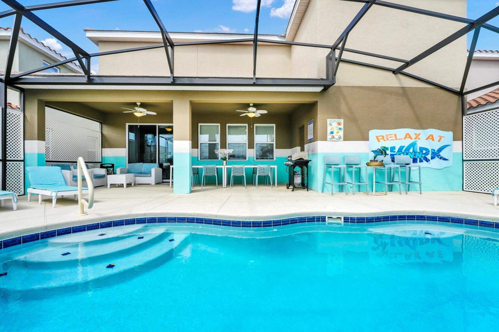 You can own this investment or vacation home in the Solterra Resort? This TURNKEY house, professionally designed 7-bedroom, 5.5-bathroom home is nestled in a gated and guarded community that offers world-class amenities, including a thrilling water slide, lazy river, splash zone, theater room, sports field, restaurants, and a bar. The state-of-the-art clubhouse provides access to a resort-style pool, hot tub, fully equipped fitness center, tennis and volleyball courts, playground, and recreational areas. Plus, there's a poolside café to relax and enjoy food and drinks! As you step inside, you'll be greeted by a bright and open floor plan designed for comfort and style. The main living and dining areas flow seamlessly into the modern kitchen, creating the perfect space for entertaining family and friends. A beautiful coral and seashell-themed King bedroom welcomes you upon entry, while the first-floor master suite boasts an en-suite bathroom with patio access. For entertainment, the Star Wars-themed game room is a standout feature, equipped with theater seating, an arcade game system, LED lighting, a pool table, and an air hockey table—a true paradise for guests of all ages! Upstairs, a surf-themed loft serves as an additional relaxation space, surrounded by five beautifully decorated bedrooms, including another spacious master suite with a private bath. Outside, the private pool and jacuzzi provide the perfect retreat, with no rear neighbors for added privacy. Don't miss this opportunity to own in one of Central Florida’s top short-term rental communities!