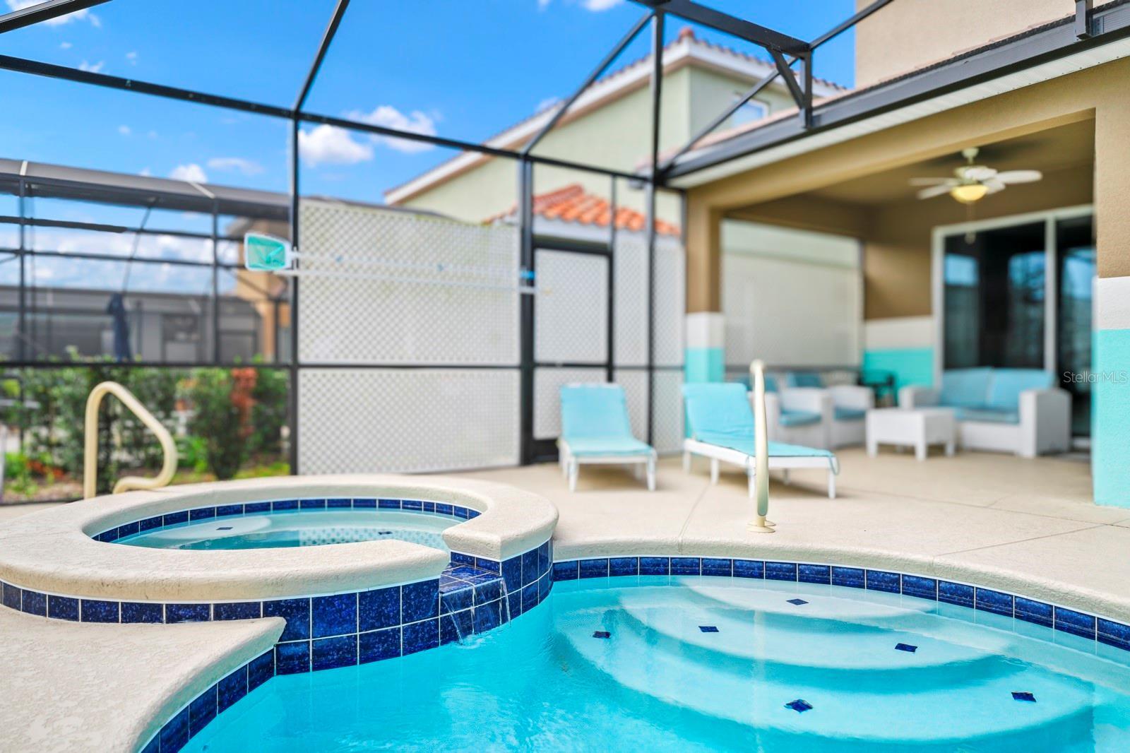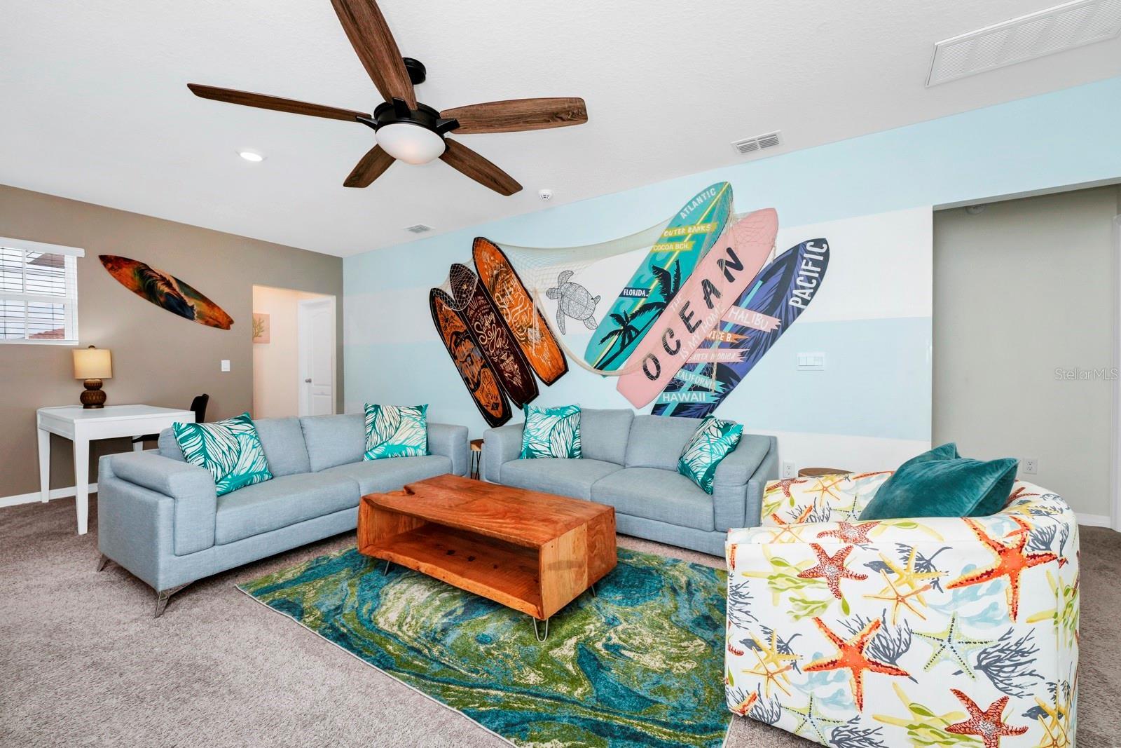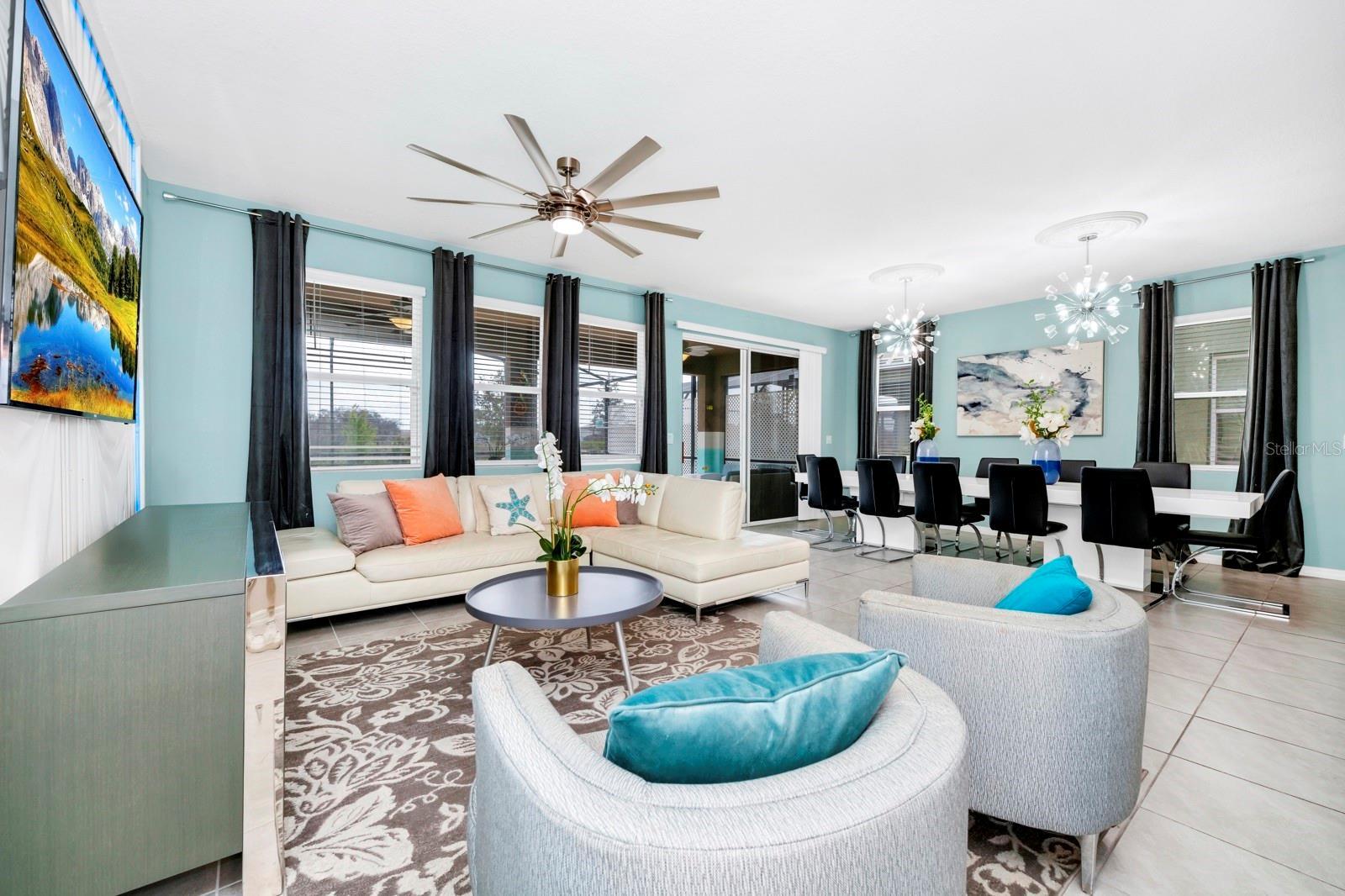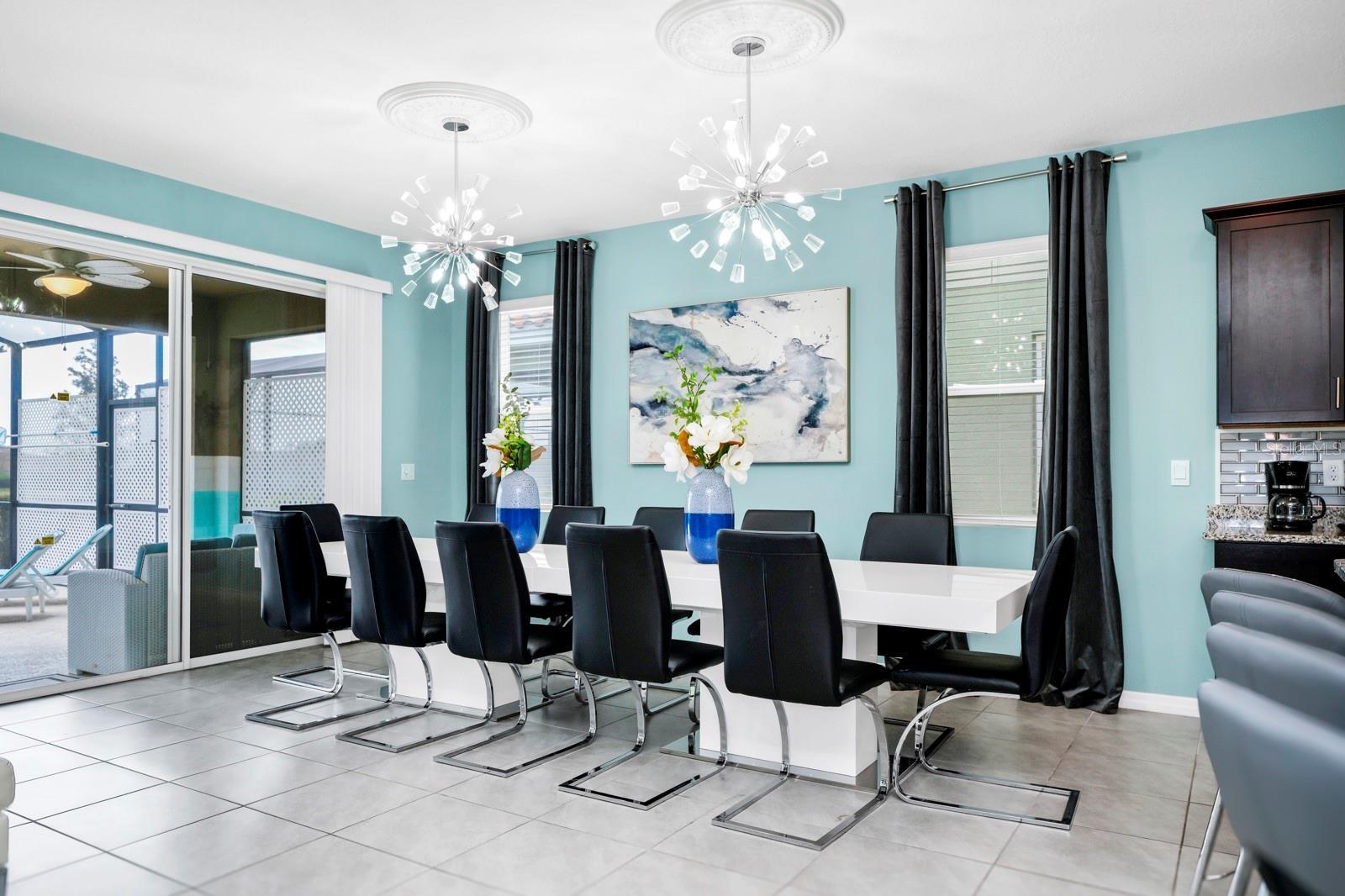 You can own this investment or vacation home in the Solterra Resort? This TURNKEY house, professionally designed 7-bedroom, 5.5-bathroom home is nestled in a gated and guarded community that offers world-class amenities, including a thrilling water slide, lazy river, splash zone, theater room, sports field, restaurants, and a bar. The state-of-the-art clubhouse provides access to a resort-style pool, hot tub, fully equipped fitness center, tennis and volleyball courts, playground, and recreational areas. Plus, there's a poolside café to relax and enjoy food and drinks! As you step inside, you'll be greeted by a bright and open floor plan designed for comfort and style. The main living and dining areas flow seamlessly into the modern kitchen, creating the perfect space for entertaining family and friends. A beautiful coral and seashell-themed King bedroom welcomes you upon entry, while the first-floor master suite boasts an en-suite bathroom with patio access. For entertainment, the Star Wars-themed game room is a standout feature, equipped with theater seating, an arcade game system, LED lighting, a pool table, and an air hockey table—a true paradise for guests of all ages! Upstairs, a surf-themed loft serves as an additional relaxation space, surrounded by five beautifully decorated bedrooms, including another spacious master suite with a private bath. Outside, the private pool and jacuzzi provide the perfect retreat, with no rear neighbors for added privacy. Don't miss this opportunity to own in one of Central Florida’s top short-term rental communities!