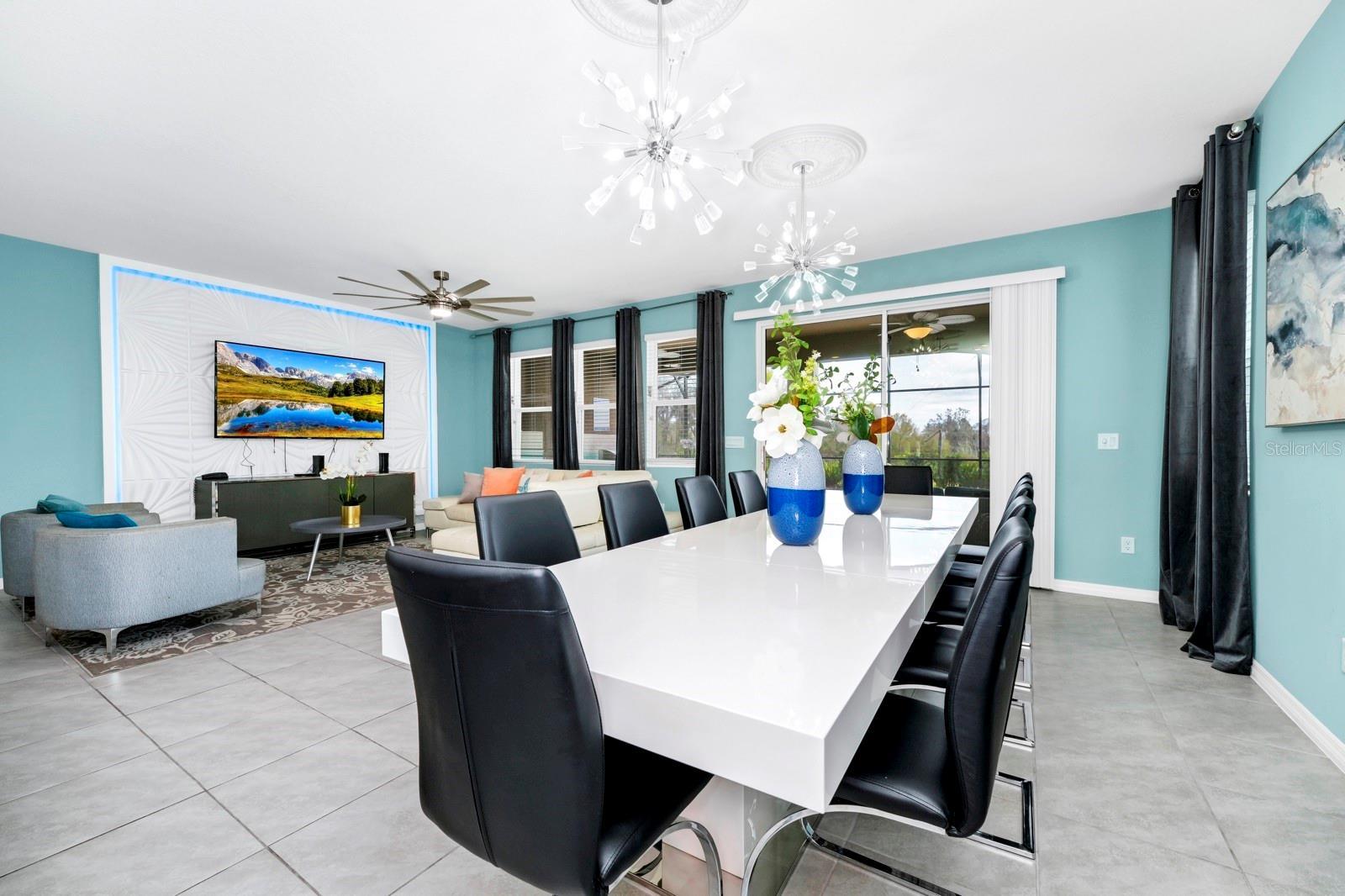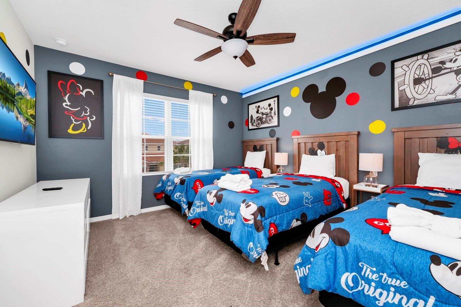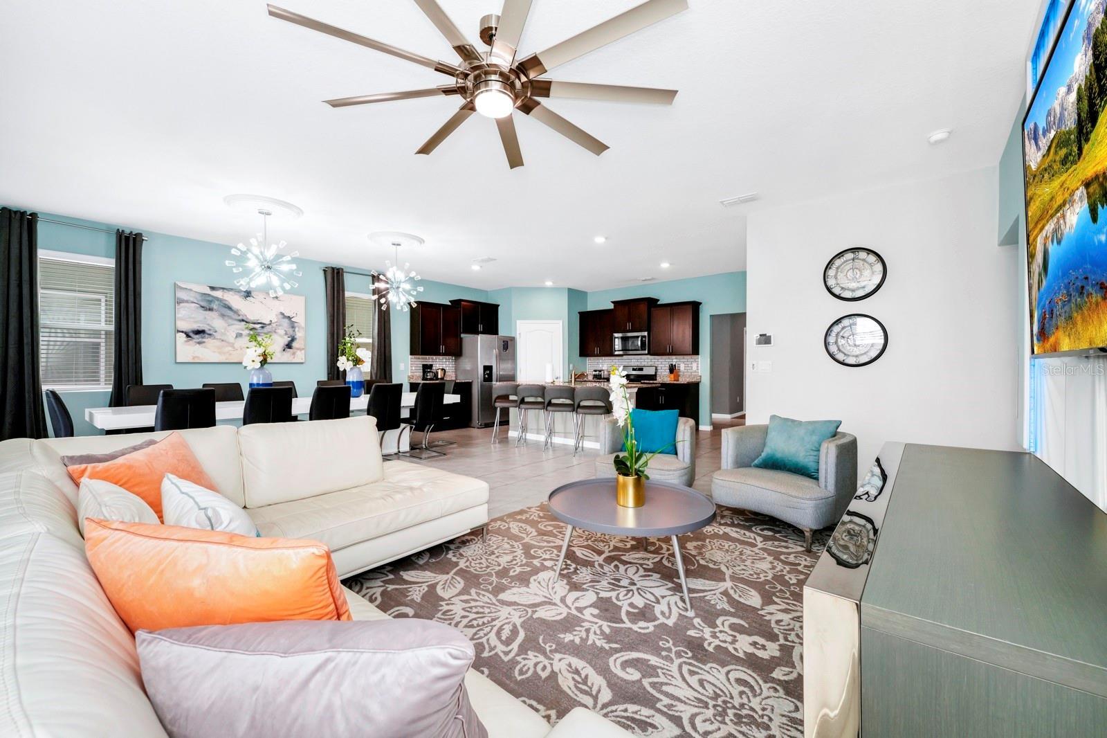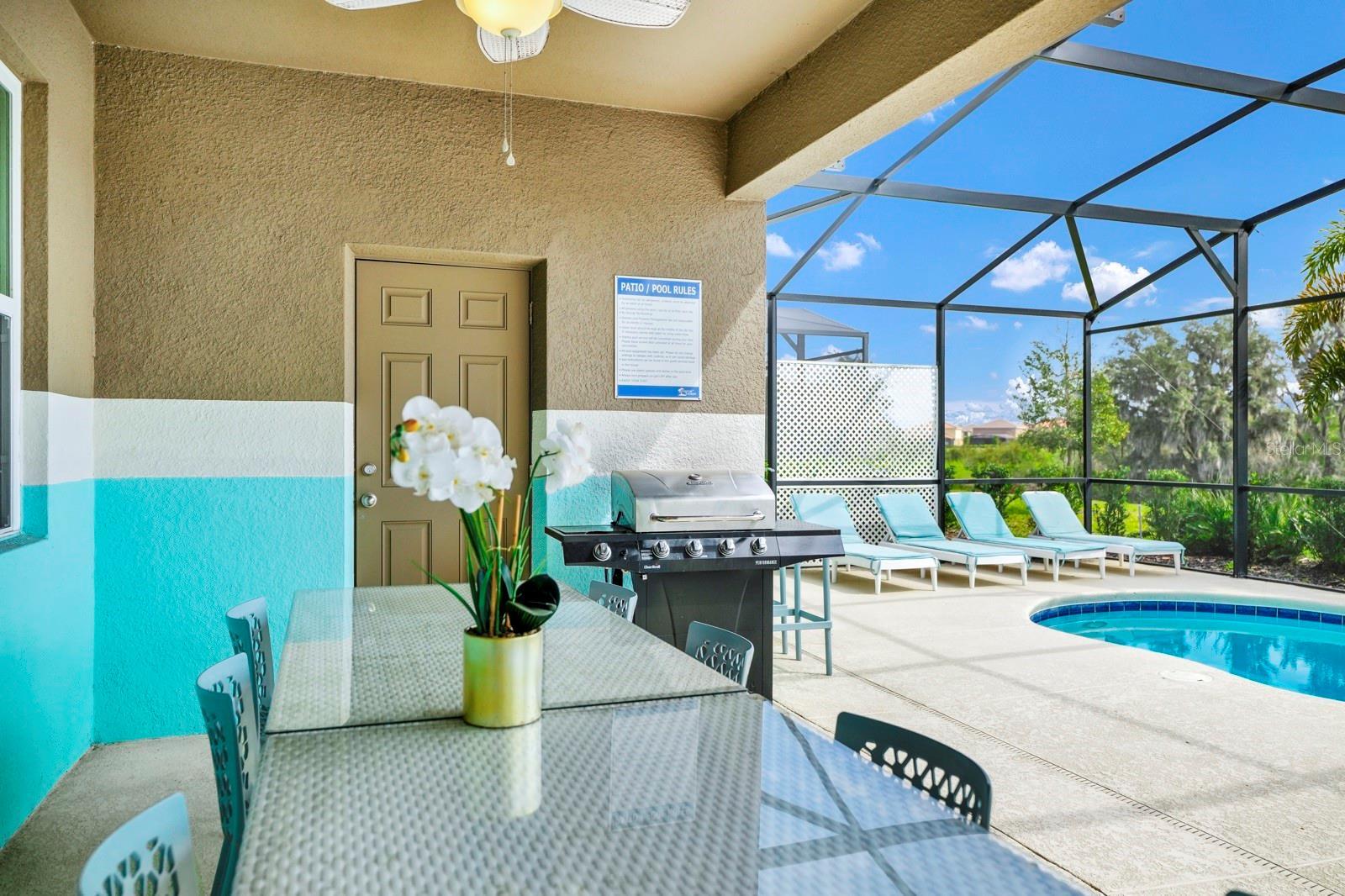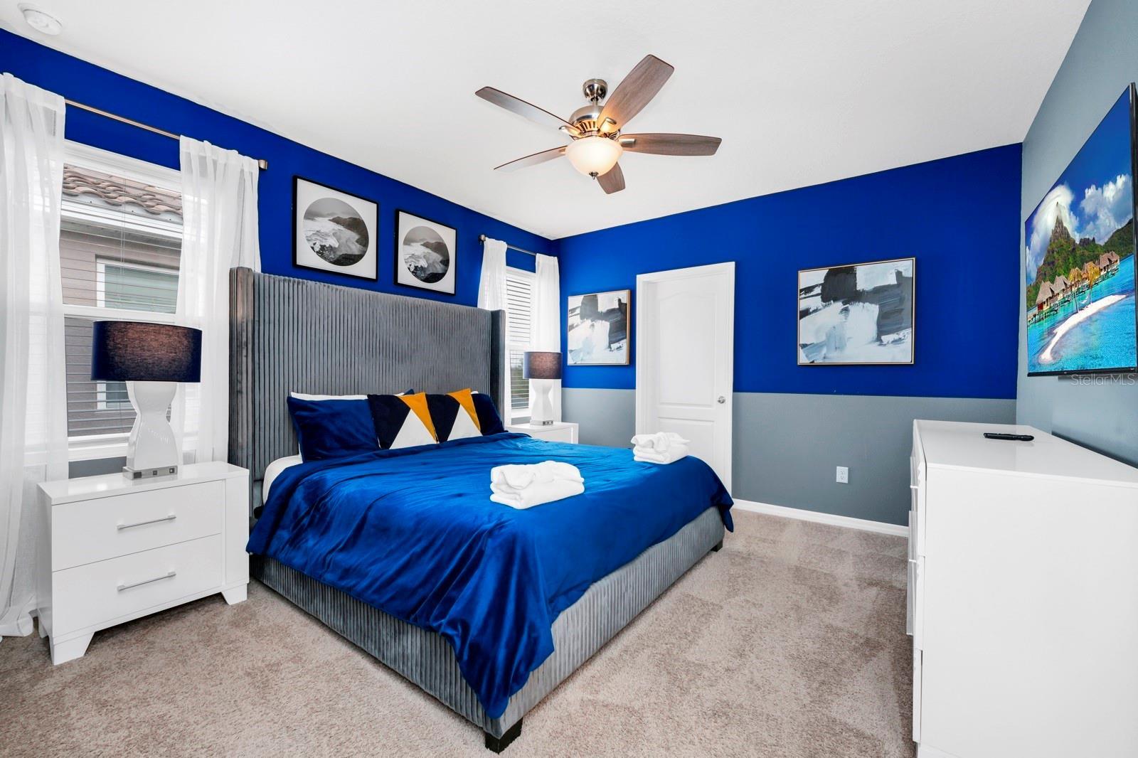 You can own this investment or vacation home in the Solterra Resort? This TURNKEY house, professionally designed 7-bedroom, 5.5-bathroom home is nestled in a gated and guarded community that offers world-class amenities, including a thrilling water slide, lazy river, splash zone, theater room, sports field, restaurants, and a bar. The state-of-the-art clubhouse provides access to a resort-style pool, hot tub, fully equipped fitness center, tennis and volleyball courts, playground, and recreational areas. Plus, there's a poolside café to relax and enjoy food and drinks! As you step inside, you'll be greeted by a bright and open floor plan designed for comfort and style. The main living and dining areas flow seamlessly into the modern kitchen, creating the perfect space for entertaining family and friends. A beautiful coral and seashell-themed King bedroom welcomes you upon entry, while the first-floor master suite boasts an en-suite bathroom with patio access. For entertainment, the Star Wars-themed game room is a standout feature, equipped with theater seating, an arcade game system, LED lighting, a pool table, and an air hockey table—a true paradise for guests of all ages! Upstairs, a surf-themed loft serves as an additional relaxation space, surrounded by five beautifully decorated bedrooms, including another spacious master suite with a private bath. Outside, the private pool and jacuzzi provide the perfect retreat, with no rear neighbors for added privacy. Don't miss this opportunity to own in one of Central Florida’s top short-term rental communities!