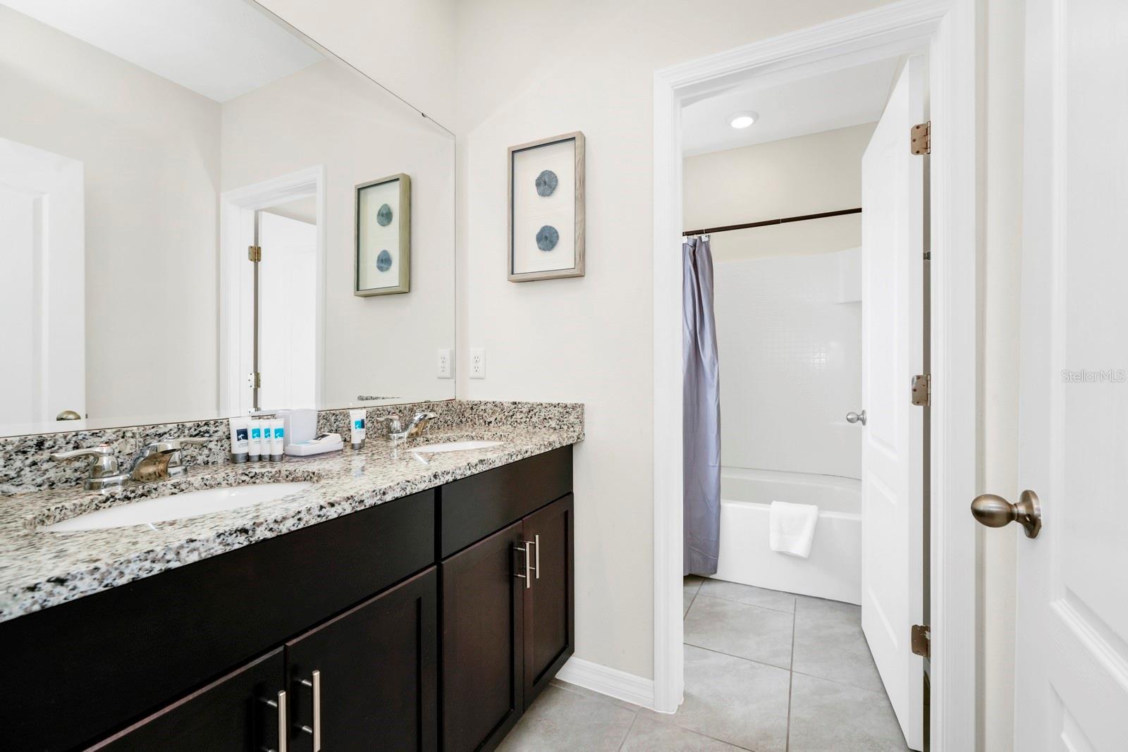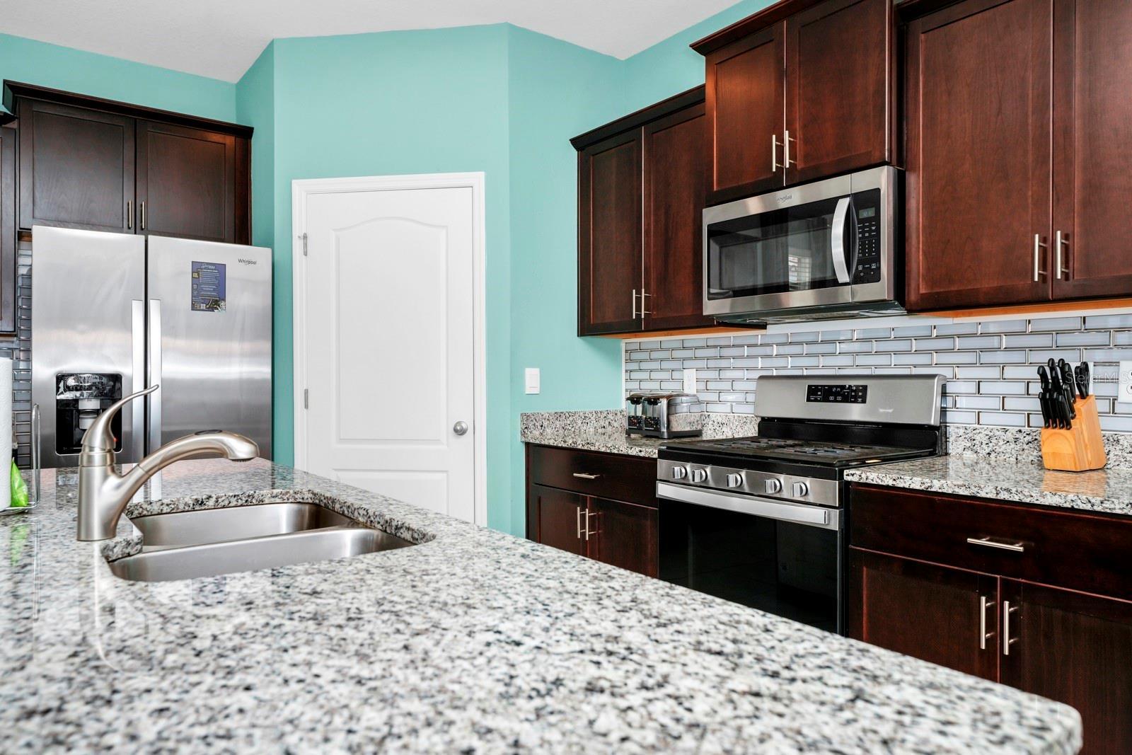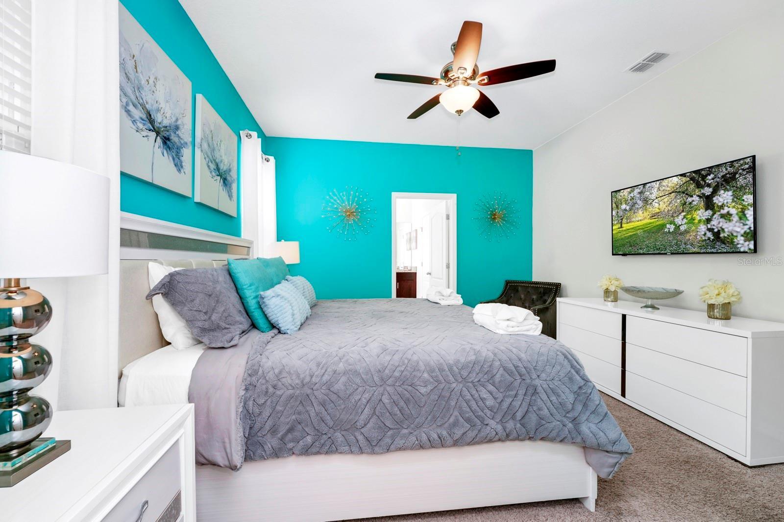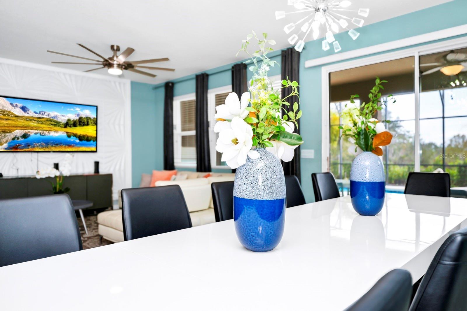 You can own this investment or vacation home in the Solterra Resort? This TURNKEY house, professionally designed 7-bedroom, 5.5-bathroom home is nestled in a gated and guarded community that offers world-class amenities, including a thrilling water slide, lazy river, splash zone, theater room, sports field, restaurants, and a bar. The state-of-the-art clubhouse provides access to a resort-style pool, hot tub, fully equipped fitness center, tennis and volleyball courts, playground, and recreational areas. Plus, there's a poolside café to relax and enjoy food and drinks! As you step inside, you'll be greeted by a bright and open floor plan designed for comfort and style. The main living and dining areas flow seamlessly into the modern kitchen, creating the perfect space for entertaining family and friends. A beautiful coral and seashell-themed King bedroom welcomes you upon entry, while the first-floor master suite boasts an en-suite bathroom with patio access. For entertainment, the Star Wars-themed game room is a standout feature, equipped with theater seating, an arcade game system, LED lighting, a pool table, and an air hockey table—a true paradise for guests of all ages! Upstairs, a surf-themed loft serves as an additional relaxation space, surrounded by five beautifully decorated bedrooms, including another spacious master suite with a private bath. Outside, the private pool and jacuzzi provide the perfect retreat, with no rear neighbors for added privacy. Don't miss this opportunity to own in one of Central Florida’s top short-term rental communities!
