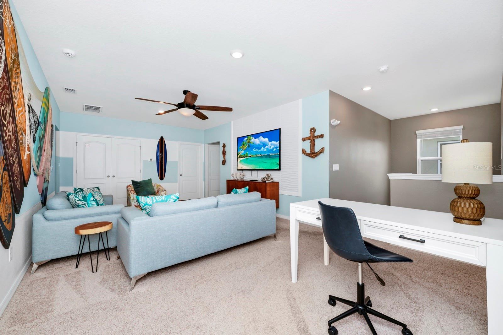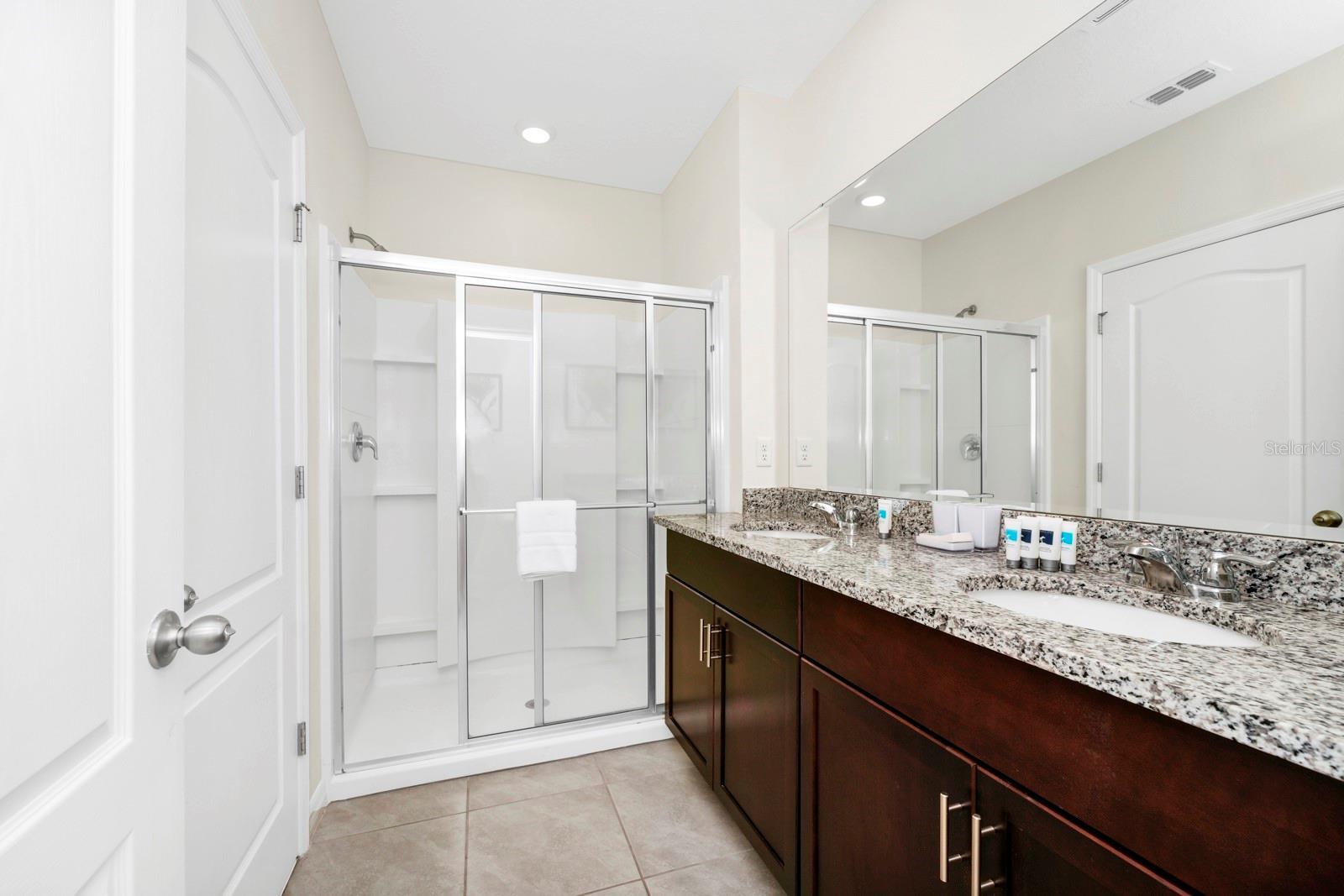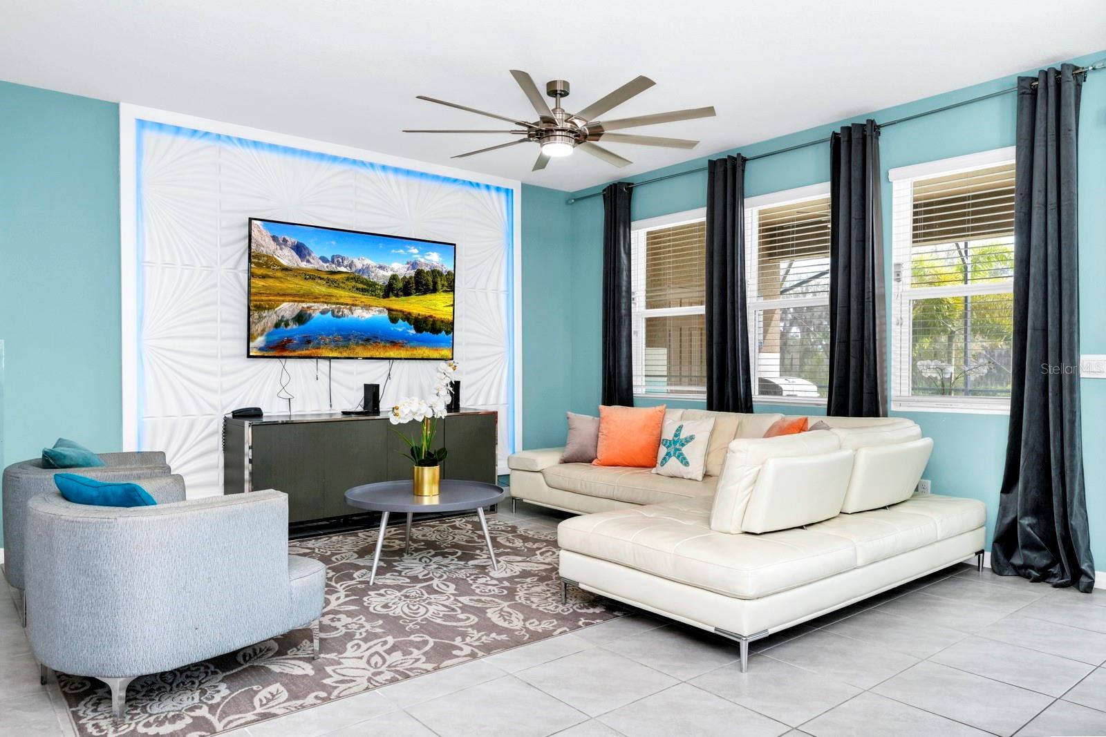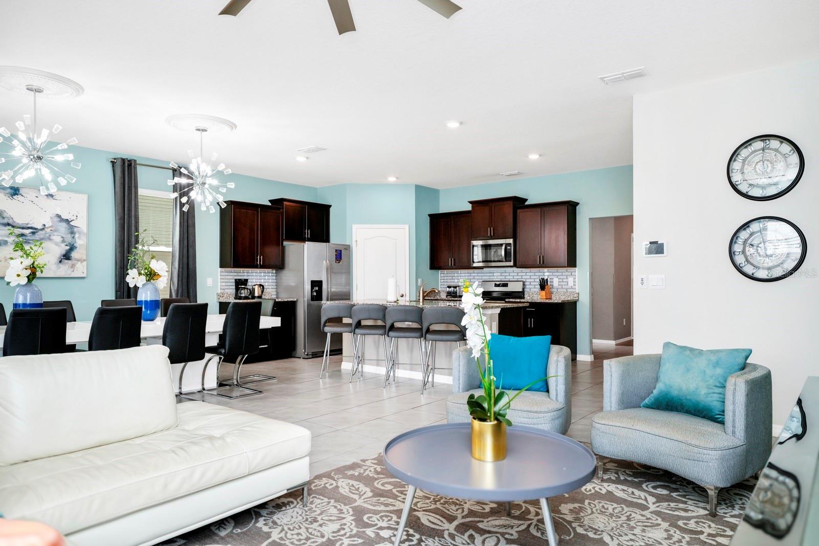 You can own this investment or vacation home in the Solterra Resort? This TURNKEY house, professionally designed 7-bedroom, 5.5-bathroom home is nestled in a gated and guarded community that offers world-class amenities, including a thrilling water slide, lazy river, splash zone, theater room, sports field, restaurants, and a bar. The state-of-the-art clubhouse provides access to a resort-style pool, hot tub, fully equipped fitness center, tennis and volleyball courts, playground, and recreational areas. Plus, there's a poolside café to relax and enjoy food and drinks! As you step inside, you'll be greeted by a bright and open floor plan designed for comfort and style. The main living and dining areas flow seamlessly into the modern kitchen, creating the perfect space for entertaining family and friends. A beautiful coral and seashell-themed King bedroom welcomes you upon entry, while the first-floor master suite boasts an en-suite bathroom with patio access. For entertainment, the Star Wars-themed game room is a standout feature, equipped with theater seating, an arcade game system, LED lighting, a pool table, and an air hockey table—a true paradise for guests of all ages! Upstairs, a surf-themed loft serves as an additional relaxation space, surrounded by five beautifully decorated bedrooms, including another spacious master suite with a private bath. Outside, the private pool and jacuzzi provide the perfect retreat, with no rear neighbors for added privacy. Don't miss this opportunity to own in one of Central Florida’s top short-term rental communities!