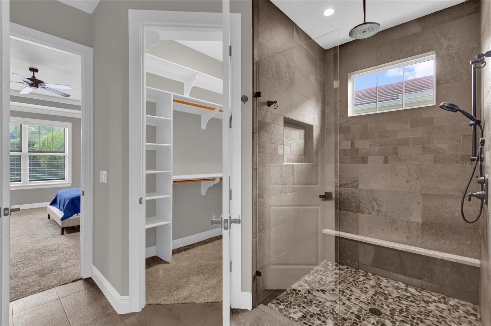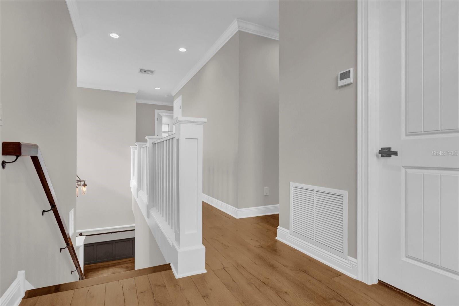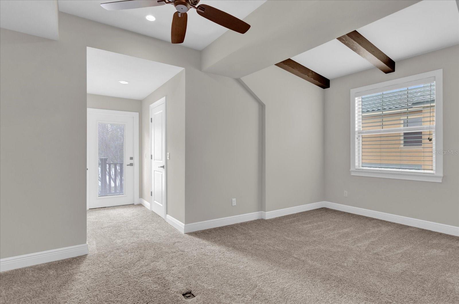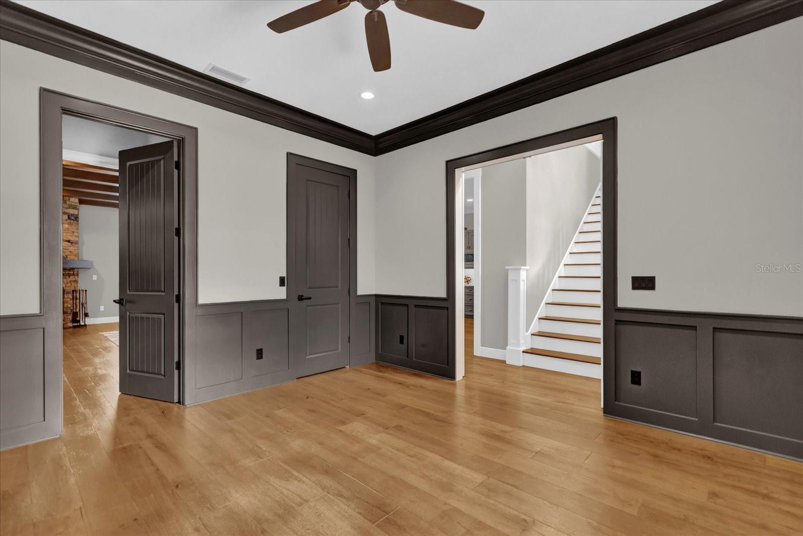 - Ceiling Fans(s), Central Vaccum, Chair Rail, Crown Molding, Eat-in Kitchen, High Ceilings, Primary Bedroom Main Floor, Solid Surface Counters, Thermostat, Walk-In Closet(s)