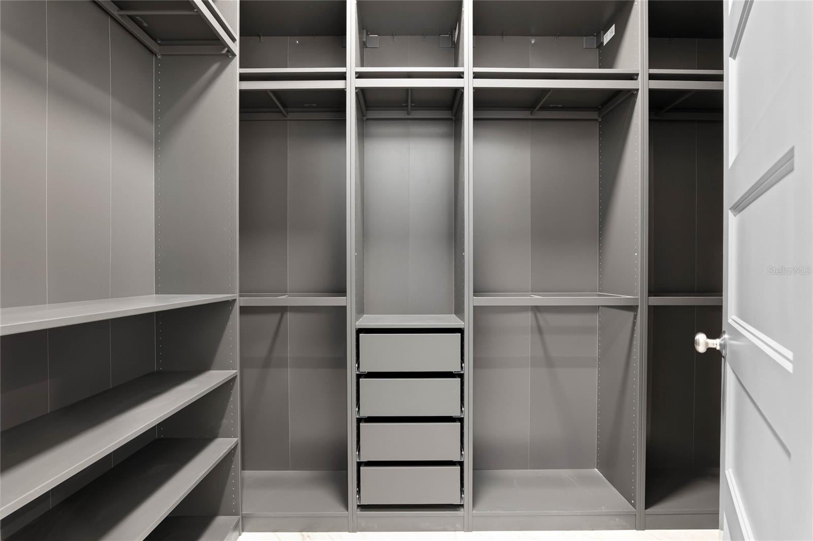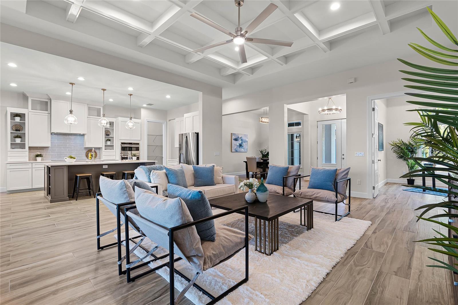 - Ceiling Fans(s), Coffered Ceiling(s), Eat-in Kitchen, High Ceilings, Kitchen/Family Room Combo, Open Floorplan, Solid Surface Counters, Solid Wood Cabinets, Split Bedroom, Stone Counters, Thermostat, Walk-In Closet(s)