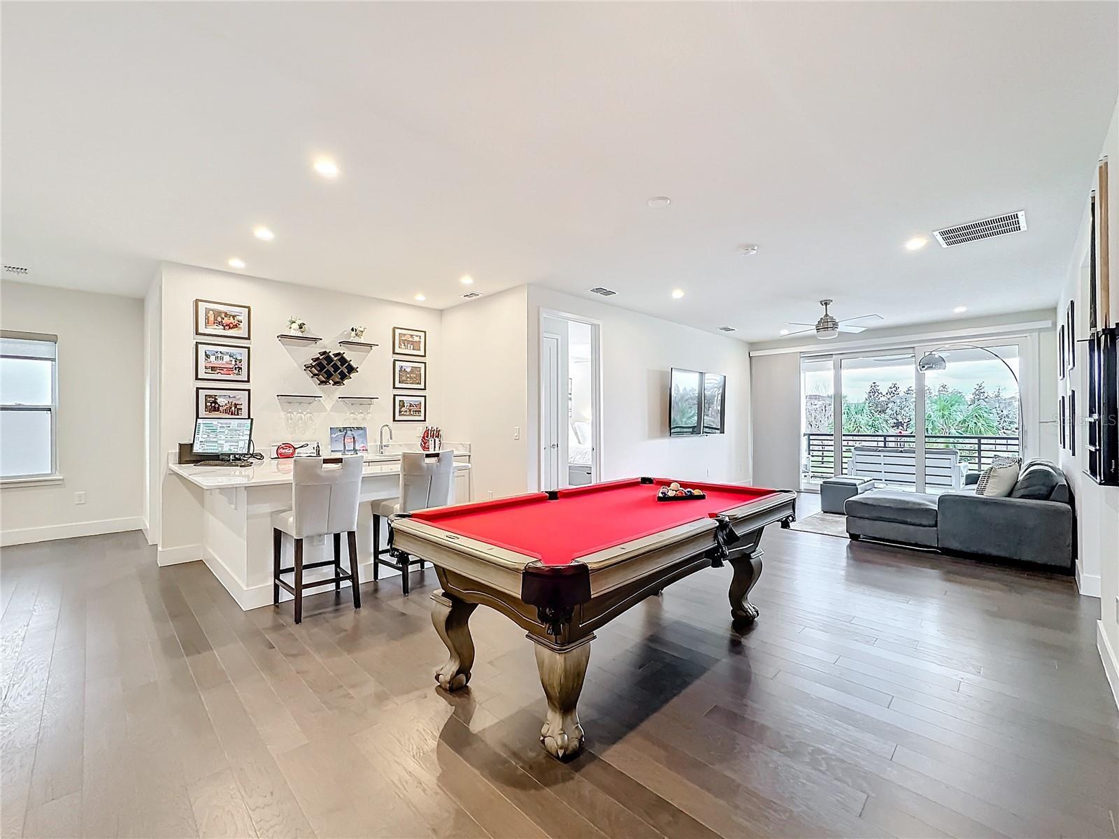 Experience modern luxury in this stunning 6-bedroom, 6.5-bathroom home, ideally situated in the exclusive Bear’s Den Club at Reunion Resort. Designed to accommodate up to 14 guests, this residence offers an expansive open-concept living and dining area with a fully equipped kitchen and breakfast bar, perfect for entertaining and family gatherings. Expansive sliding glass doors frame beautiful views and provide seamless access to your private pool, summer kitchen, and direct entry to your community’s private park. Enjoy convenient access to amenities just steps away—including a dog park, sand volleyball court, playground, chipping green, and a ¼-mile walking path ideal for morning strolls or family fun. Every detail of this home exudes elegance and sophistication. All furniture and decor were thoughtfully curated and custom-designed by a professional interior decorator, creating a cohesive, luxurious atmosphere in every room. The property also comes with a transferable golf membership, granting access to Reunion Resort’s exclusive golf courses—an exceptional perk for golf enthusiasts and guests alike. The first floor offers two bedrooms, including a spacious primary ensuite, each with a private full bathroom and large smart TV for added comfort. Upstairs, discover a spacious entertainment loft featuring a pool table, comfortable seating, and a wet bar, leading to a private balcony overlooking the park—the perfect spot to unwind and enjoy the view. Four additional bedrooms await upstairs: three with king-size beds and one with a full-size bed. Every bedroom is beautifully appointed and features its own private full bathroom and large smart TV. A two-car garage adds convenience and versatility to this exceptional property. Located just 5 miles from Disney Parks and Disney Springs, and approximately 25 minutes from Orlando International Airport and Mall at Millenia, this home offers both convenience and exclusivity. Reunion Resort is a world-class destination featuring three championship golf courses designed by Jack Nicklaus, Tom Watson, and Arnold Palmer. Additional resort amenities include a private water park, boutique spa, tennis center, and multiple fine dining restaurants—all thoughtfully designed to elevate your lifestyle. Whether you’re seeking a luxurious private retreat or a high-performing rental investment, this home offers the ideal combination of professionally designed interiors, luxury amenities, entertainment spaces, a transferable golf membership, and an unbeatable location to create unforgettable memories.
