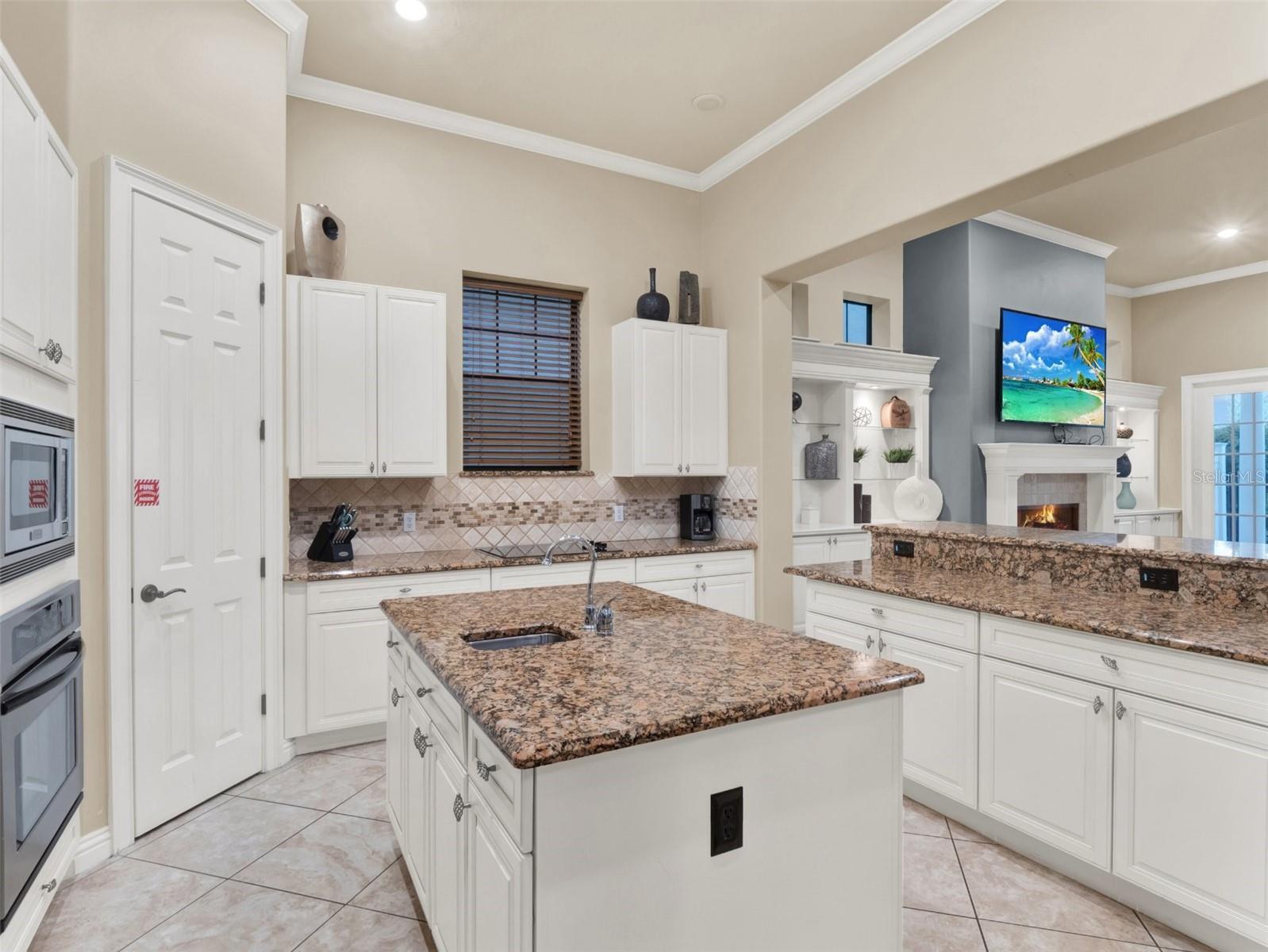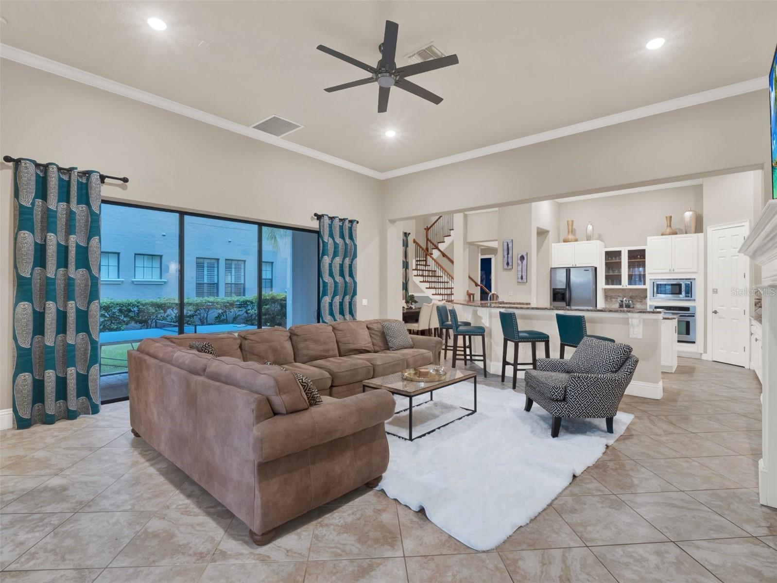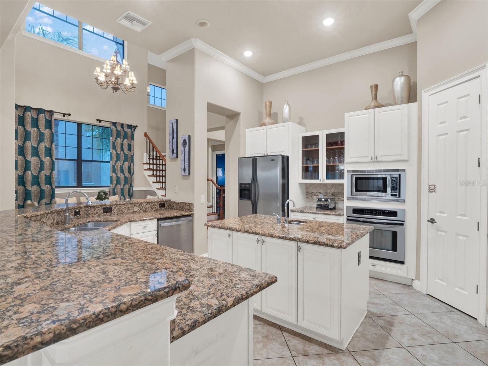 - Crown Molding, Eat-in Kitchen, High Ceilings, Kitchen/Family Room Combo, Open Floorplan, Primary Bedroom Main Floor, PrimaryBedroom Upstairs, Solid Wood Cabinets, Stone Counters, Walk-In Closet(s), Window Treatments