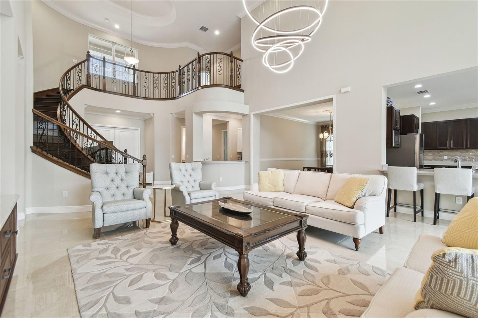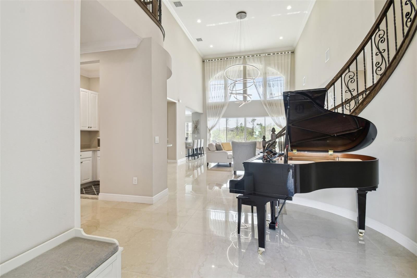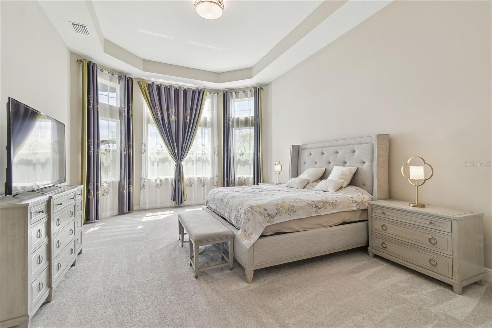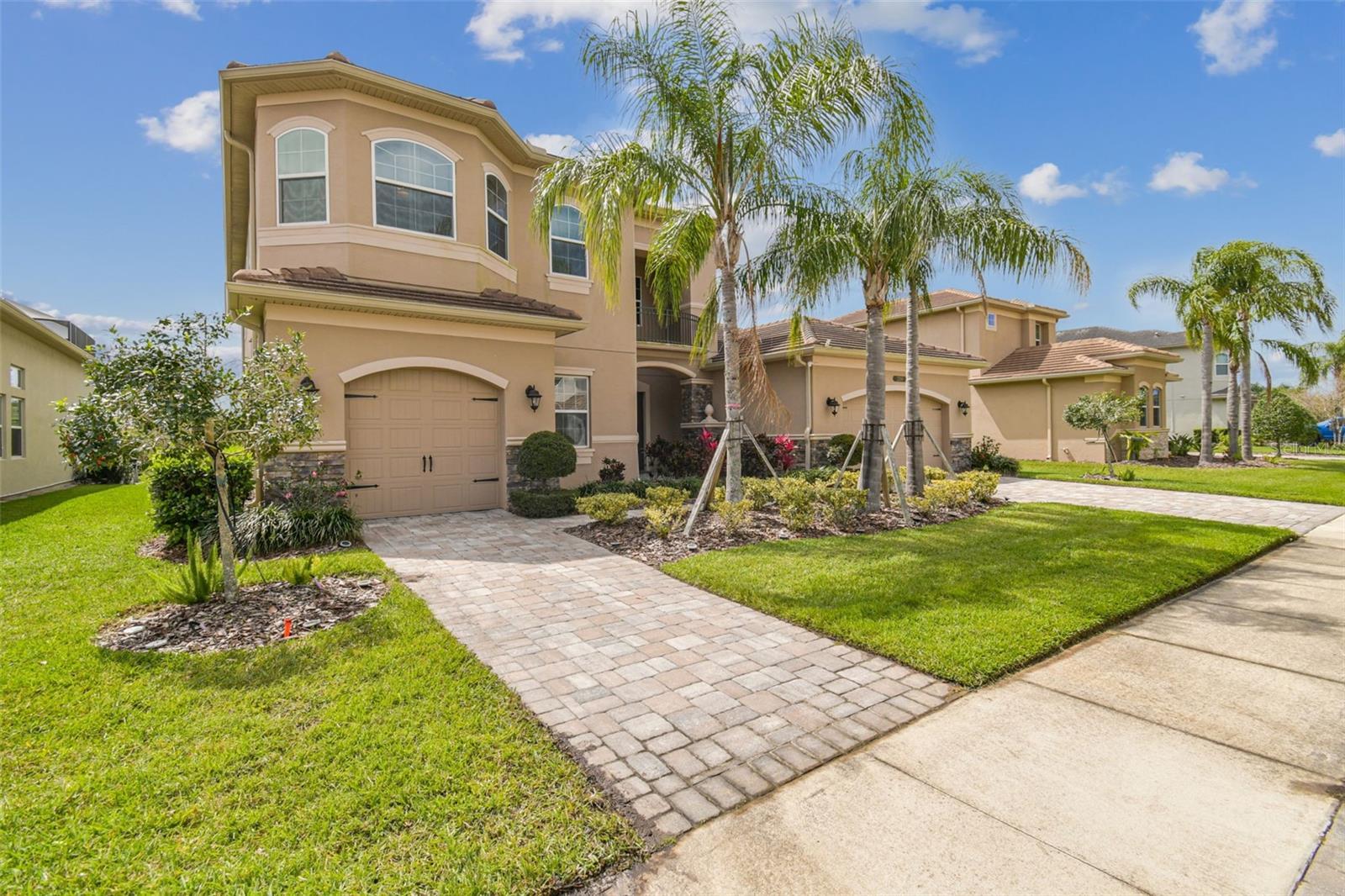 All furniture is included only with listing price. Nestled within the Estates at Wesley Chapel, a gated enclave just moments from the charm of downtown Wesley Chapel, this breathtaking home offers an unparalleled blend of luxury, privacy, and modern convenience. The property provides a serene retreat, perfect for both grand entertaining and everyday living. This 4,500 square feet of Luxurious Home boasts 5 bedrooms, 5.5 bathrooms, an office, a 3-car split garage, with a picturesque conservation view, all set on just over a quarter-acre lot. Upon arrival, the property immediately captivates with its refined curb appeal, highlighted by a distinguished tile roof and a welcoming circular paver way leading to the grand double front doors. Step inside to a breathtaking two-story foyer, setting a tone of grandeur with its soaring ceilings and an elegant winding wrought iron staircase. The open floor plan seamlessly flows into an expansive Great Room, showcasing stunning Spanish porcelain tile flooring, 22-foot ceilings, and an abundance of natural light streaming through expansive glass sliding doors and windows that connect to the outdoor oasis. The gourmet eat-in island kitchen, complemented by a formal dining room with a convenient pass-through, and a well-appointed wet bar situated between the great room and dining area, creates an ideal setting for hosting and entertaining. The main level also features a luxurious master suite, complete with large windows, a tray ceiling, and two custom-designed walk-in closets. The opulent master bath offers a tub with a separate shower and dual vanities. Ascending to the second level, you will discover three additional generously sized bedrooms, one of which boasts its own private en-suite bathroom and walk-in closet. Notably, one of the expansive upstairs bedrooms presents a versatile opportunity and can be easily utilized as a dedicated game room or additional recreational space, catering to various lifestyle needs. Upgrades including exquisite Spanish porcelain flooring, custom-built closets throughout , lighting fixtures, elegant crown molding, a screened backyard lanai with paver flooring, a water softener system, two kitchen osmosis systems, gutters, elegant window curtains, a Tesla charger, and much more. The Ridge offers luxury resort-style amenities, including: Beautiful Clubhouse, Catering Kitchen, Indoor Sports Complex, Game Room, Fitness Center, Resort-Style Pool with Beach Entry and Water Slide, Firepit, Tennis and Basketball Courts, Beach Volleyball. the HOA fee covering lawn mowing, irrigation, landscape maintenance, fertilization, yearly mulch. Shopping, restaurants, premium outlets, parks and several new medical centers are minutes away. Easy commute to downtown Tampa and Tampa International airport and Universities.