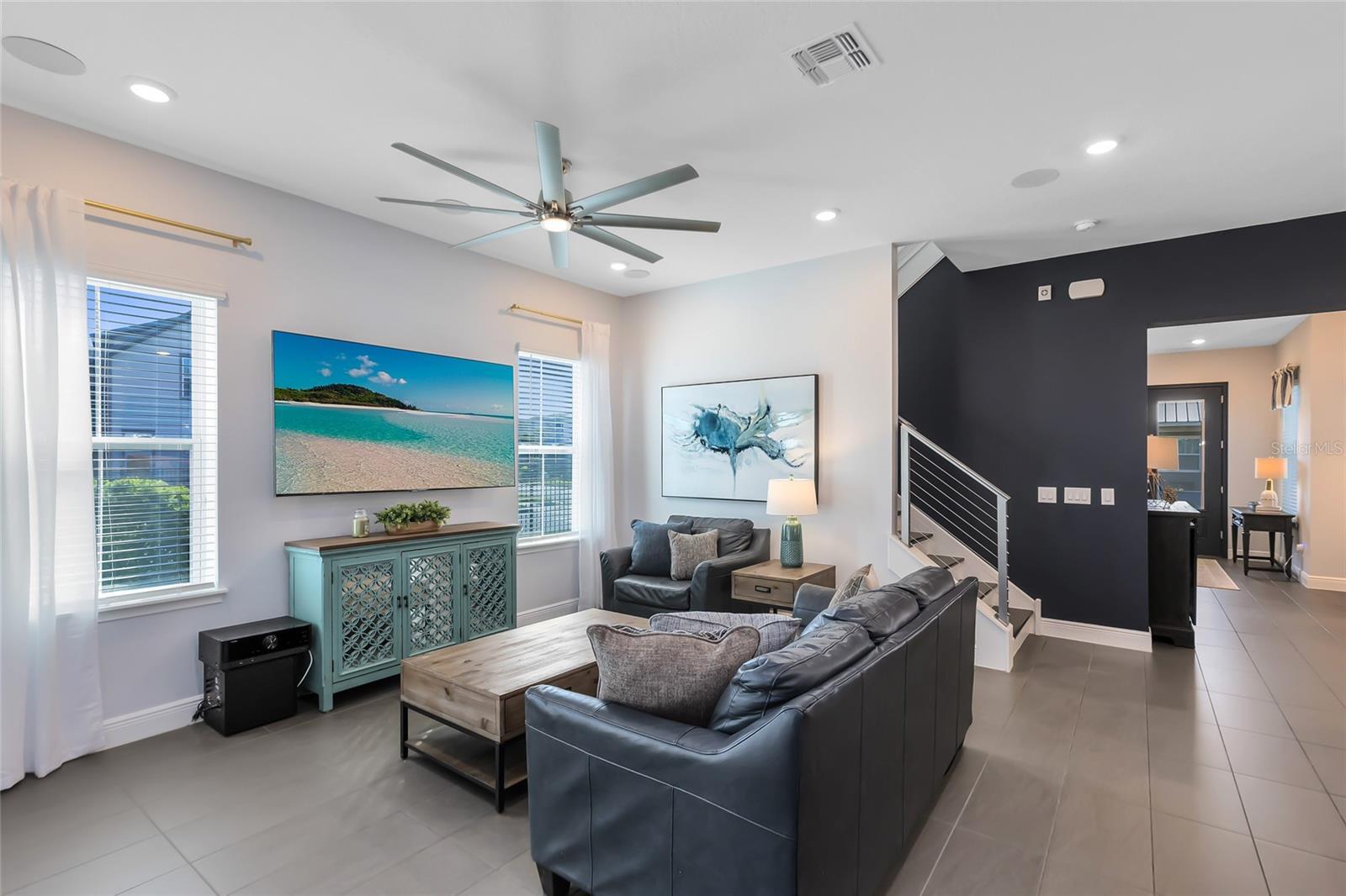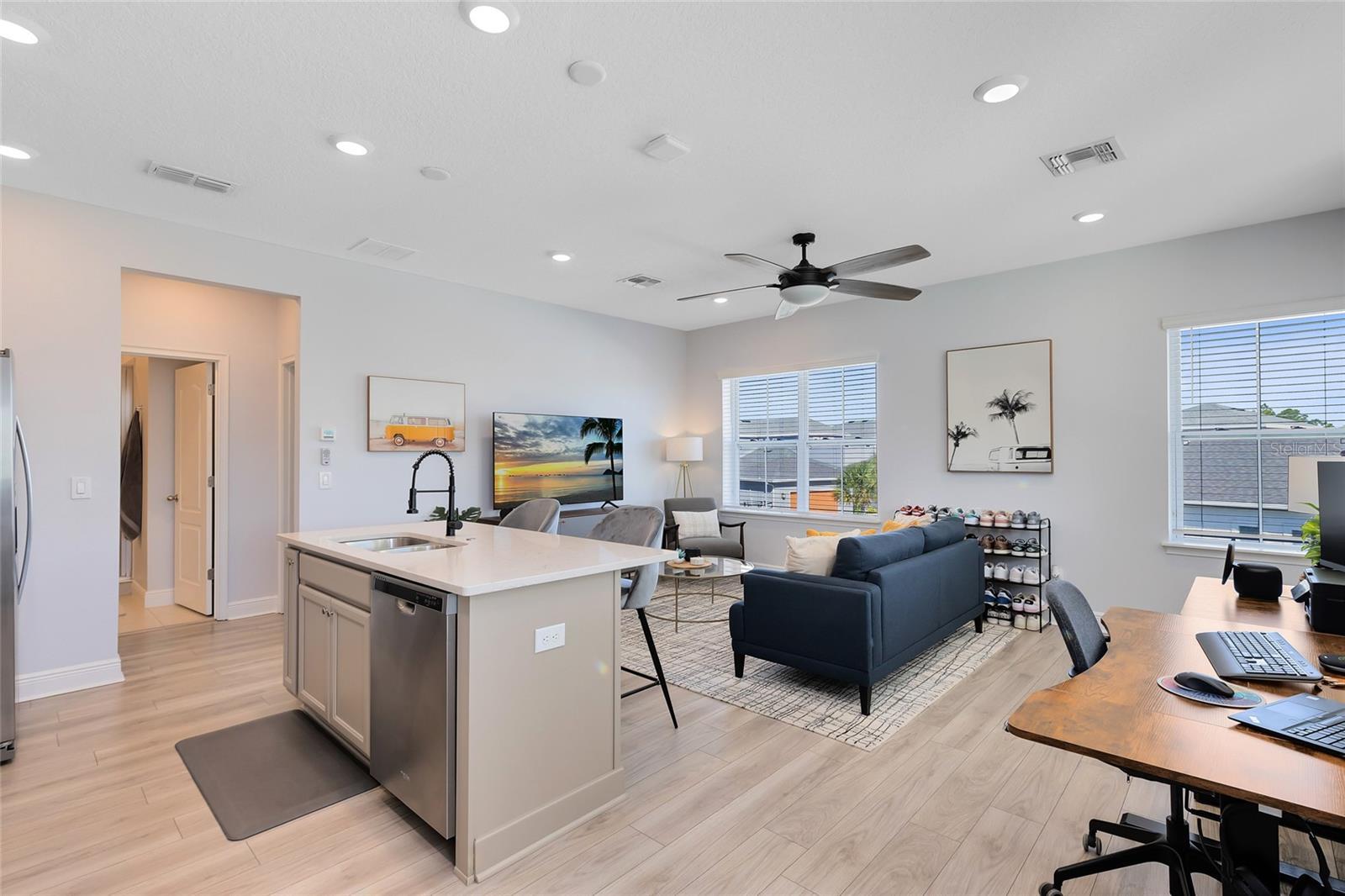 - Built-in Features, Ceiling Fans(s), Dry Bar, Eat-in Kitchen, Kitchen/Family Room Combo, Open Floorplan, Primary Bedroom Main Floor, Split Bedroom, Stone Counters, Thermostat, Walk-In Closet(s), Window Treatments