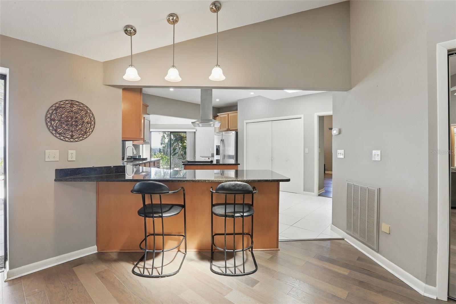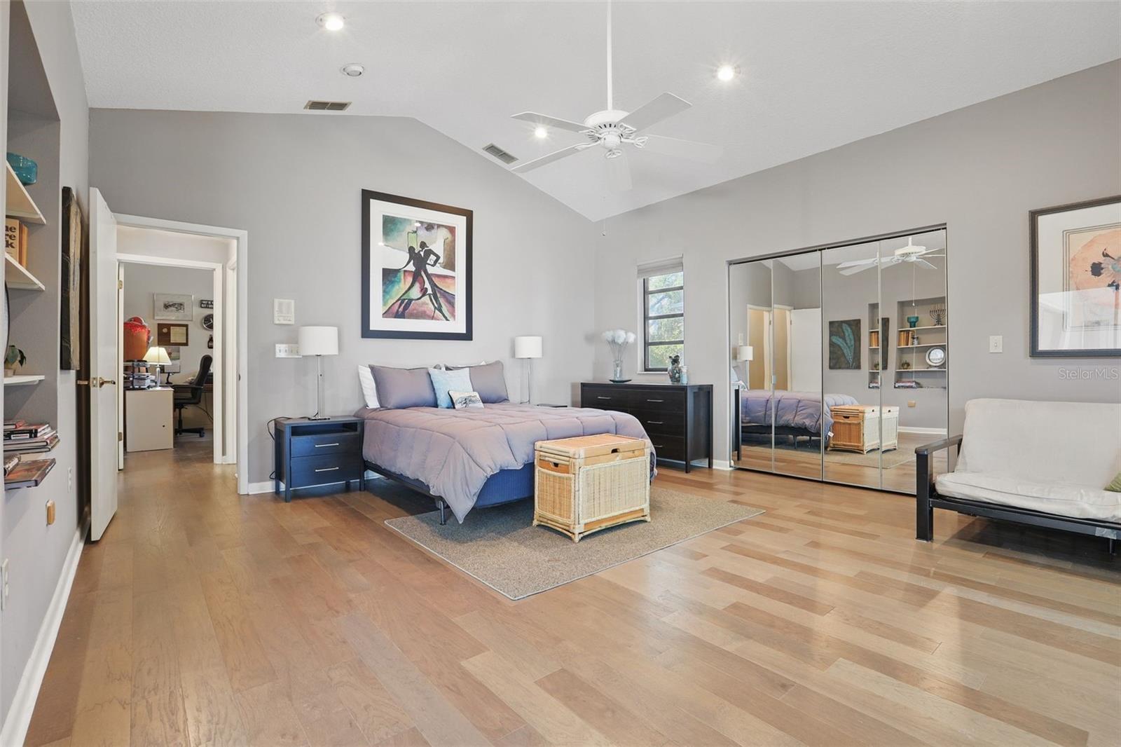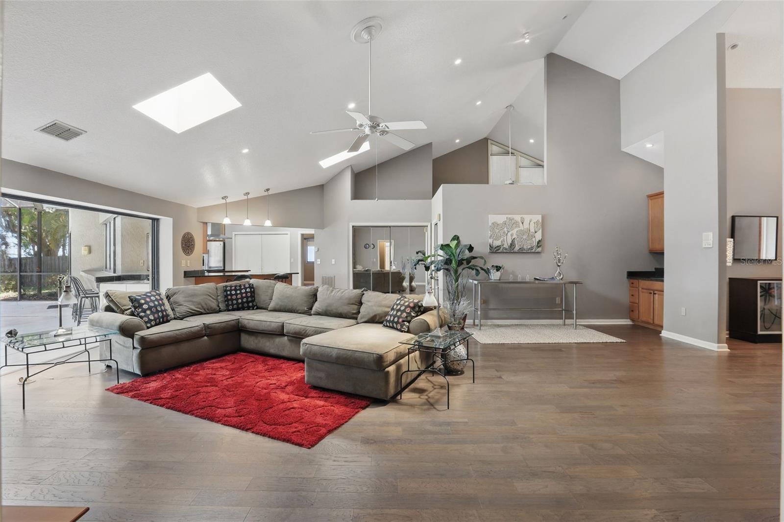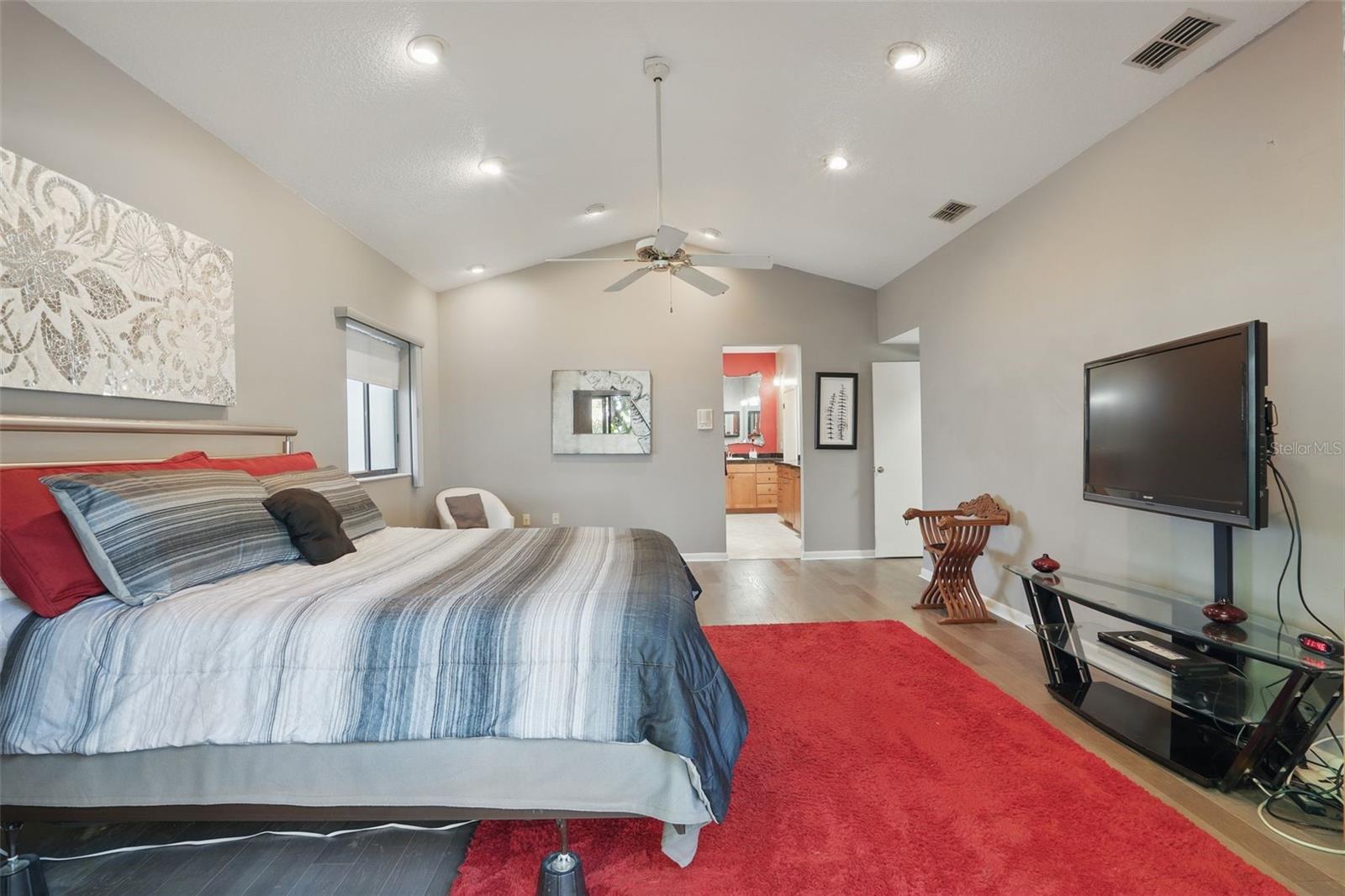 - Cathedral Ceiling(s), Ceiling Fans(s), Eat-in Kitchen, High Ceilings, Kitchen/Family Room Combo, Open Floorplan, Primary Bedroom Main Floor, Solid Surface Counters, Solid Wood Cabinets, Split Bedroom, Thermostat, Vaulted Ceiling(s), Walk-In Closet(s)