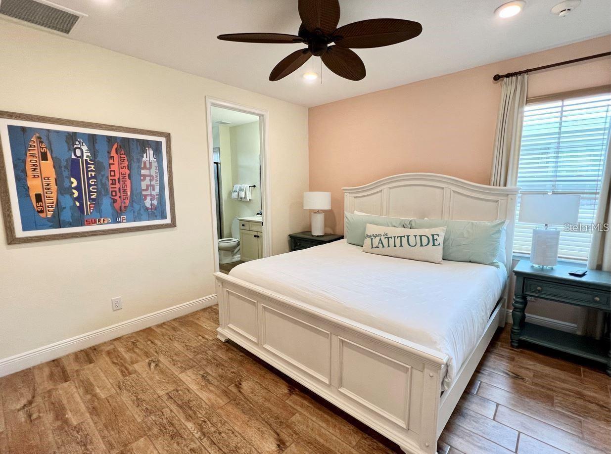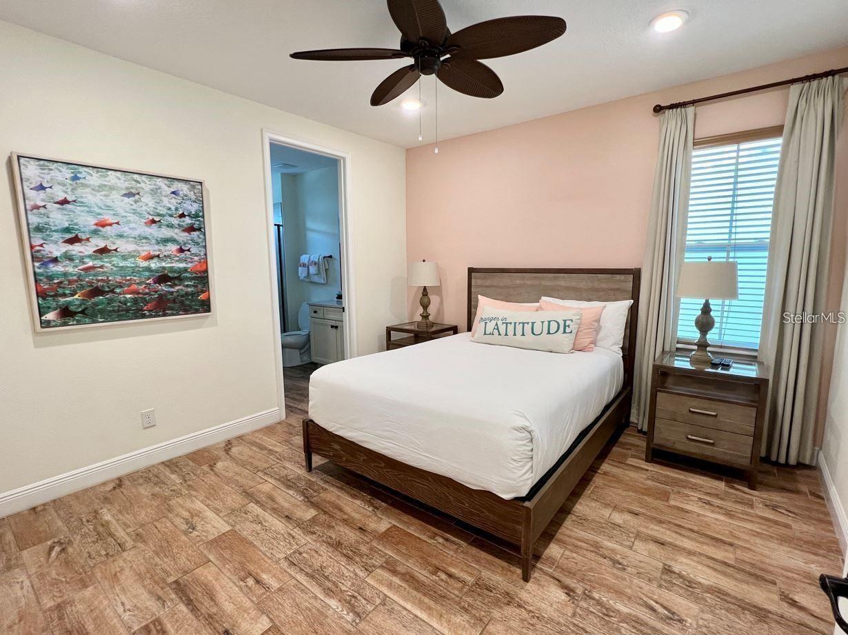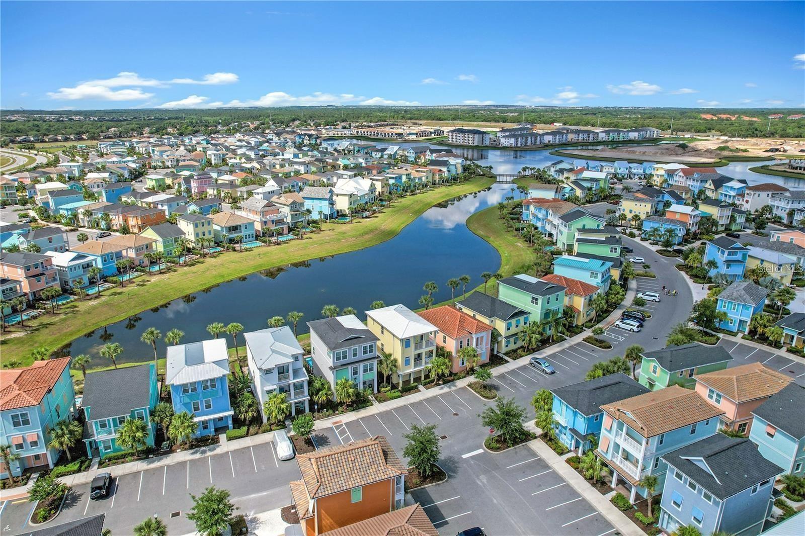 BRAND NEW AC with 10 YEAR TRANSFERABLE WARRANTY! 5.99 INTEREST RATE for qualified buyers who use our preferred lender! PHASE 1 WATERFRONT 4 bedroom cottage in the heart of Margaritaville Resort located just 5 minutes from Disney! Just steps from the resort amenity area, this immaculately kept cottage is fully equip with Margaritaville Resort approved furnishings by Ethan Allen. This spacious open floorplan home has 4 bedrooms, all with their own en suite bathrooms and separate thermostats for each level, along with high end wood look tile, quartz countertops, wooden stairs, private owners closet, high ceilings, multiple private balconies, an outdoor shower, and so much more! The large fenced in patio features a private, heated pool, ample eating and entertaining space, and sweeping lagoon views. This property can be used as a full time residence, second home, or short term rental property. This resort style community features two large swimming pools, multiple restaurants and bars, fitness center, full service spa, lush and tranquil walking trails to all ends of the community, as well as a moments walk to all of the restaurants, bars, shops and entertainment that Sunset Walk has Low maintenance resort living includes fully maintained grounds, home exterior, lawn care, and 24/7 roaming security.