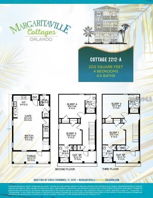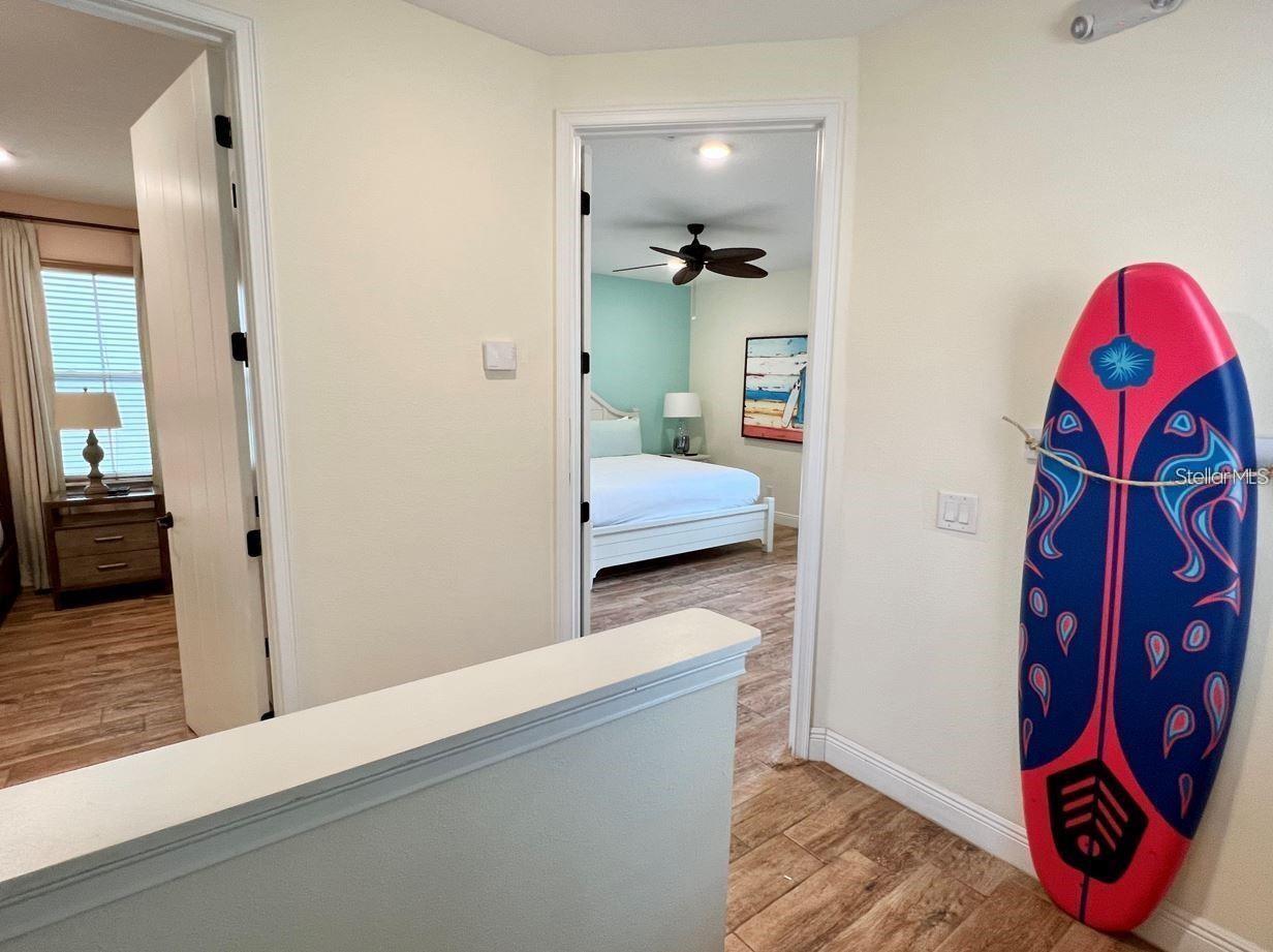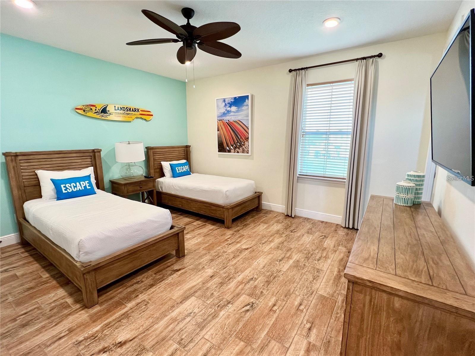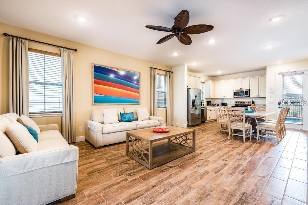 BRAND NEW AC with 10 YEAR TRANSFERABLE WARRANTY! 5.99 INTEREST RATE for qualified buyers who use our preferred lender! PHASE 1 WATERFRONT 4 bedroom cottage in the heart of Margaritaville Resort located just 5 minutes from Disney! Just steps from the resort amenity area, this immaculately kept cottage is fully equip with Margaritaville Resort approved furnishings by Ethan Allen. This spacious open floorplan home has 4 bedrooms, all with their own en suite bathrooms and separate thermostats for each level, along with high end wood look tile, quartz countertops, wooden stairs, private owners closet, high ceilings, multiple private balconies, an outdoor shower, and so much more! The large fenced in patio features a private, heated pool, ample eating and entertaining space, and sweeping lagoon views. This property can be used as a full time residence, second home, or short term rental property. This resort style community features two large swimming pools, multiple restaurants and bars, fitness center, full service spa, lush and tranquil walking trails to all ends of the community, as well as a moments walk to all of the restaurants, bars, shops and entertainment that Sunset Walk has Low maintenance resort living includes fully maintained grounds, home exterior, lawn care, and 24/7 roaming security.