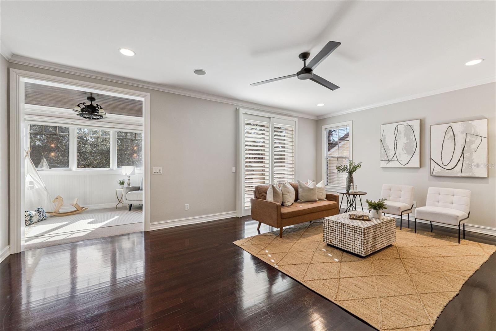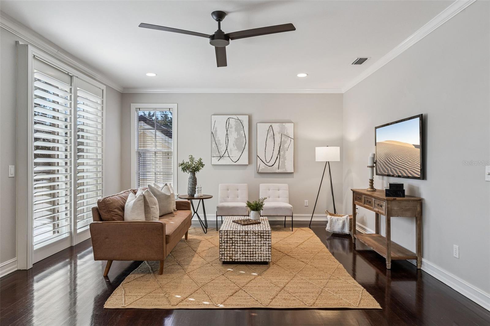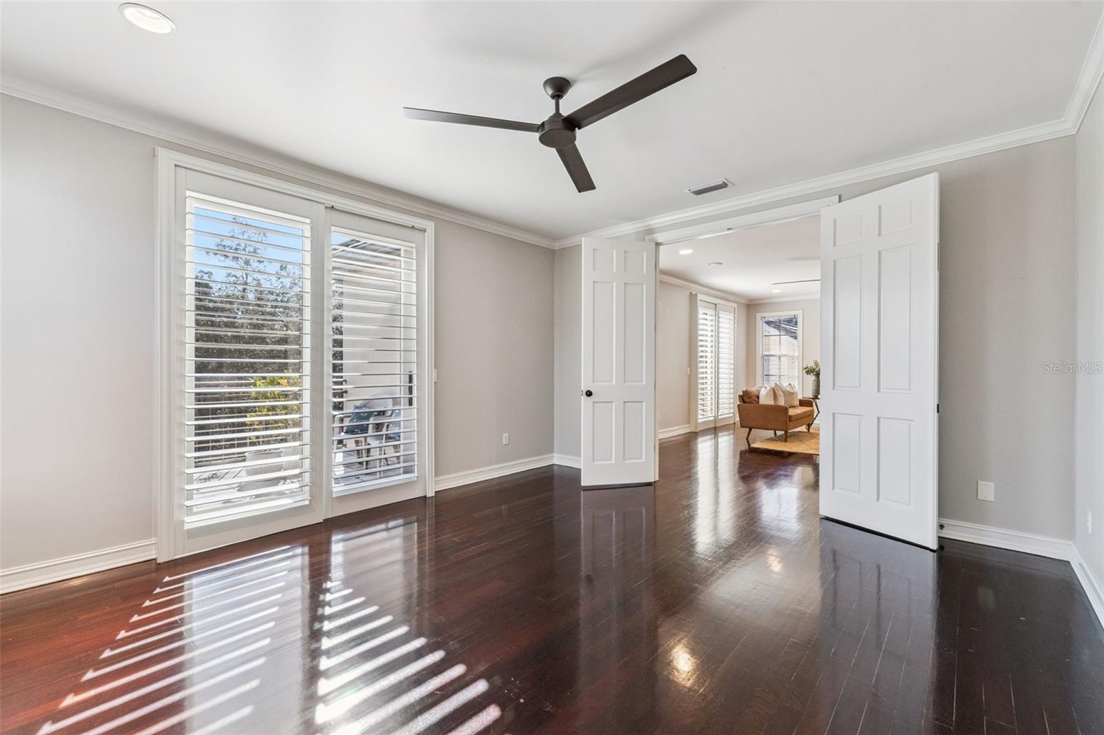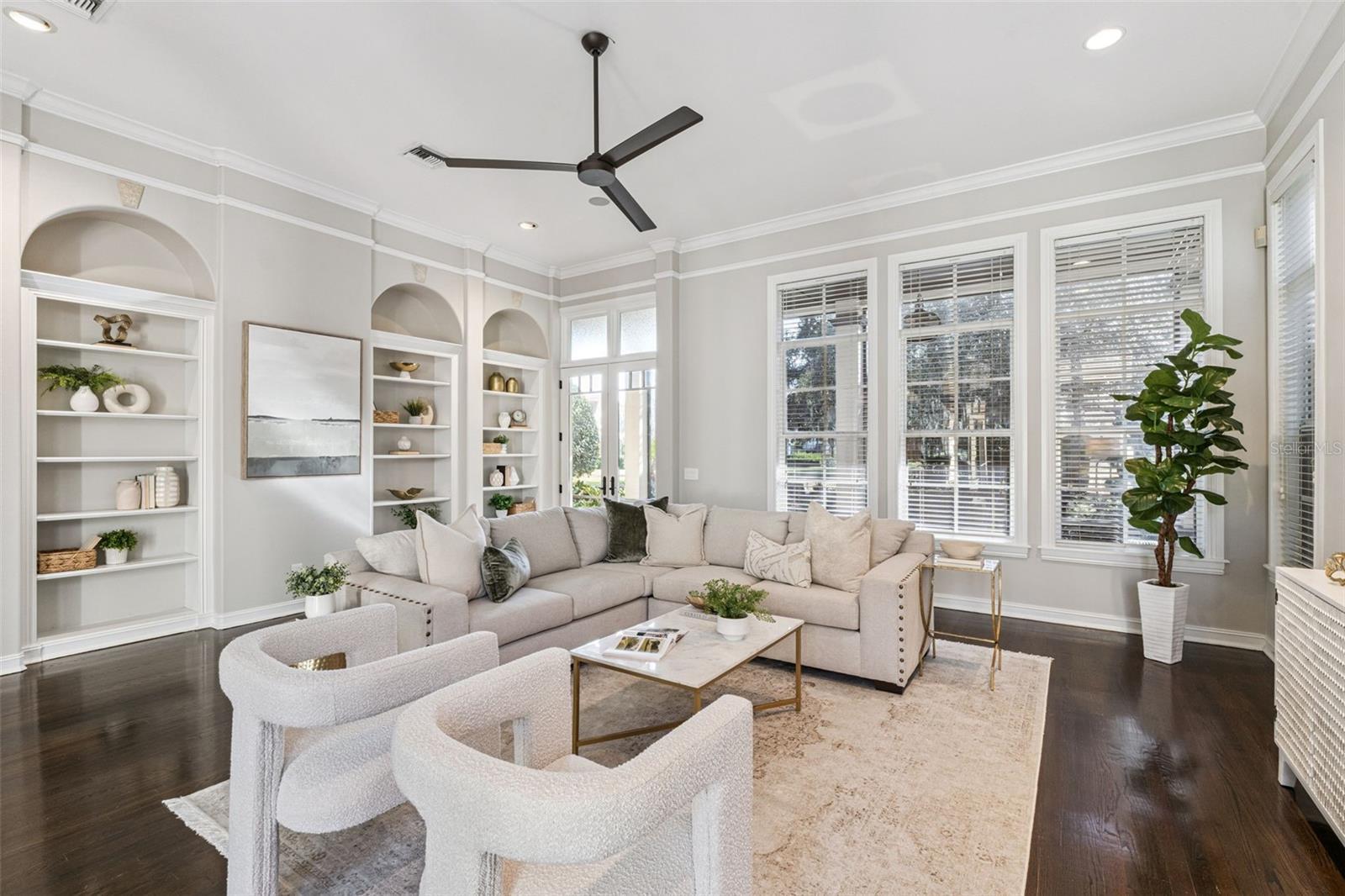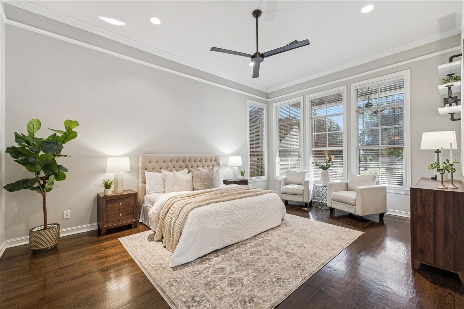 - Built-in Features, Ceiling Fans(s), Crown Molding, High Ceilings, Primary Bedroom Main Floor, Solid Surface Counters, Solid Wood Cabinets, Split Bedroom, Thermostat, Walk-In Closet(s), Wet Bar, Window Treatments