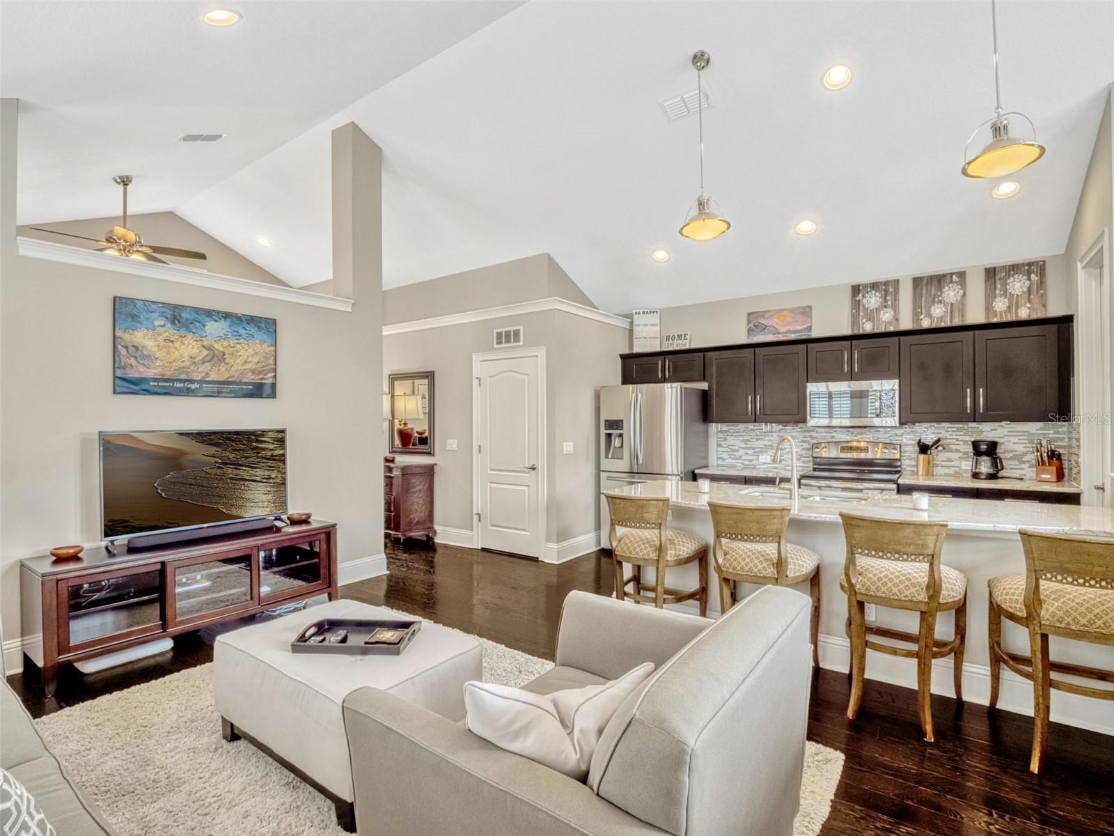 - Ceiling Fans(s), Crown Molding, Eat-in Kitchen, In Wall Pest System, Kitchen/Family Room Combo, Open Floorplan, Primary Bedroom Main Floor, Solid Wood Cabinets, Stone Counters, Walk-In Closet(s)